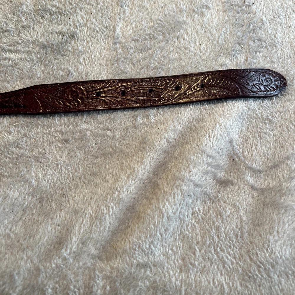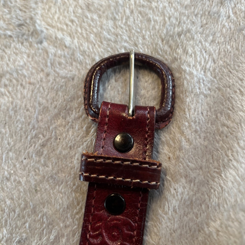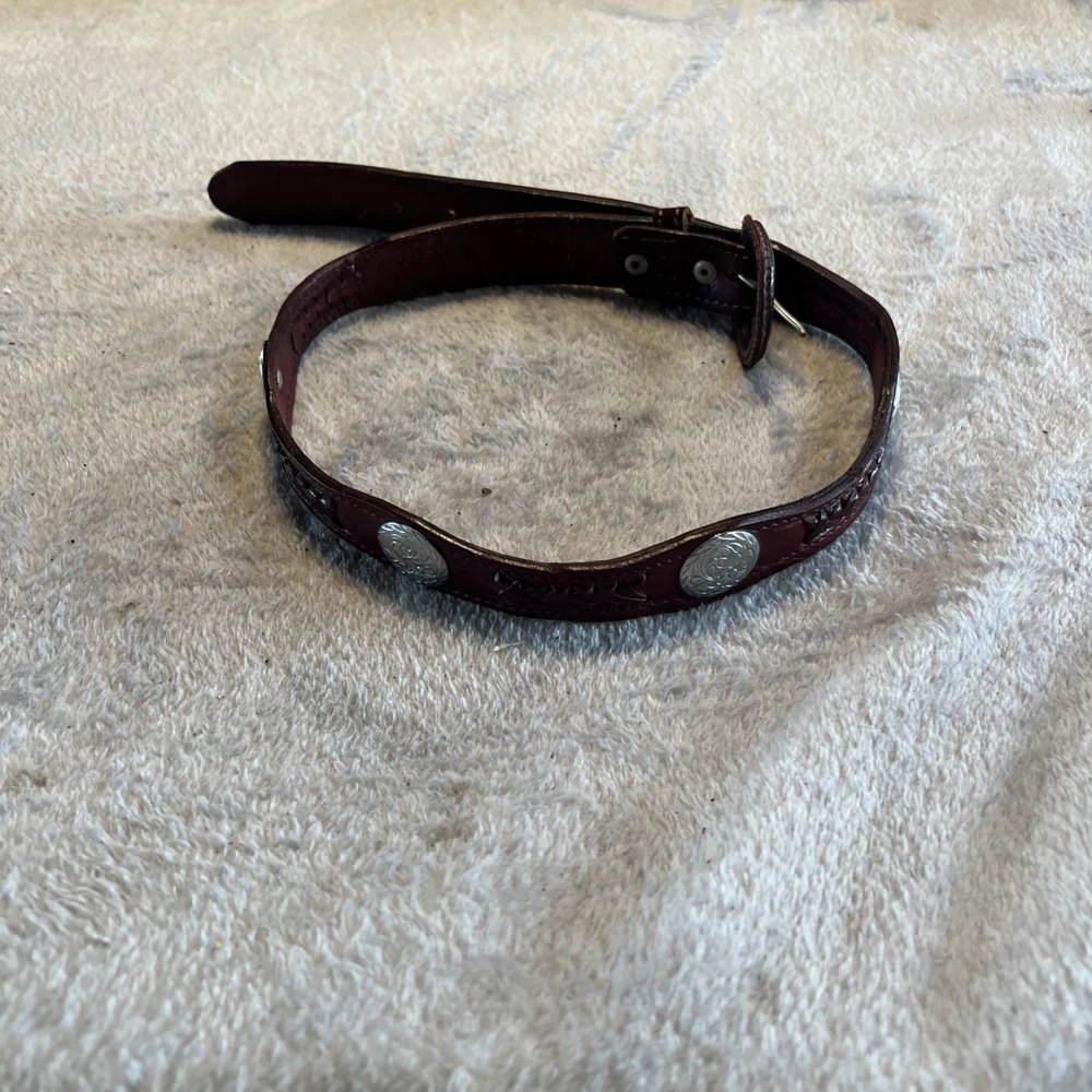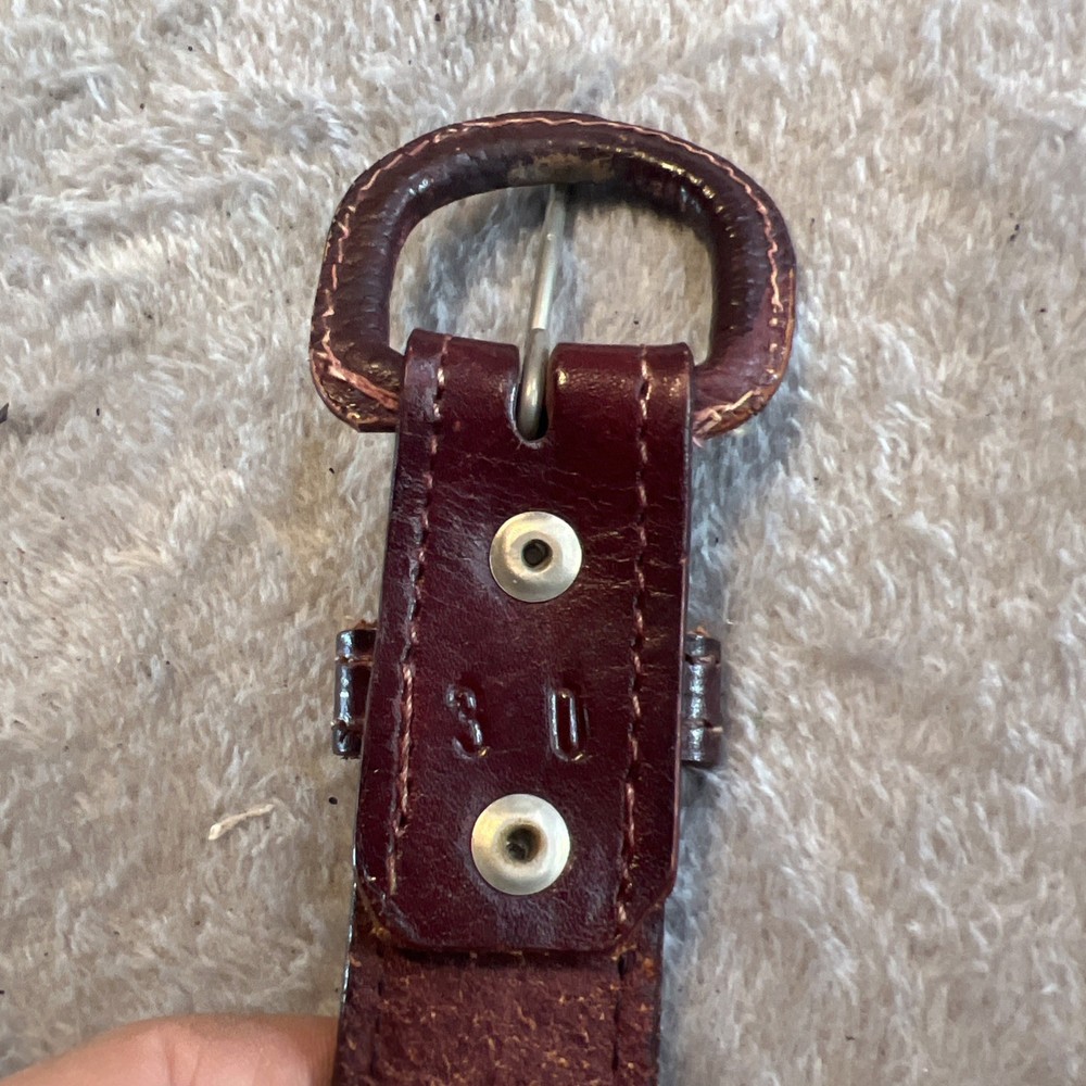 This vintage brown western style belt with conchos in size 30 is made of leather with studded accents, giving it a unique and stylish look. The 1-inch belt width and western-themed hardware make it a classic piece for both men and women. Perfect for adding a touch of cowboy flair to any outfit, this belt is a timeless accessory for those who appreciate vintage American style.