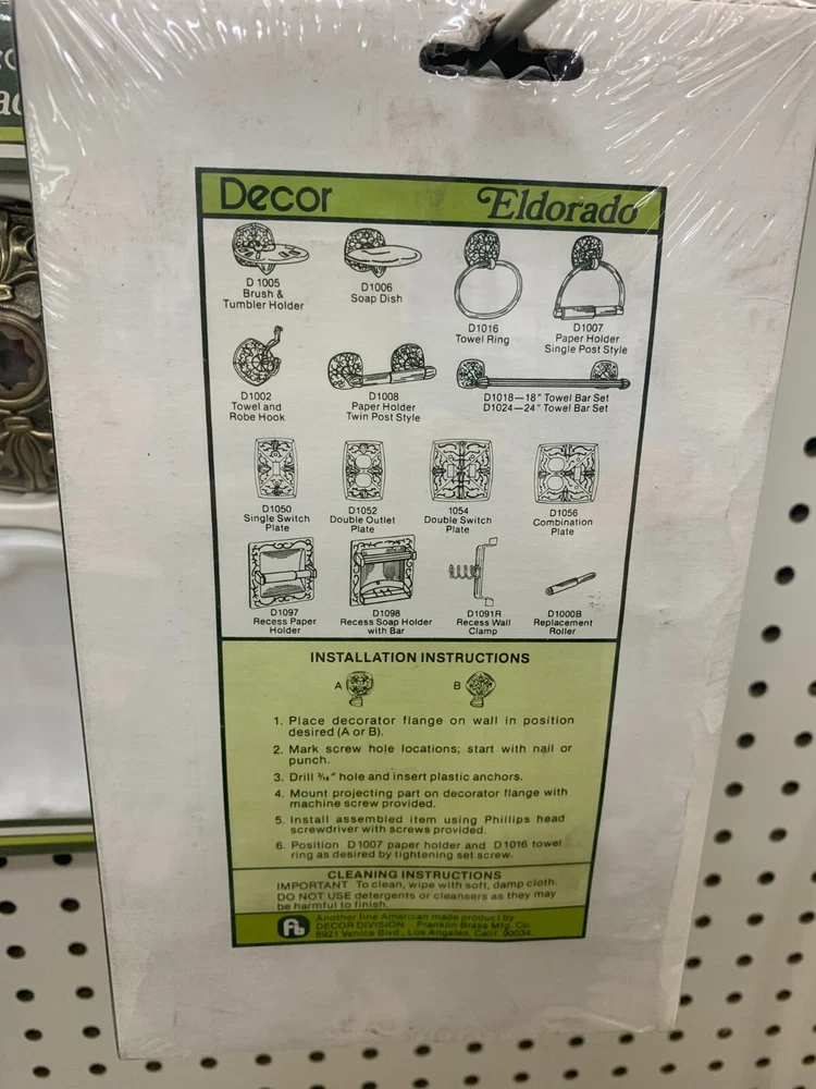 Eldorado Brush & Tumbler Holder Antique Brass Finish Rare--Vintage This vintage new Eldorado Brush & Tumbler Holder is truely a rare find! You won't find this at any local store. This set is NEW from the mid-'80s and MADE IN THE USA. It comes from my family's hardware store that was closed approximately 1985. The inventory is just now being sold. Packaging may have slight shelf wear and some dust but the Brush & Tumbler Holder is in ideal condition. This is a rare find! They just don't make things like they used to. This is your chance to get a piece of the quality of the past. Thank You For Looking At Our Eldorado Brush & Tumbler Holder!