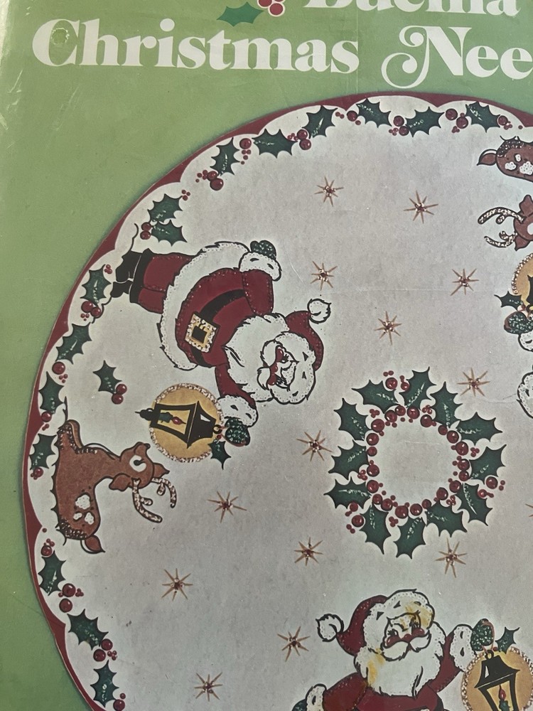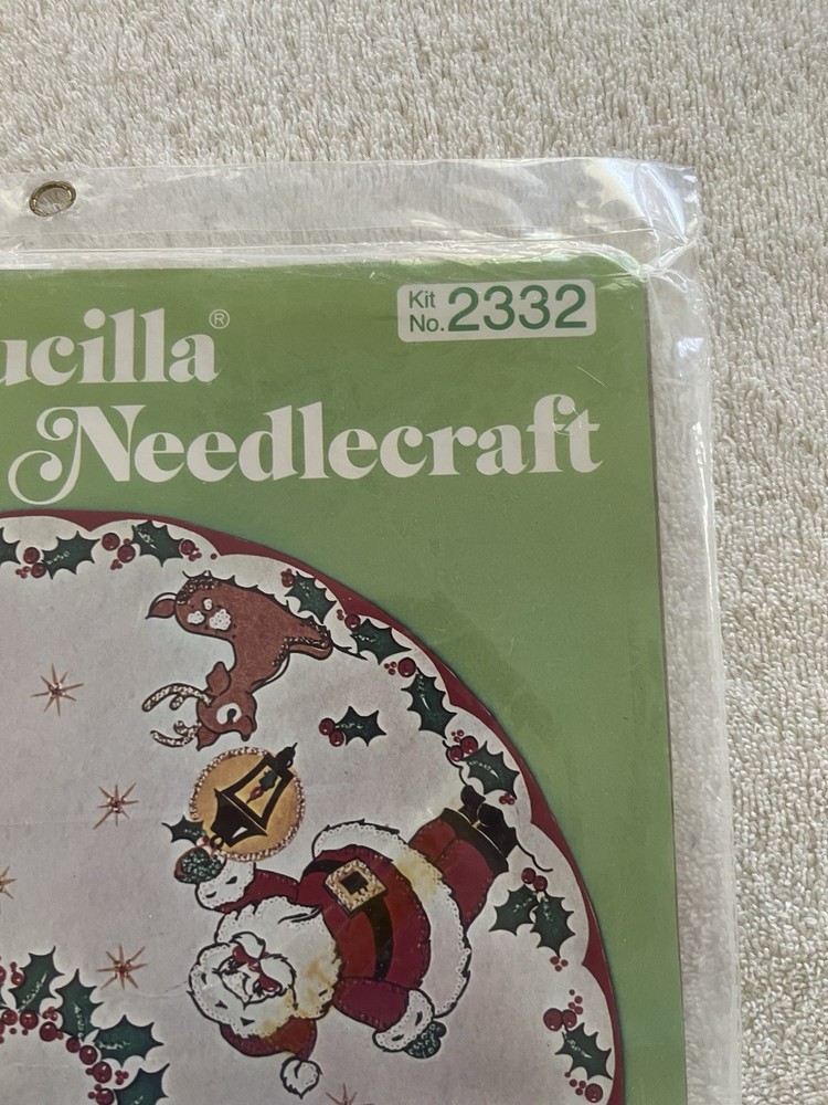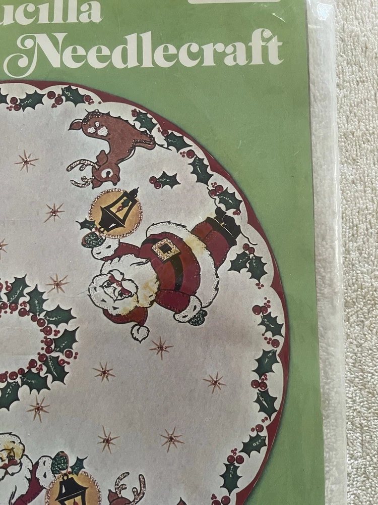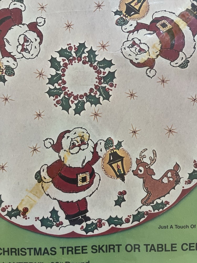 Vintage Bucilla Christmas Needlecraft “Jeweled” Christmas Tree Skirt or Table Center “Santa’s Lantern” 38 inches round. Kit is in perfect, unopened condition. There is no fading or tears, just a beautiful scene with Santa and a Reindeer painted on Nylocraft. Only requires a few well placed beads. Nylocraft is proprietary to Bucilla and is really fun to work with. Great kit for Bucilla collectors, too. The colors make this a real standout decoration. Please see photos. Pet and smoke free home. No returns accepted.