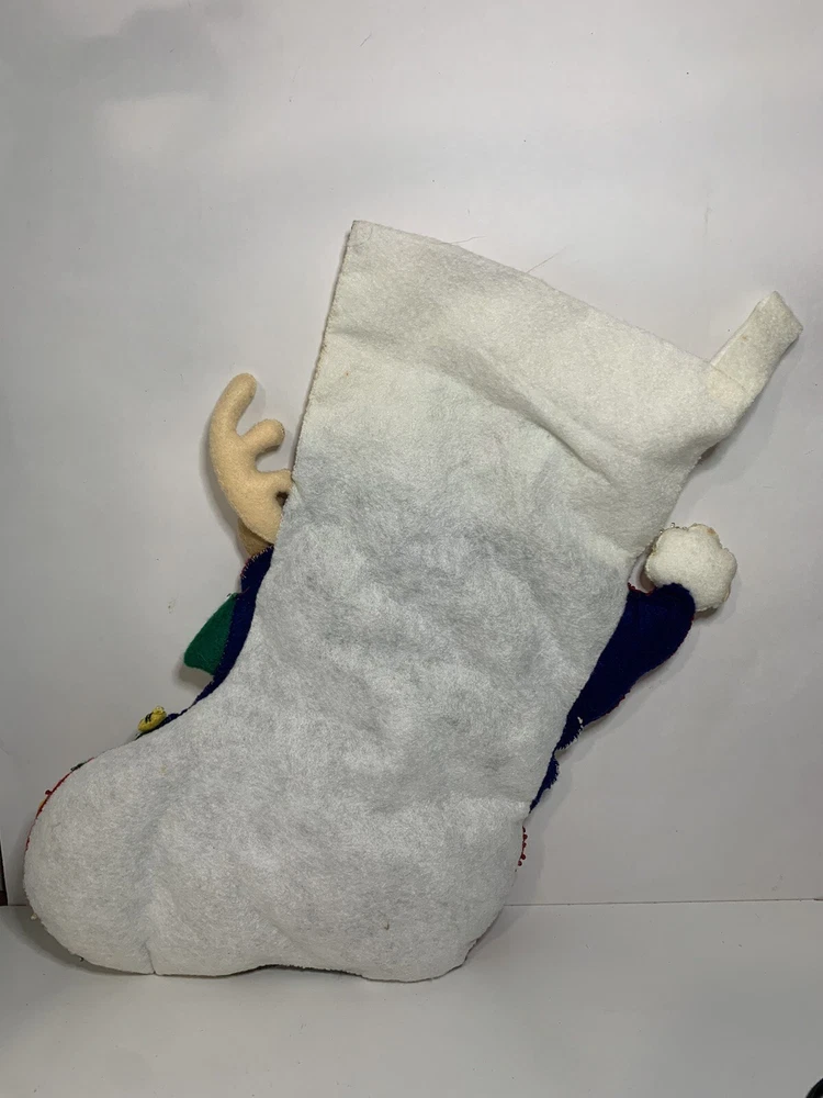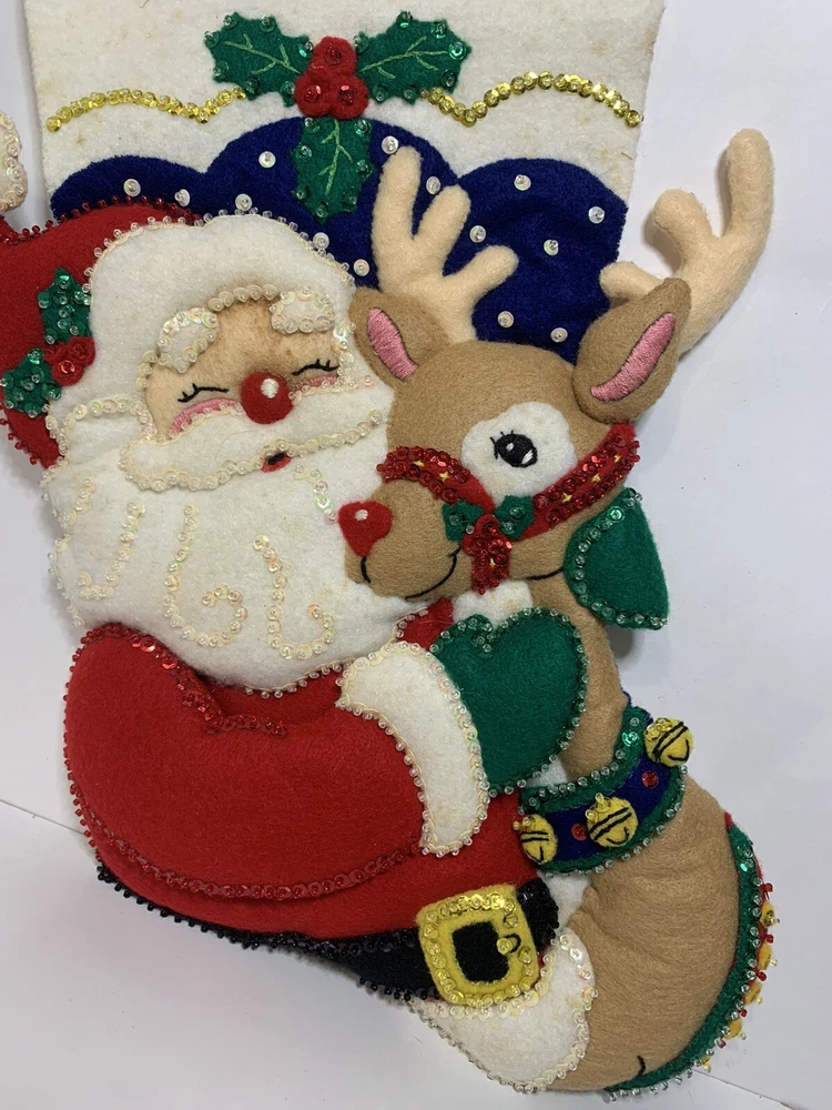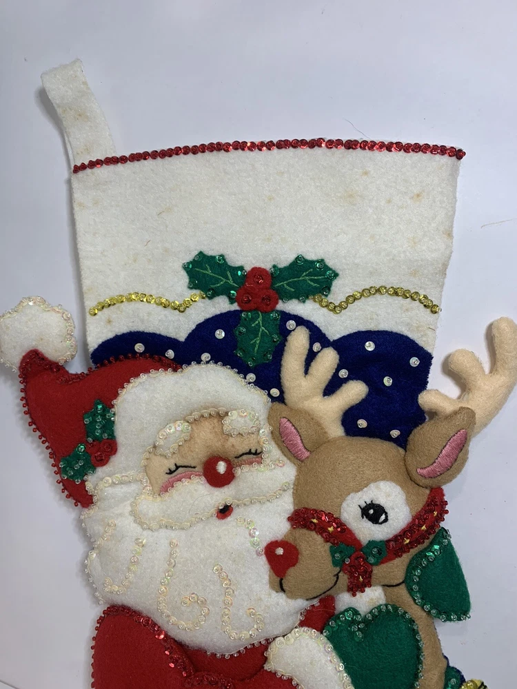 New Vintage Bucilla Bedazzled Santa and Rudolph Christmas Stocking // Has minor stains from storage