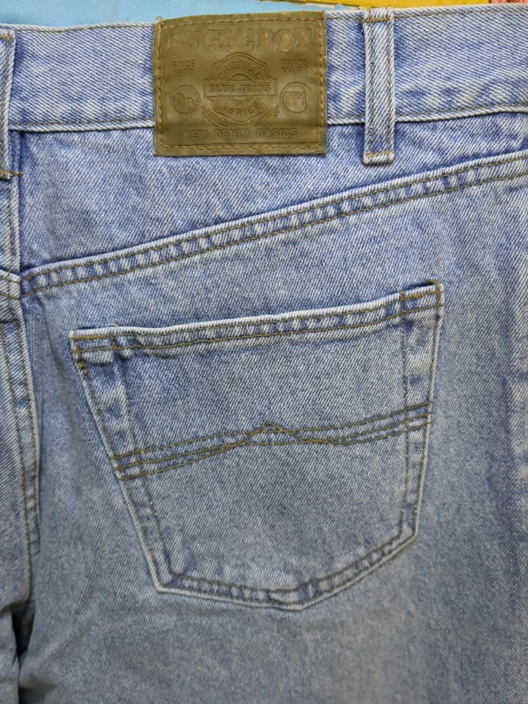 Elevate your denim game with these vintage Bugle Boy jeans in a light wash. The classic fit and wide-leg style make them perfect for any occasion, while the 34-inch waist size and 32-inch inseam ensure a comfortable fit for men. The fabric is made of high-quality denim and features a grunge-inspired 90s hip hop theme, making them a must-have for any fashion-forward individual. These jeans are perfect for those looking for a unique addition to their wardrobe and are sure to turn heads.
