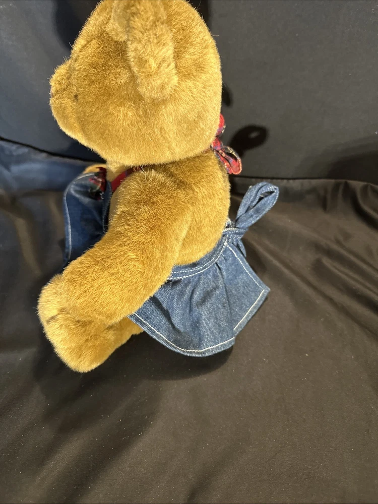 This vintage Build-A-Bear Workshop plush bear is a must-have for any collector or fan of the popular franchise. Measuring at 11-12 inches in height and made of soft, plush material, this bear is perfect for all occasions. It features a denim jumper, brown eye color, and a friendly expression that will melt anyone's heart. This licensed reproduction bear was manufactured in the United States in 1997, making it a true gem from the 1990s. It is a single unit, and unfortunately, it is not signed. But don't let that stop you from adding it to your collection! This rare and retired bear is perfect for display or cuddling.
