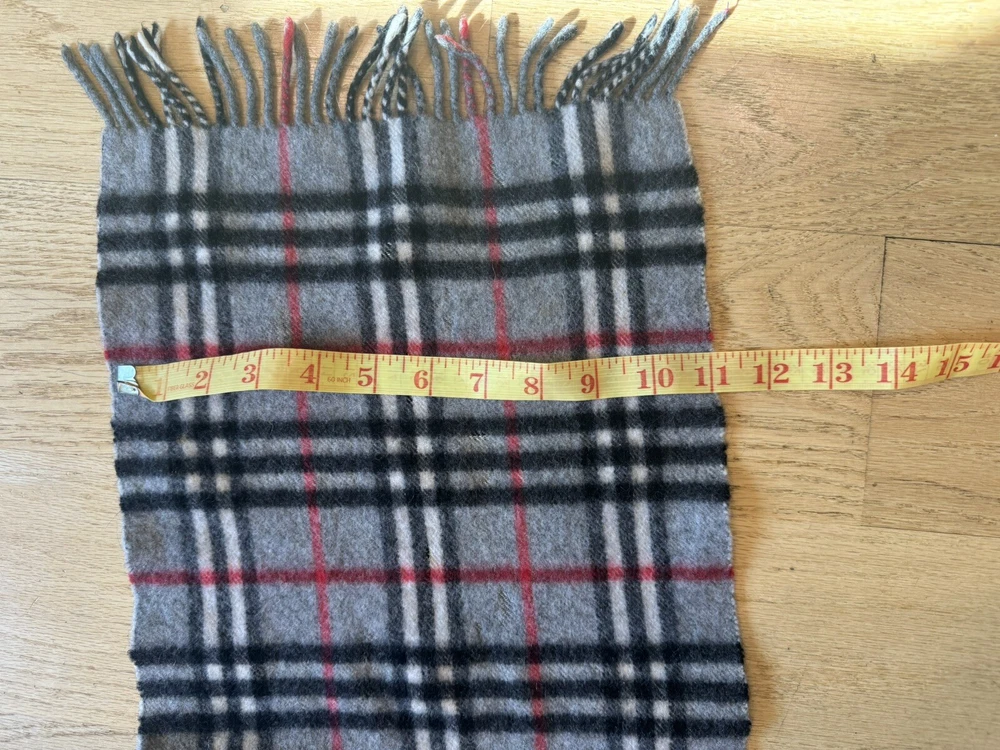 Features: Multifunctional, Neck Warmer Color: Gray Style: Rectangle Scarf Material: Cashmere Personalize: No Pattern: Check Fabric Type: Knit Vintage: No Character: Nova Handmade: No Country/Region of Manufacture: United Kingdom Garment Care: Dry Clean Only Brand: Burberry Season: Fall, Spring, Summer, Winter Department: Unisex Accents: Fringe, Logo, Tasseled Type: Scarf Theme: 90s, Logo, London