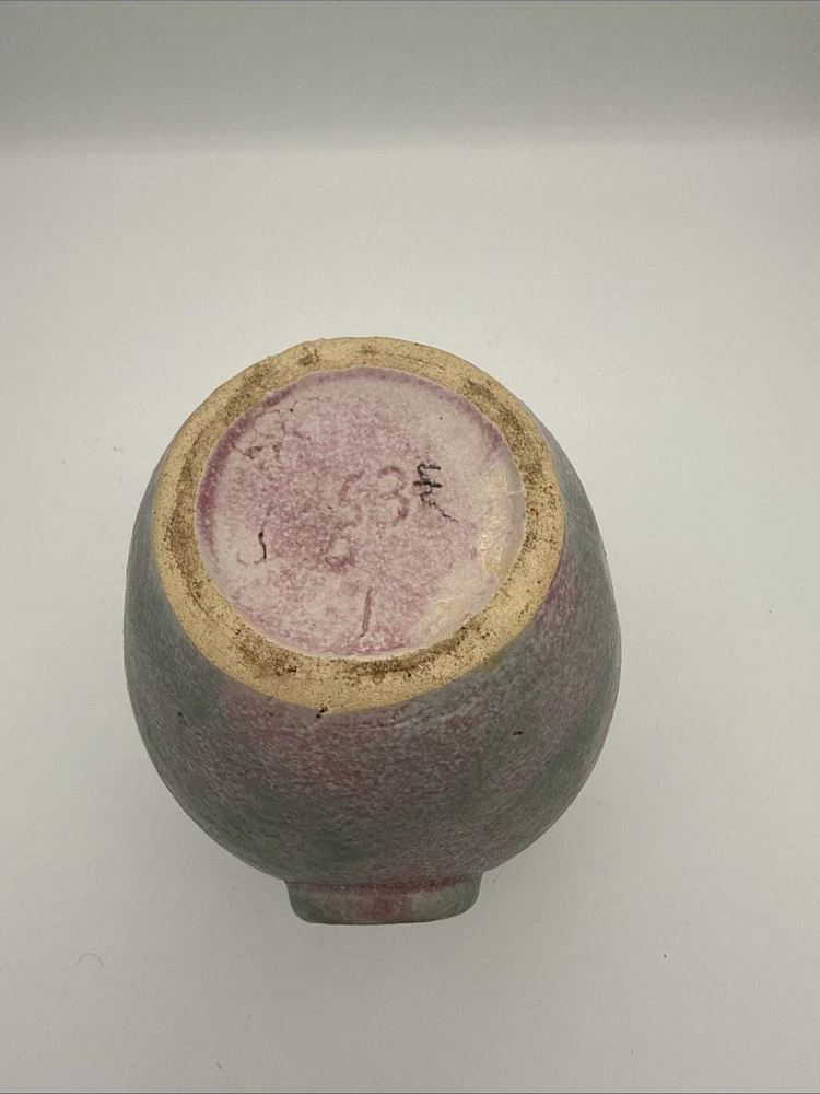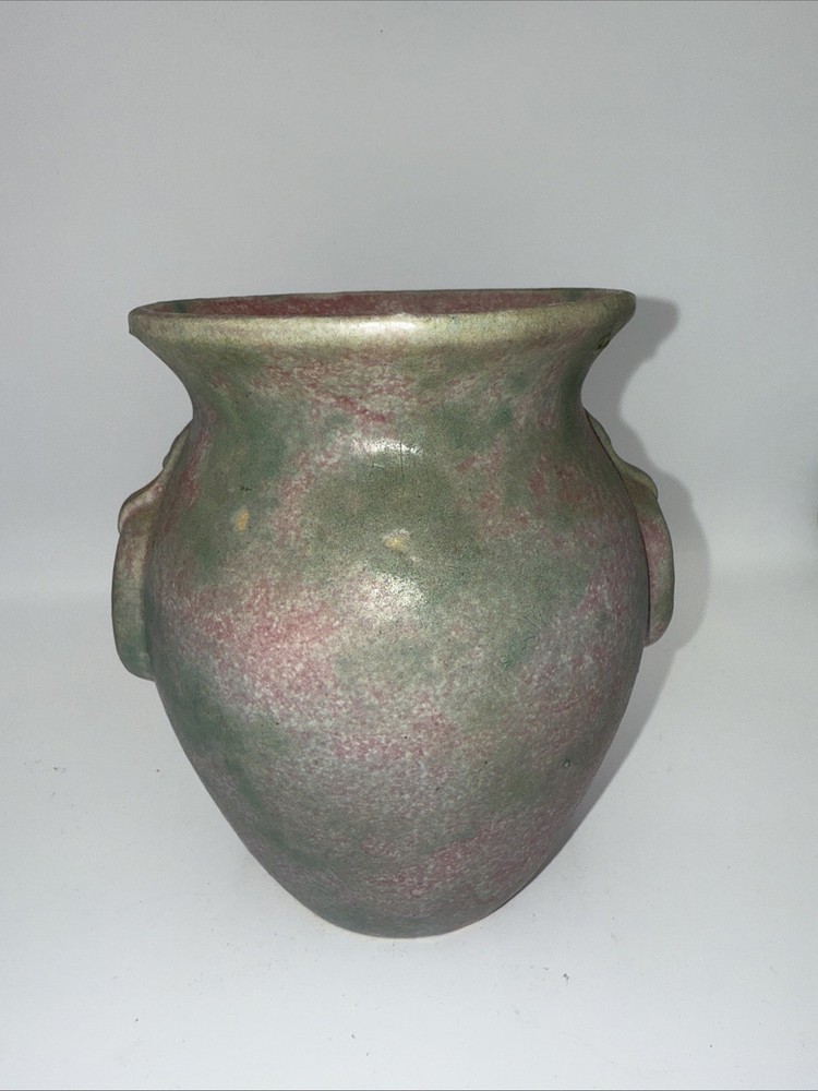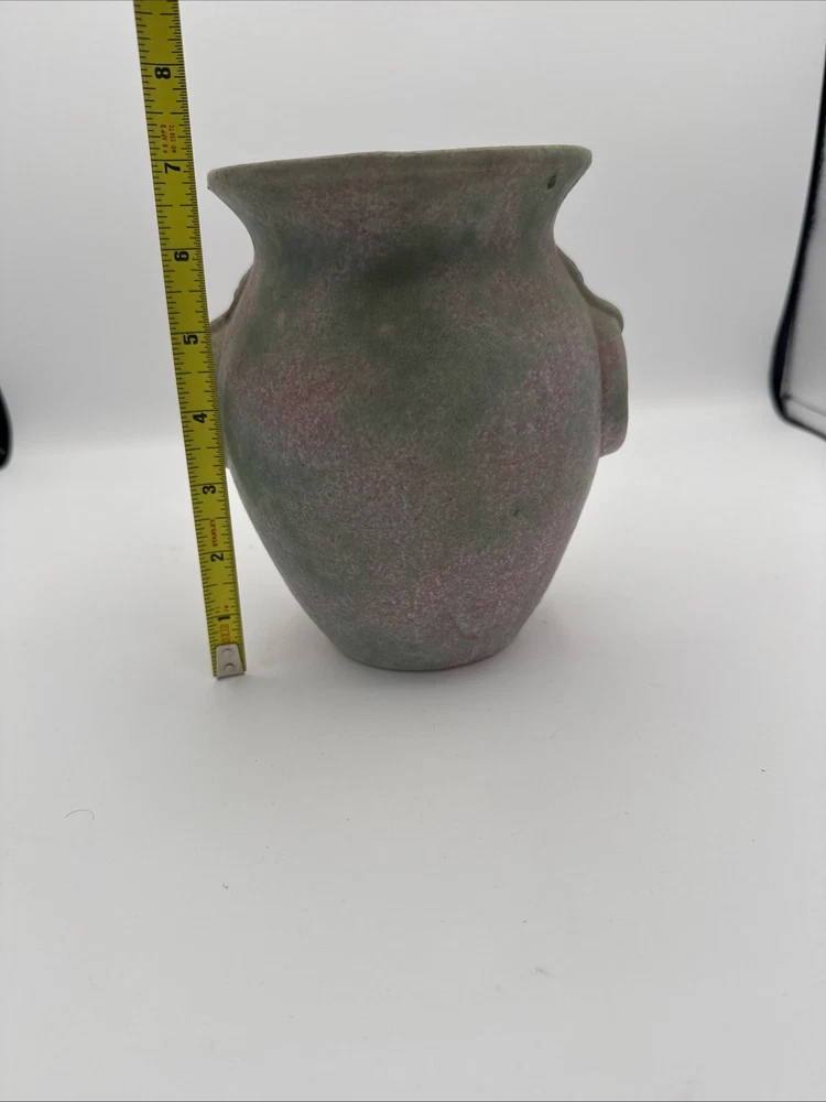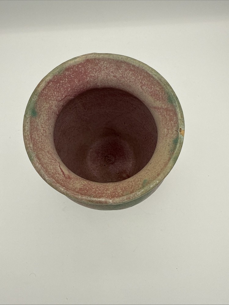 The product is a 6 3/4" Burley Winter #53 Arts and Crafts pottery vase with rings, featuring a pink and green color scheme. This vintage piece from the early 20th century is an original example of Arts & Crafts/Mission style pottery. The vase is made of clay using pottery techniques and bears an impressed backstamp, making it a unique and collectible item for those interested in decorative pottery and glassware from the Arts & Crafts era. Almost 7”- see photos for measurements. * please note a small older paint chip on rim