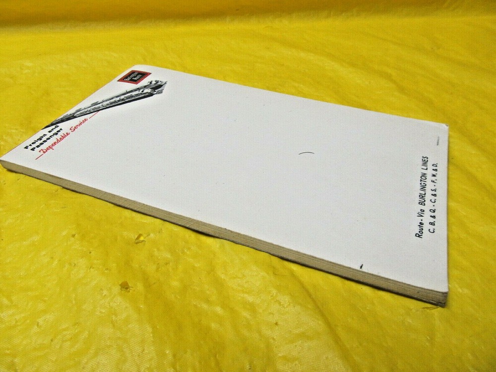 Minnesota's Largest Buyer of Classic Trains & Toys Now At Auction: Vintage Burlington Route Notepad Here is a clean Vintage Railroad Notepad from Steve's Train City in Minnesota. We purchased memorabilia from a smoke free collector home. This one is from the Burlington Route. It is a pad of unused paper not just a sheet as in some auctions. Look at the quality in the pictures and consider it this week. We are listing it reasonable and without a reserve. Shipping: Shipping for this auction is $3.75. We ship to all locations in the United States (we do not ship international). We strive for the fastest shipping possible - usually we will ship within 2 business days of payment. We offer Shipping Discounts on multiple purchases. Payment: Payment by PayPal is preferred. Payment must be made within 3 Days of Auction End. Mail address is Steve's Train City - 1013 Mainstreet - Hopkins MN 55343 Good Luck and Happy Bidding! Thanks for looking and please check out our other auctions. Check out my other items ! Steve and Patrick