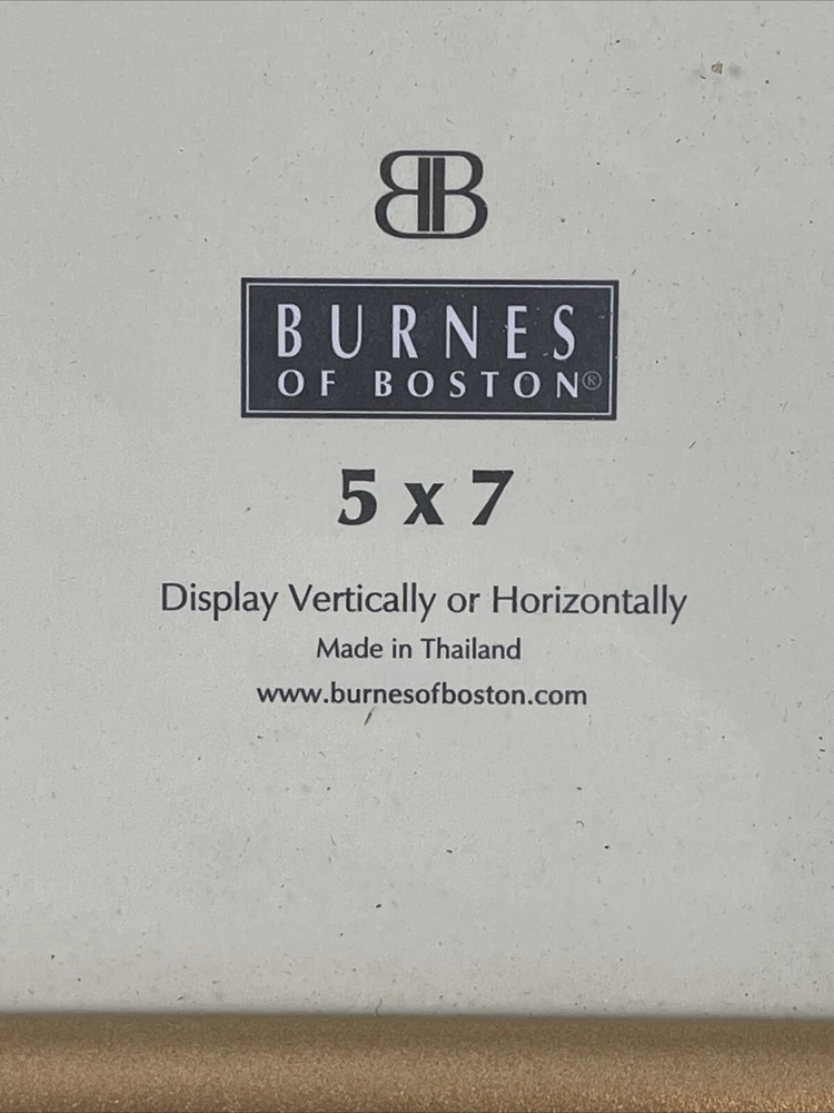 Vintage Burnes of Boston gold floral picture frame with a 5x7 inch photo capacity. This art deco style frame features a floral design, rectangular shape, and is freestanding. Made in Thailand, it has dimensions of 5 inches in length, 8 inches in height, and 7 inches in width.
