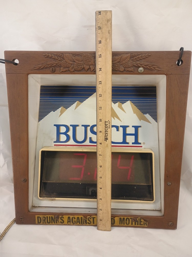 The product is a vintage Busch Beer Anheuser-Busch digital clock bar sign. This clock features a theme of Breweriana, making it a unique and collectible item for beer enthusiasts. Its design and branding make it a recognizable and nostalgic piece for those who appreciate vintage beer memorabilia. This clock needs some love the clock does work and iluminate, but when you use the buttons to change the time it jumps several minutes at a time making it hard to get set to the correct time, the cord has also been repaired with duct tape and would be suggested that it is replaced before putting the clock into use. This is also a vintage bar sign so it has been smoked around and would need a good cleaning to being it back to its glory . I am selling this item AS IS . Thank you for visiting my listing today and thank you for your interest in this item! My goal is to have a pleasant transaction resulting in a satisfied customer. I hope any transaction between us leaves you with a feeling of confidence knowing you can trust me and the items I offer here. *Most if not all my listings are set to accept offers. Feel free to send an offer and I will be happy to consider it!! *Please contact me with any questions or concerns and I will be happy to help. *Always examine the photos carefully, and if in doubt, email me with any questions you may have. *Please note that condition statements are offered as a guide only. They will always be somewhat subjective and reflect our opinion, which may not necessarily agree with someone else's opinion. PLEASE READ: I aim to please and I want my buyers to have a positive transaction with me. If you have questions, concerns, or special requests related to any of my items I hope you will contact me so we can work them out to your satisfaction. I sell my items to give you a great item at a decent price while making a little profit at the same time. If you feel the item you are interested in is too pricey do not hesitate to send me a fair offer and I will consider it. My goal is to satisfy your needs and mine so both parties can benefit. SHIPPING: If you prefer a different shipping method or company please contact me and I will do all I can to make that happen. If you have concerns or requests about the packaging of your item contact me and I will do all I can to accommodate them. Shipping costs are based on location in each state or country, the costs always differ. After I have received your payment I will ship your item out within 3 business days or less excluding weekends and holidays. BEFORE PURCHASING & BIDDING: **Please see all the pictures. I do not have great photography skills but I try to get the most accurate photos I can. If you are unsure about something you see in a photo contact me so I can do what I am able to answer your concern about the item. **I cannot stress enough that if you have any questions or concerns please contact me before purchasing and bidding. Communication can solve so much. **As a customer myself, I understand the meaning of customer satisfaction and my goal is to have nothing but satisfied customers. If you are not unsatisfied with your purchase I ask that you please contact me so I can take care of your issue. My goal is for you to be 100% satisfied. INTERNATIONAL BUYERS WELCOMED - PLEASE NOTE: I welcome International buyers! Please be aware that any custom/duties/taxes that the parcel might incur once it is out of the USA are the responsibility of the buyer. Please check with your country's customs office to determine what these additional costs will be prior to bidding or buying. Please refer to the eBay Site Map for more information if needed.