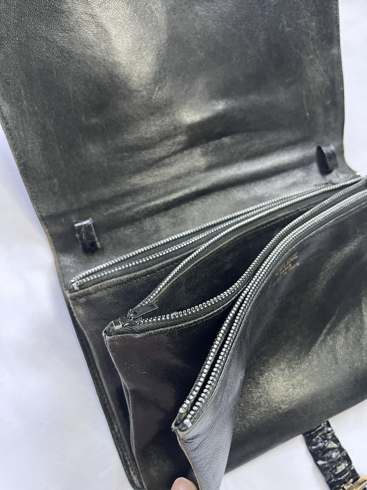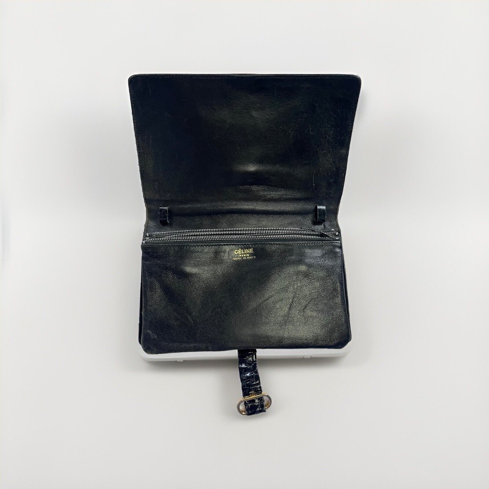 This Céline Handbag is a vintage piece that exudes elegance and style. Crafted from high-quality leather, this rectangular-shaped bag features a buckle closure and accents that add a touch of sophistication. The black exterior is complemented by the silver hardware, giving it a classic designer look. Measuring 6 inches in width, 5 inches in height, and 2 inches in depth, this medium-sized bag is perfect for any occasion, whether it be for travel, weddings, parties, or business. The coated finish and fleece fabric type make it a durable and reliable choice. With pockets for added convenience, this Céline Handbag is a must-have for any fashion-forward woman.