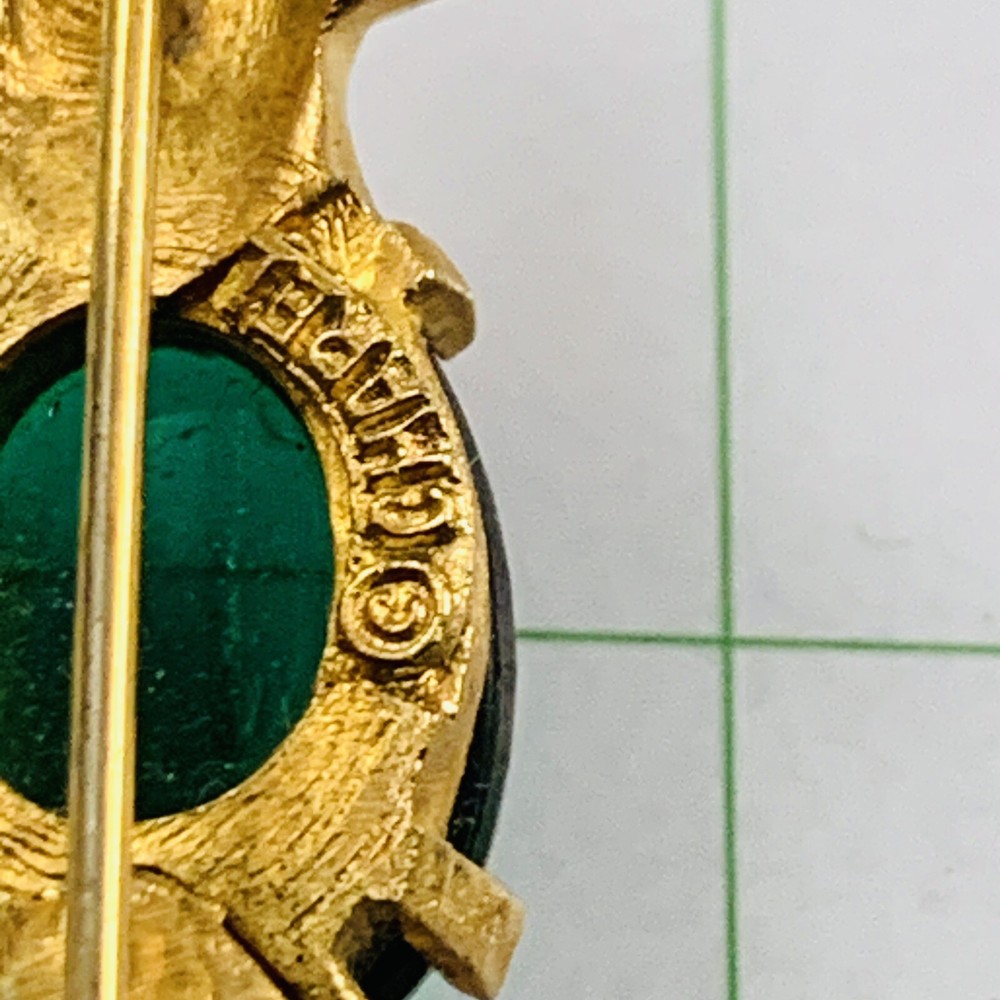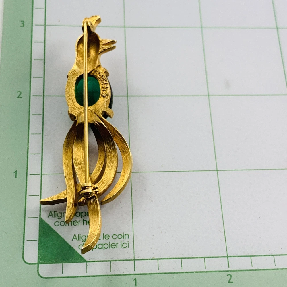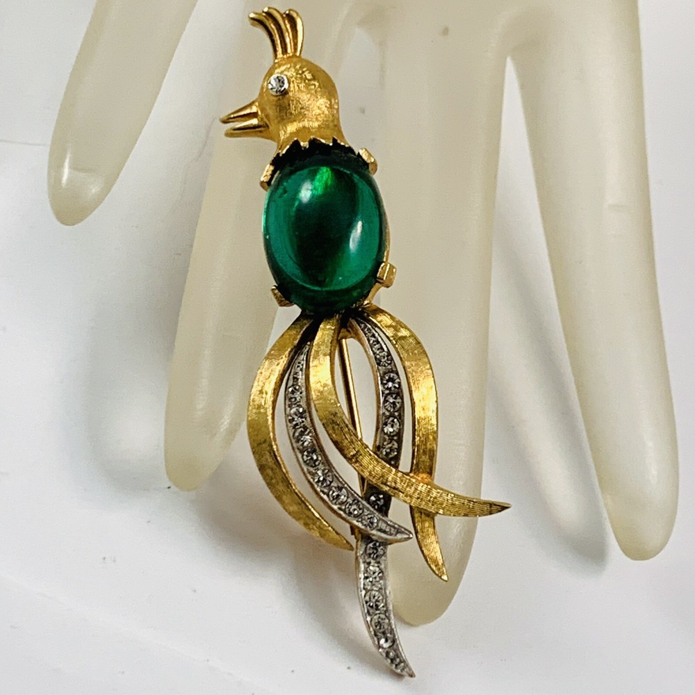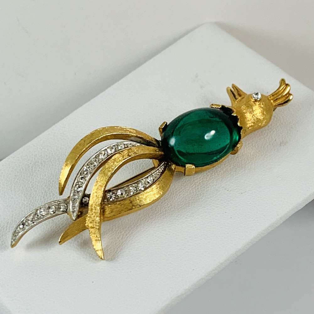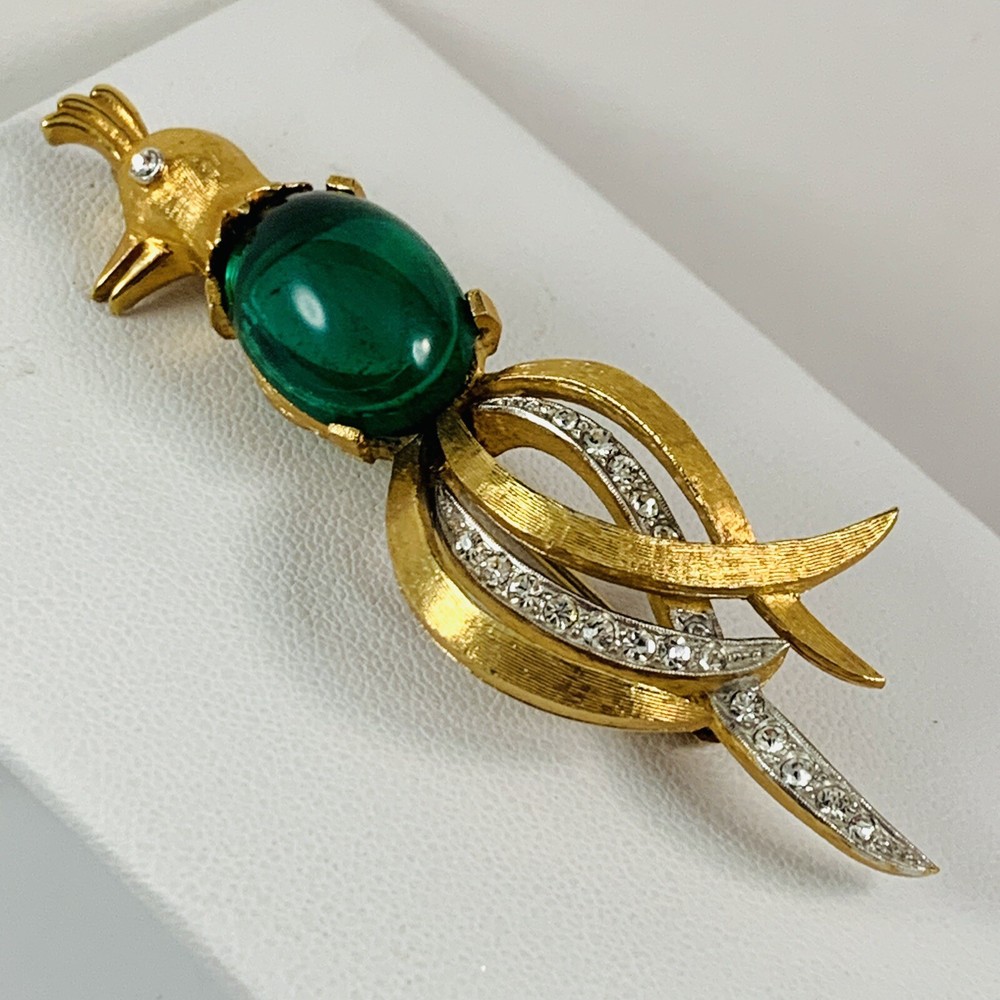 Vintage CHAREL Signed Green Glass Jelly Belly Bird of Paradise Rhinestone Brooch. Pre-Owned Estate Jewelry in Very Good Condition. Ready to wear, give as gift or add to a collection. Our Vintage items are mostly from estate sales and vary in age from 100+ years old to more modern pieces. Please use your judgement. Items are photographed on a measuring matte with one-inch squares to give you an idea of size. Any photography props / holders you see are not included.
