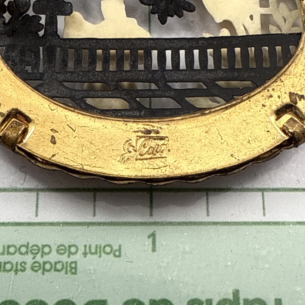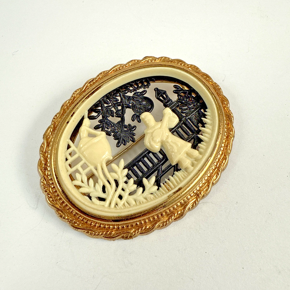 Vintage CORO Pegasus Hallmark Romeo & Juliet Celluloid Oval Gold Tone Brooch. Pre-Owned Estate Jewelry in Very Good Condition. Ready to wear, give as gift or add to a collection. Our Vintage items are mostly from estate sales and vary in age from 100+ years old to more modern pieces. Please use your judgement. Items are photographed on a measuring matte with one-inch squares to give you an idea of size. Any photography props / holders you see are not included.