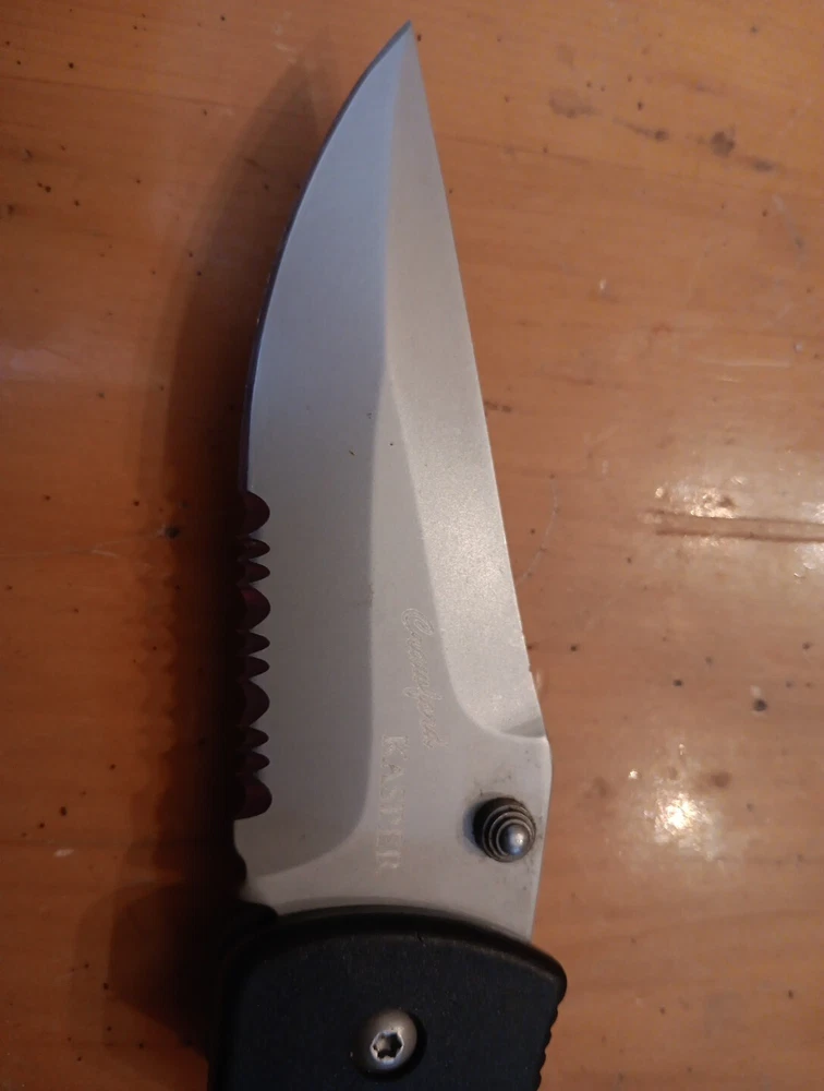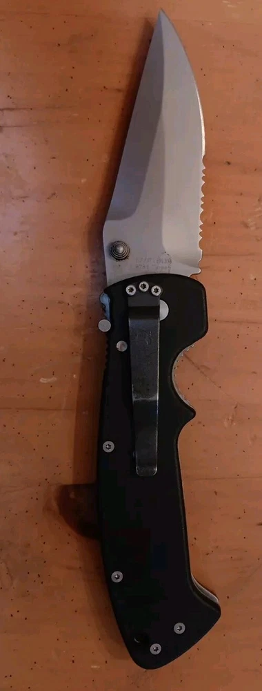 VTG TAIWAN COLUMBIA RIVER CRKT CRAWFORD KASPER LARGE FOLDING POCKET KNIFE. This is the large version 6783 that was made in Taiwan. This feature packed tactical knife, designed by writer and knife use instructor Bob Kasper and knife maker Pat Crawford, is a serious self-defense folder built to satisfy under the most serious situations. Thick stainless liners covered with black Zytel® scales give this knife a very hefty feel. A thumb scallop on each side leads to the thumb stud for easier opening and more secure grip. An integral part of this tactical folder is the patented Lake & Walker Safety (LAWKS). Located at the top front of the knife, the LAWKS mechanism insures that the blade will remain locked under heavy cross stress. The lock is a Walker-Lock secured by the LAWKS safety.