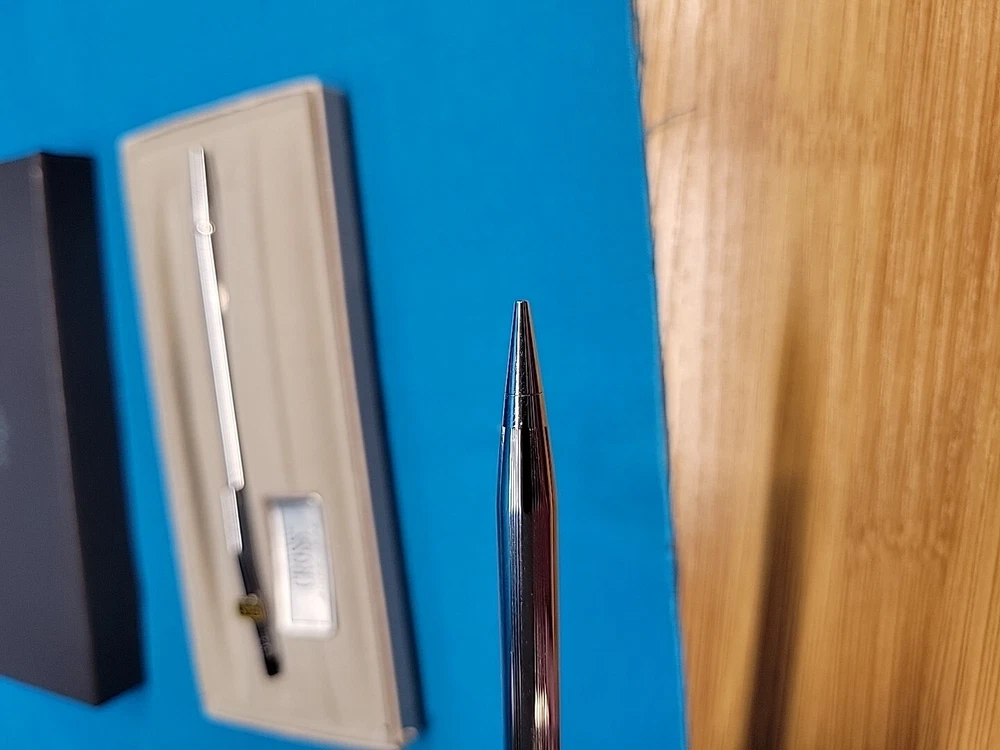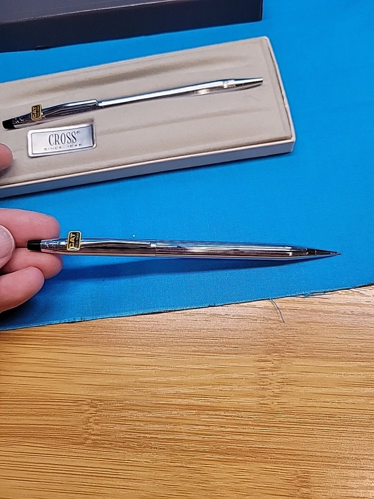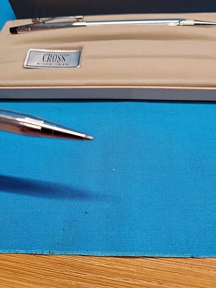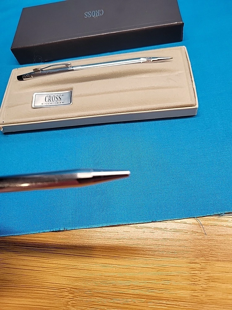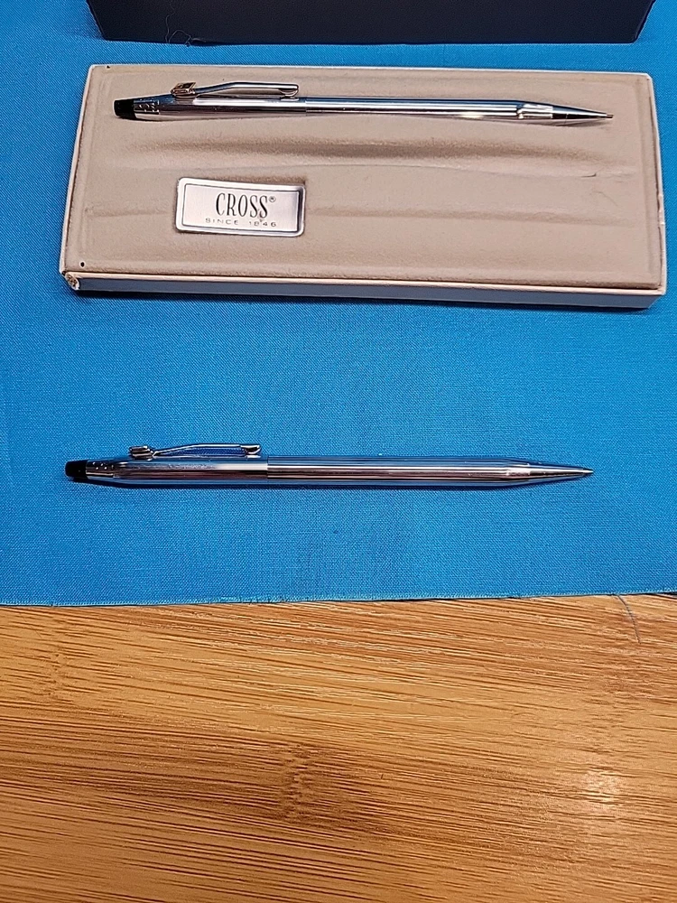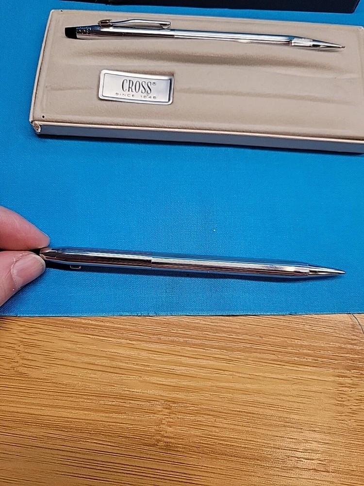 This vintage CROSS Chrome 3501 Pen Pencil Set features a classic design with a sleek black finish. The set includes a pen and pencil, both of which are crafted with high-quality materials. The brand name "Cross" is synonymous with quality, and this set is no exception. The set is perfect for collectors or anyone who appreciates a classic design. It's also a great gift for anyone who loves writing or art. With its timeless design, this set is sure to become a staple in any collection. I believe these are new in box, but since I'm not sure, I listed as used! Please see images for condition details!