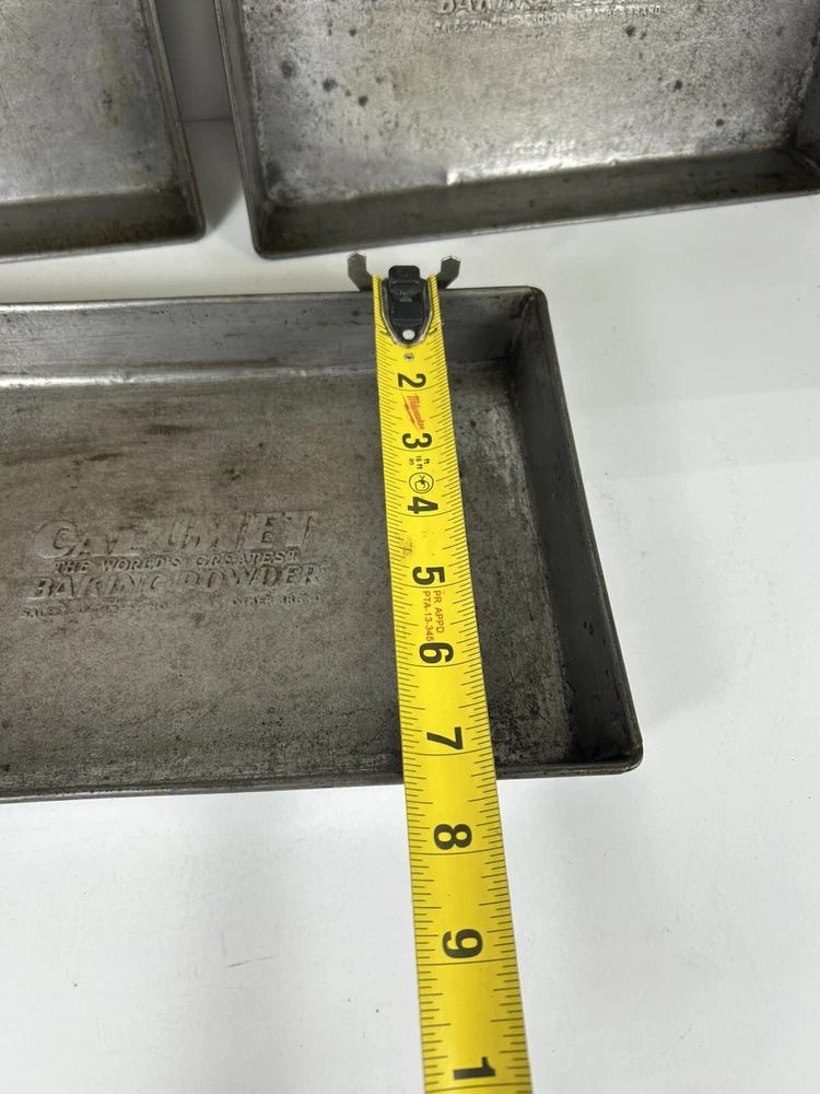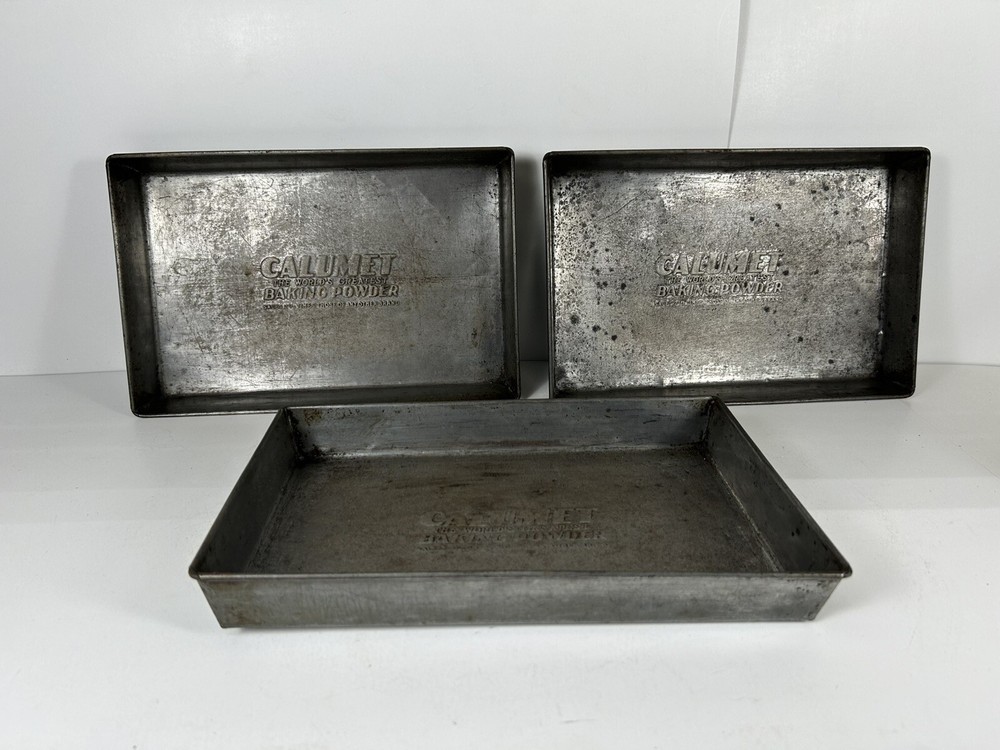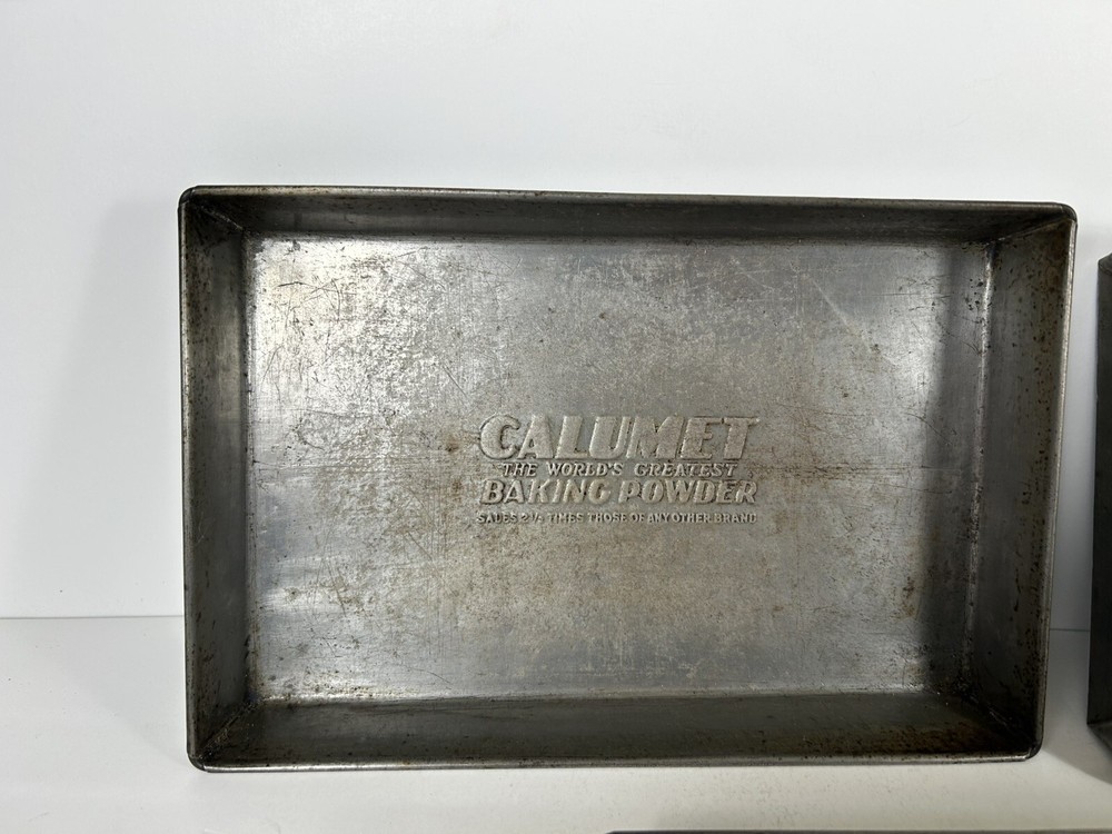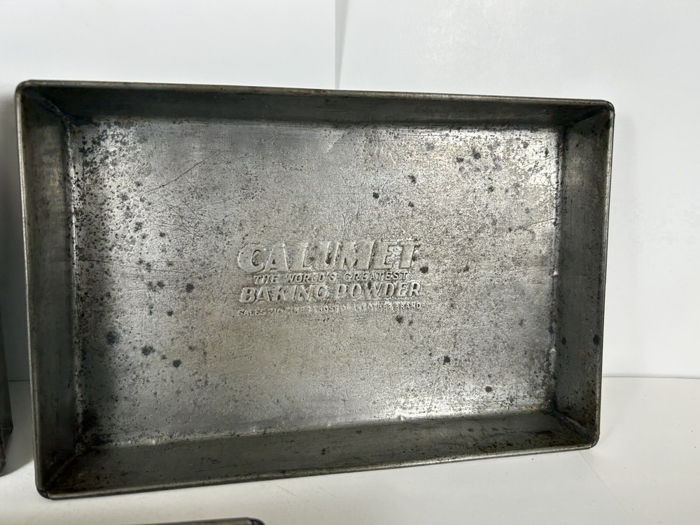The product is a lot of three Calumet Baking Powder Tin Pan Cookie Sheets, each measuring 11x7 inches. These cookie sheets are used for baking and are adorned with advertising for Calumet Baking Powder. They are collectible items that reflect the theme of Bakery & Baking, making them a unique and nostalgic addition to any collection related to baking or vintage advertising. U2-S3-1-25