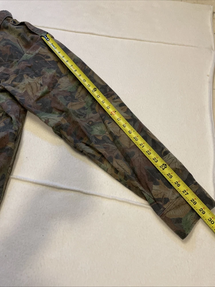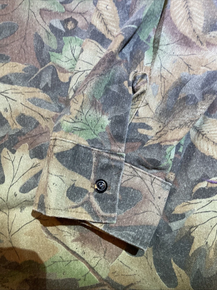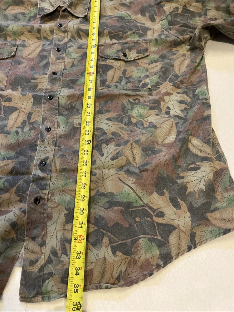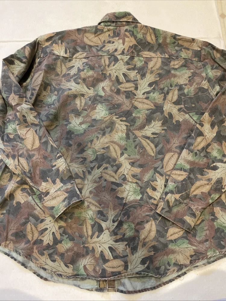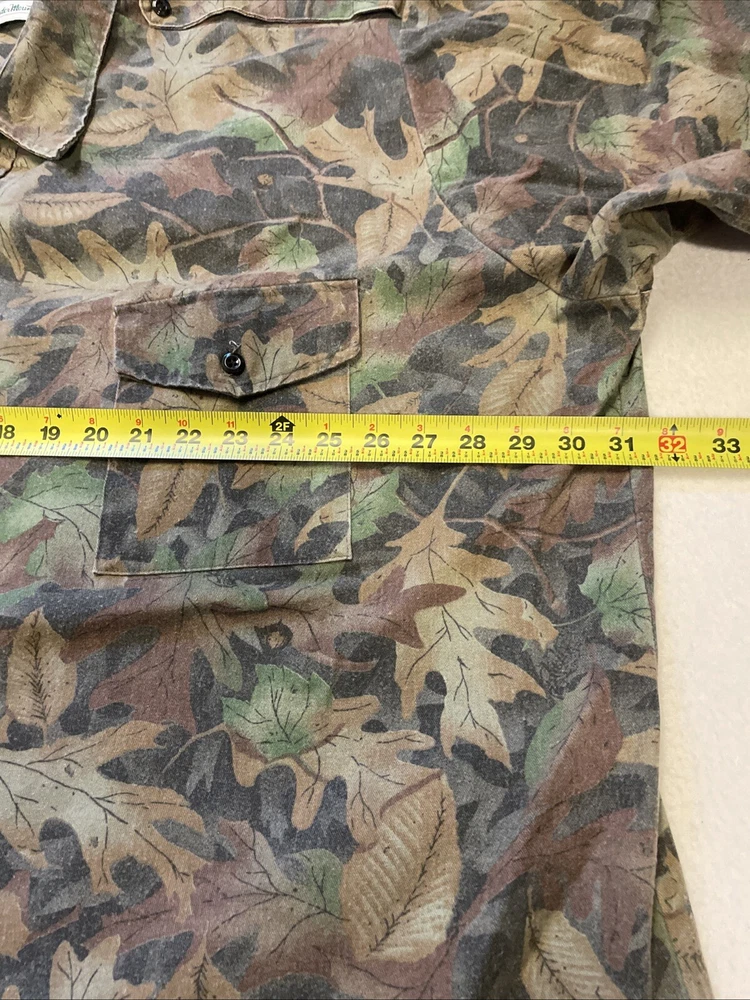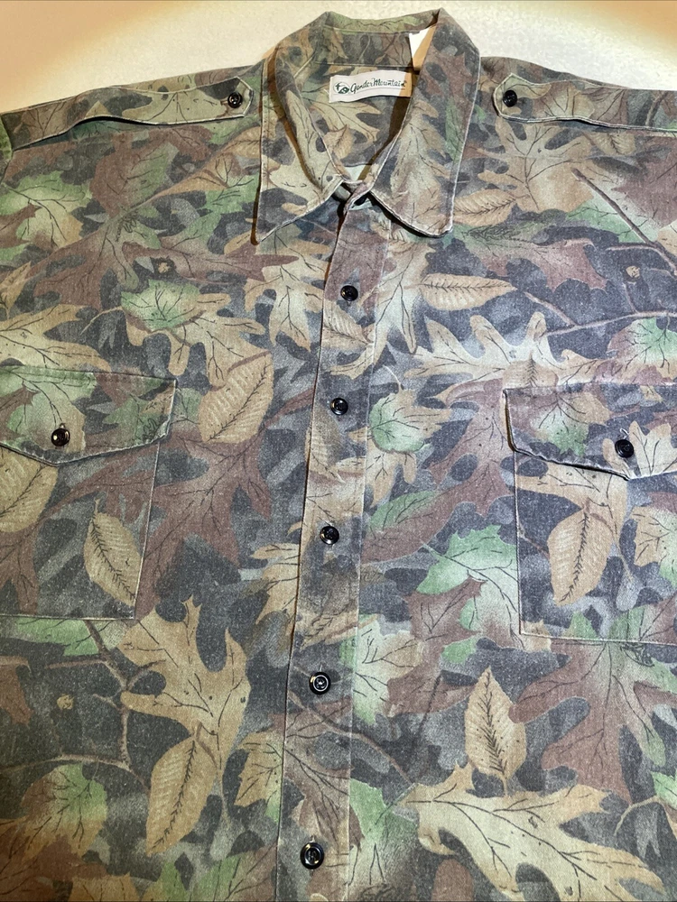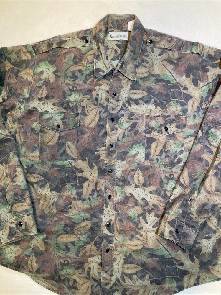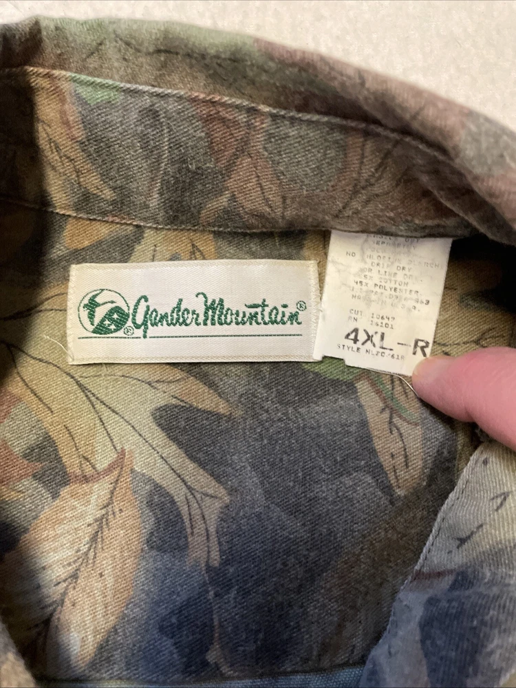 -Used. Sold as is -No rips or stains -See photos for measurements -Fast shipping!!! This vintage Gander Mountain shirt is a great find for hunting enthusiasts. It features a classic woodland camouflage leaf pattern, perfect for blending in with outdoor surroundings. Hunting, camping, streetwear. Made of heavyweight cotton, the shirt is durable and resistant to wrinkles, making it ideal for outdoor adventures.