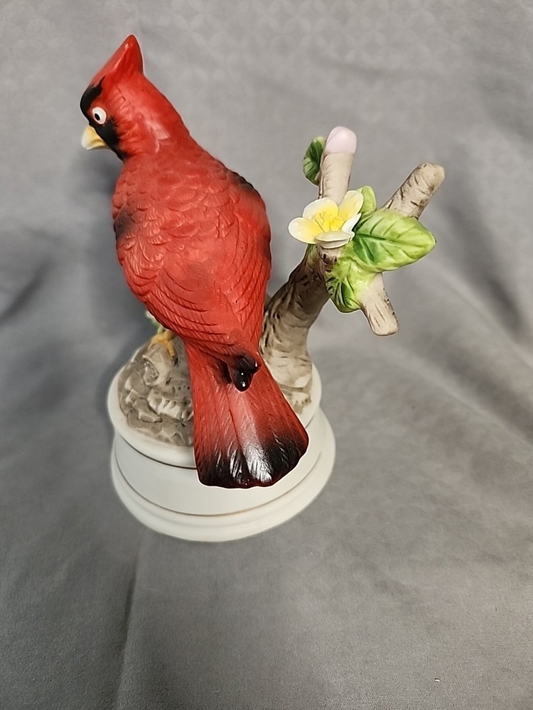 This product is a vintage Cardinal Red Bird statue music box made in Taiwan. It features a charming design of a cardinal bird playing a music box, making it a delightful decorative collectible for any vintage or bird enthusiast's collection. The craftsmanship and attention to detail in the design showcase the quality and uniqueness of this piece, adding a touch of nostalgia and charm to any space it is displayed in.