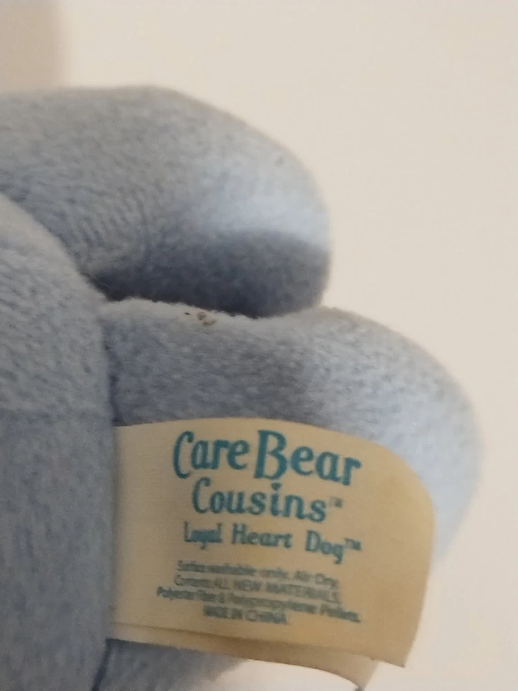 This vintage Care Bears Cousins plush is a 10" blue Loyal Heart Dog from 2004. Part of the Care Bears franchise, this original plush bear is a retired collectible featuring a loyal heart motif. The surface washable toy is in the form of a puppy and is part of the Care Bear Cousins collection, making it a charming addition for fans of the beloved characters.