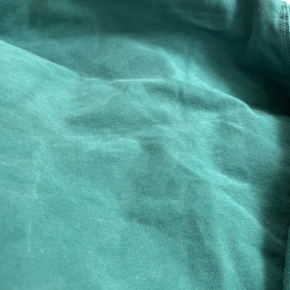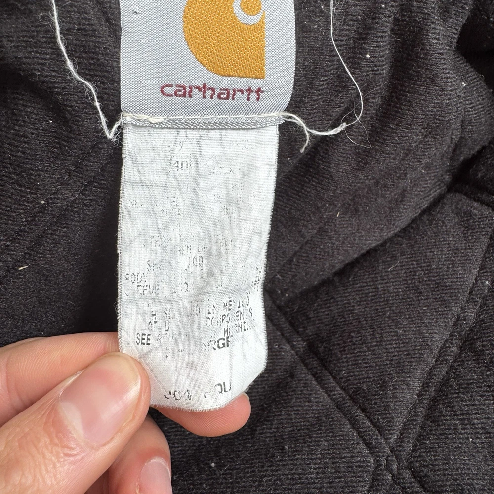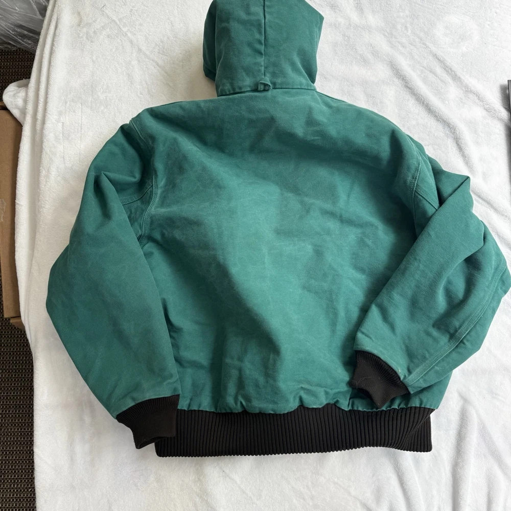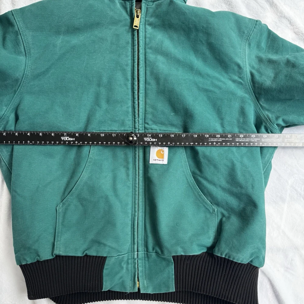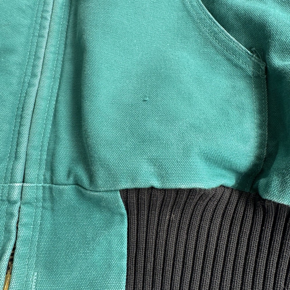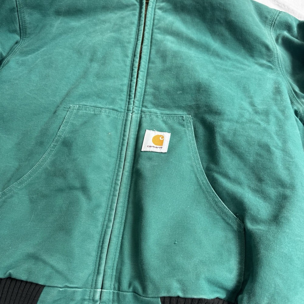 This vintage Carhartt jacket in size large features a classic bomber style with a hood, full zip closure, and quilt-lined insulation, making it perfect for outdoor activities in colder weather. The aqua teal color adds a unique pop of color to this piece, which is also adorned with the iconic Carhartt logo. Made with durable cotton canvas and lined with polyester, this jacket is a quality piece that can be machine washed for easy care. With a retro vibe that blends elements of hipster, western, and 90s style, this Carhartt jacket is a must-have for any fashion-forward individual looking for a durable and stylish outerwear option.