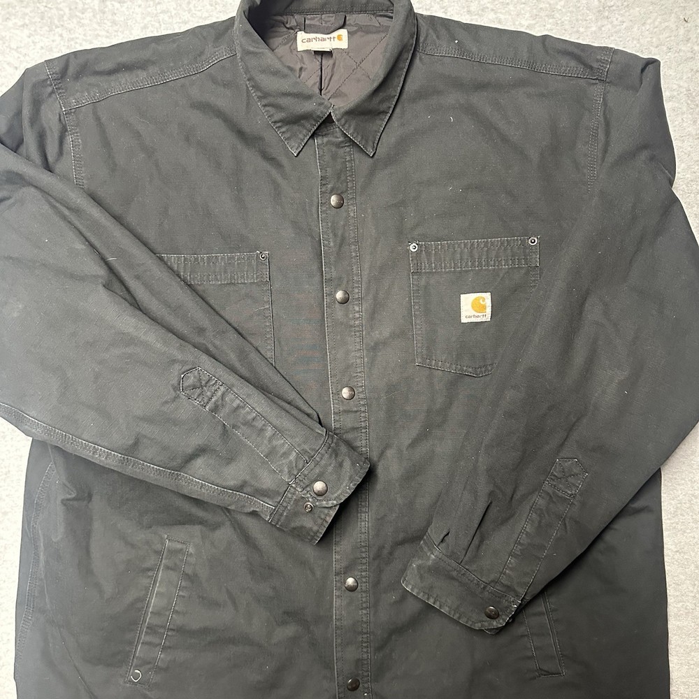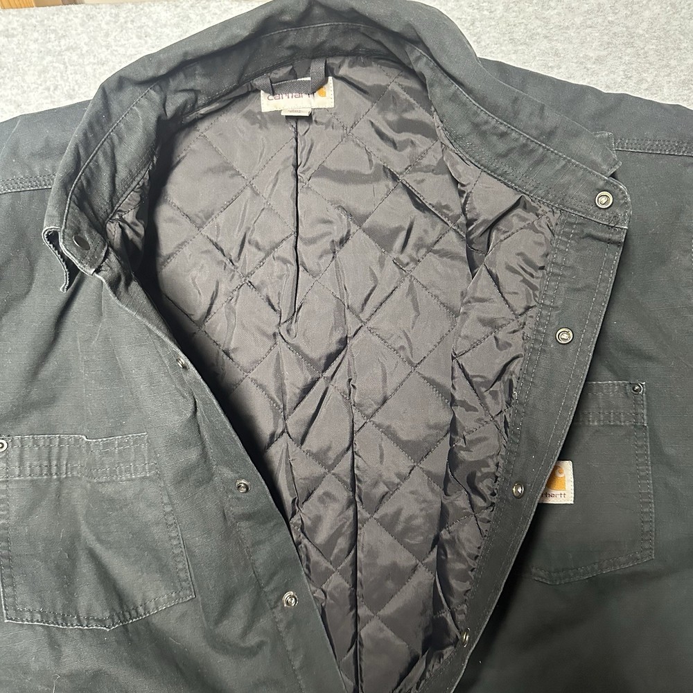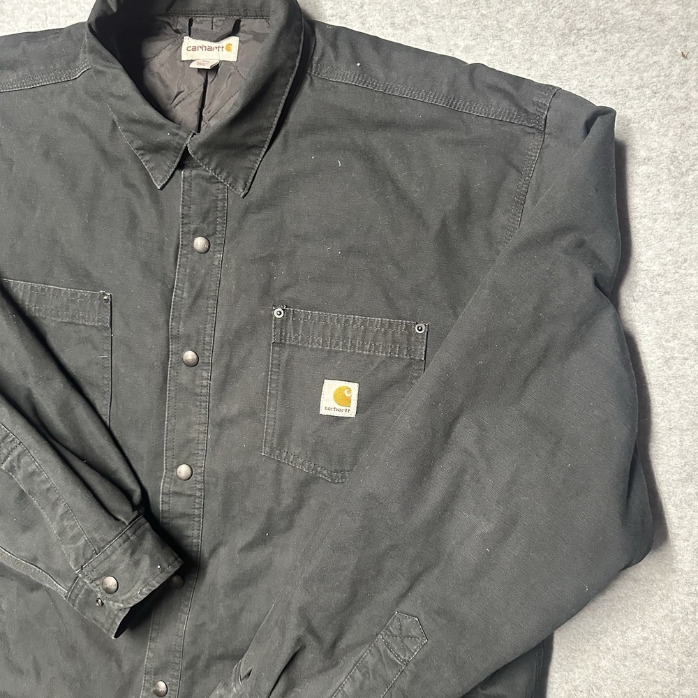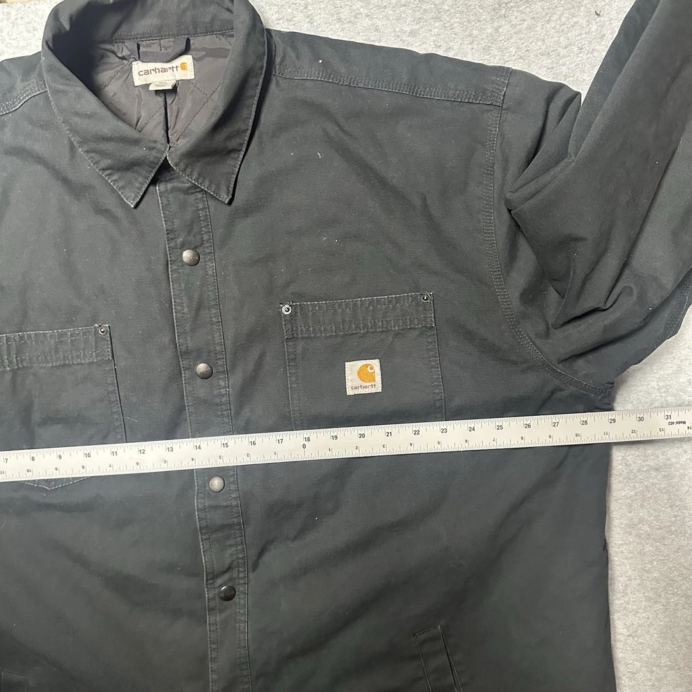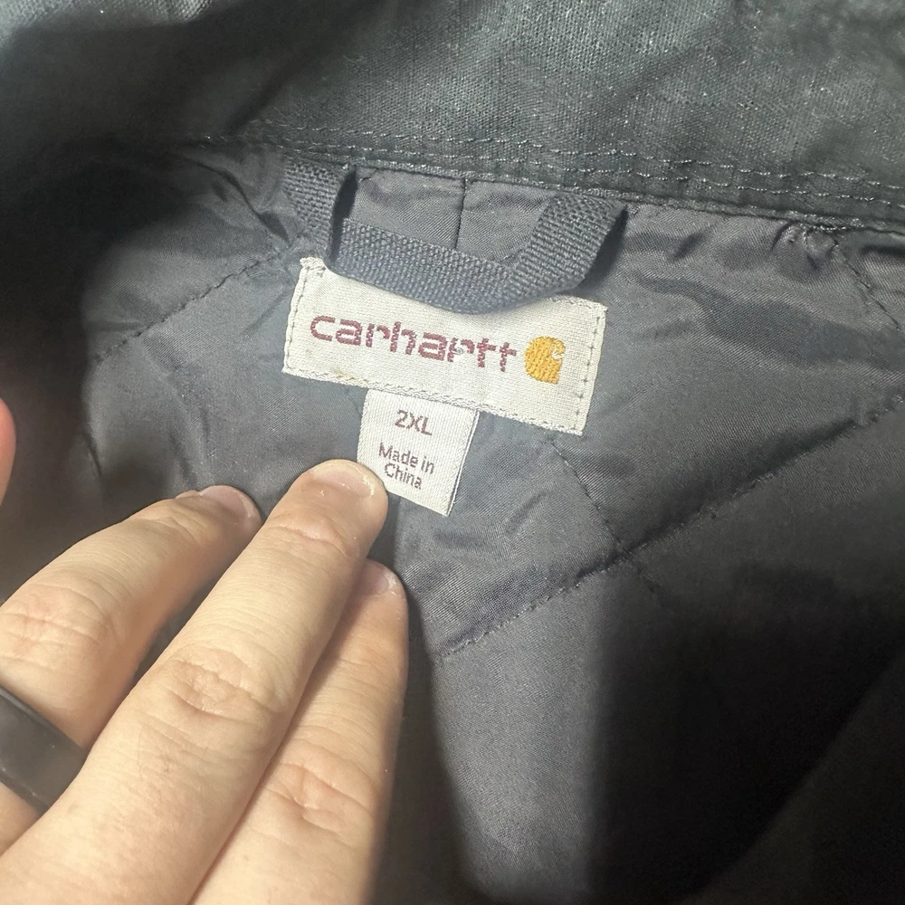 This Vintage Carhartt Jacket is a 2XL black duck canvas quilt-lined chore coat with a mid-length overcoat style. Made with a cotton outer shell and nylon lining, this jacket features a spread collar, full zip closure with a hook and loop, and multiple pockets for functionality. The jacket also includes polyester insulation, making it suitable for travel, casual, and workwear occasions, with a retro 90s outdoor theme. The Carhartt C26 model is machine washable and proudly made in the United States, showcasing the brand's iconic logo.
