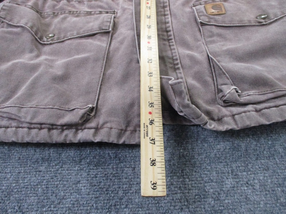 For sale is a used Carhartt Jacket Measurements: Please see above photos for all measurements. Compare to your favorite garments for best fit. No size tag, sized by measurements. Marks on sleeve cuffs. I ship items out EVERY DAY so EXPECT a QUICK delivery!