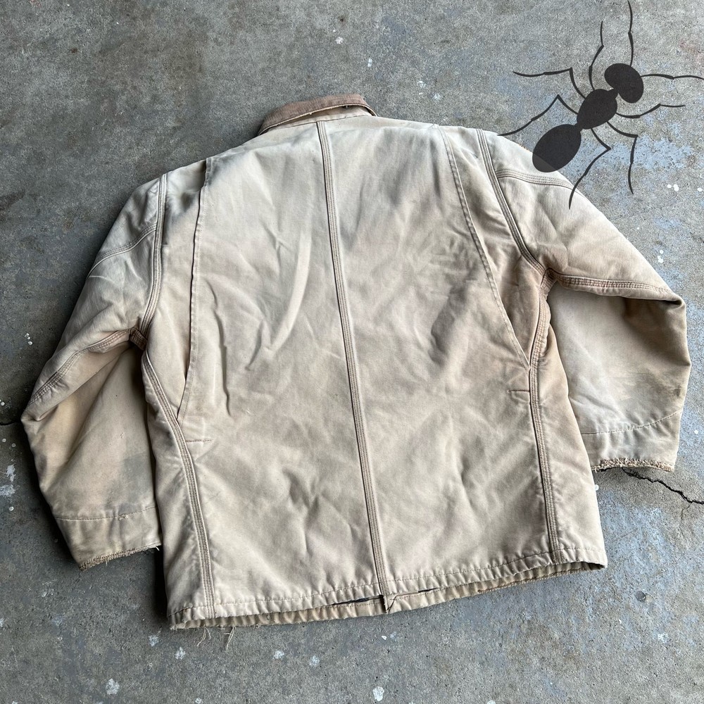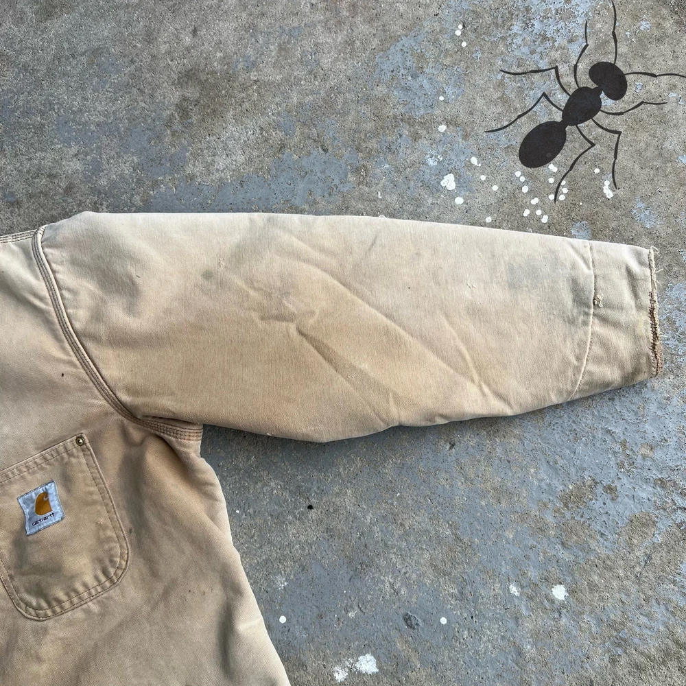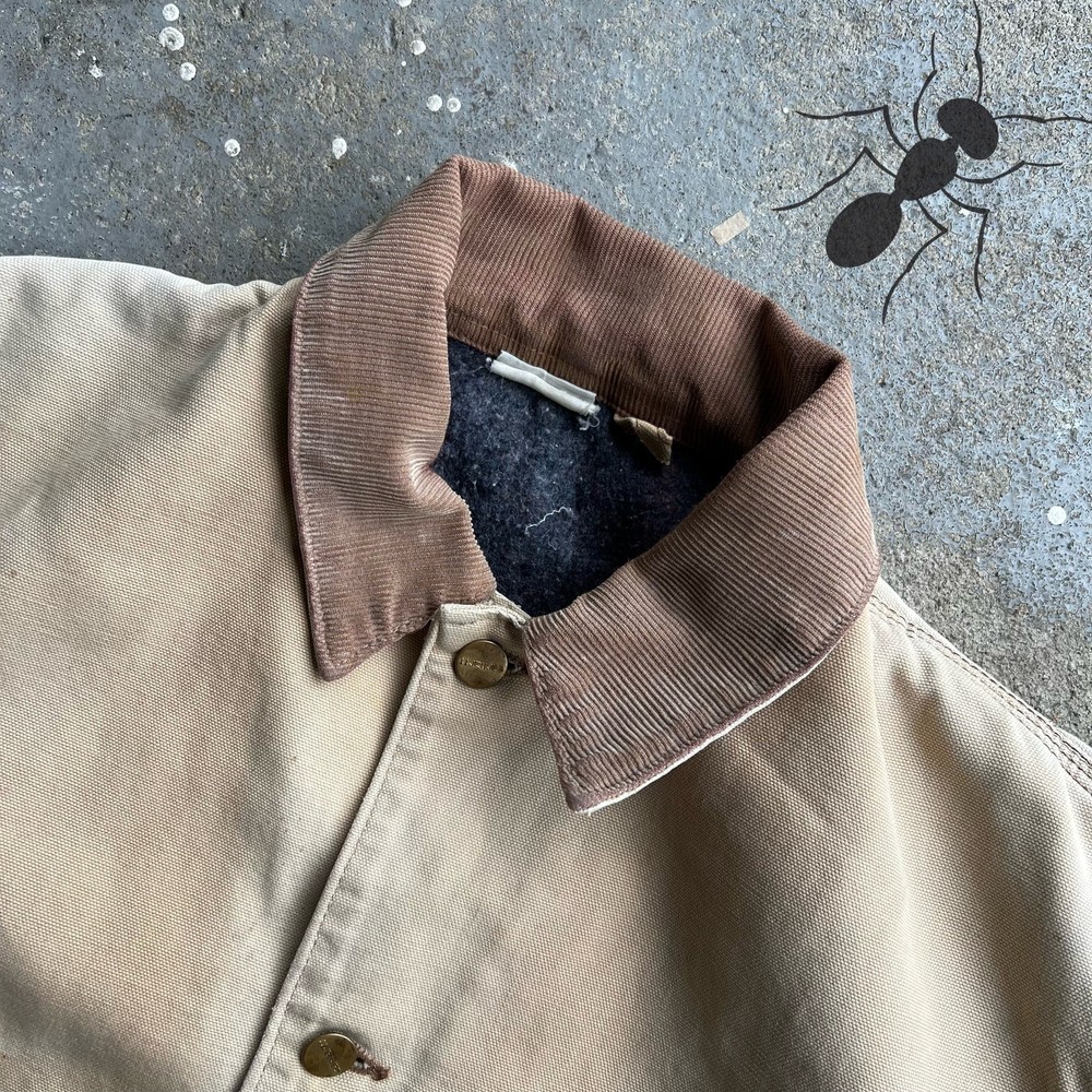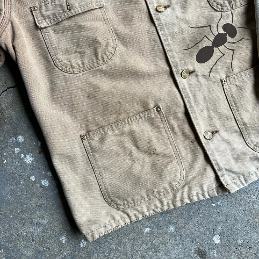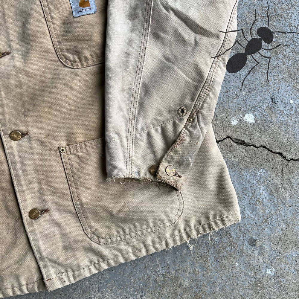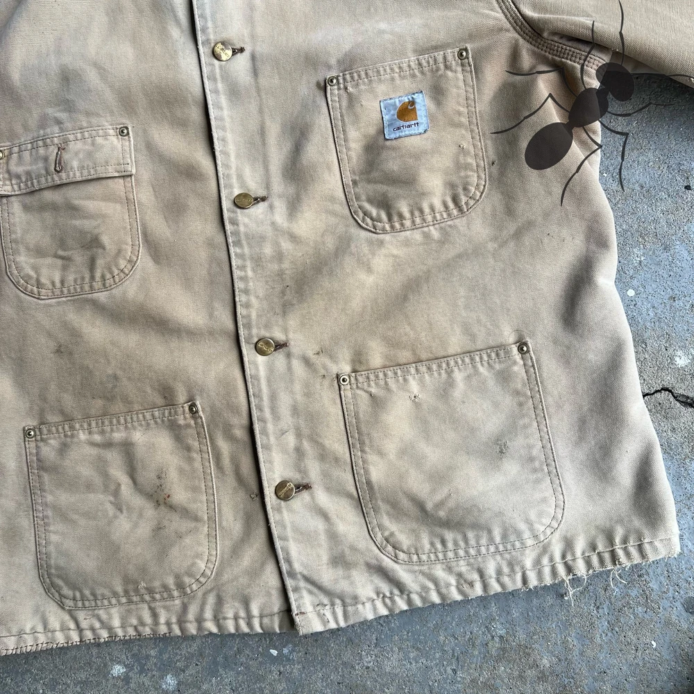 Vintage faded brown Carhartt work wear chore coat jacket. Really nice one. Patch says “Honda loves you”. Great fade. Has flaws so check the pics please! Measures 25.5x29. Best fits a large or xl for this style. Tag faded out so Please check measurements before purchasing. I do my best to show any flaws in pictures. Quick shipping! Bundles encouraged! @ants_haul on Instagram.