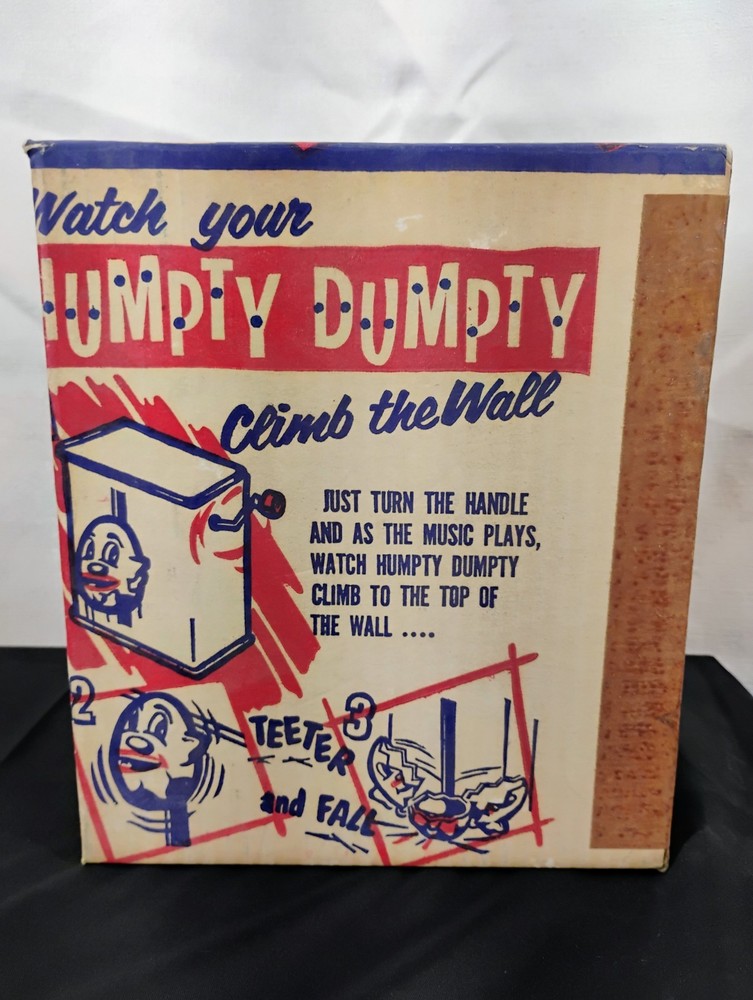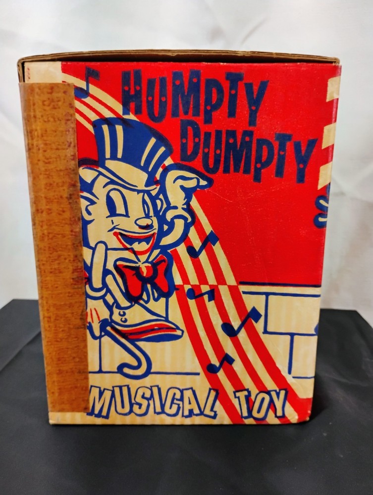 The Vintage Carnival Toy Musical Humpty Dumpty Toy Box is a nostalgic piece that would have once contained a toy meant to spin and play music based on the classic nursery rhyme. This collectible item is a perfect addition for collectors of vintage and antique toys, especially those interested in musical toys from carnivals or amusement parks. The box alone adds value to any collection and serves as a great reminder of simpler times and childhood memories. Thank you for visiting my listing today and thank you for your interest in this item! My goal is to have a pleasant transaction resulting in a satisfied customer. I hope any transaction between us leaves you with a feeling of confidence knowing you can trust me and the items I offer here. *Most if not all my listings are set to accept offers. Feel free to send an offer and I will be happy to consider it!! *Please contact me with any questions or concerns and I will be happy to help. *Always examine the photos carefully, and if in doubt, email me with any questions you may have. *Please note that condition statements are offered as a guide only. They will always be somewhat subjective and reflect our opinion, which may not necessarily agree with someone else's opinion. PLEASE READ: I aim to please and I want my buyers to have a positive transaction with me. If you have questions, concerns, or special requests related to any of my items I hope you will contact me so we can work them out to your satisfaction. I sell my items to give you a great item at a decent price while making a little profit at the same time. If you feel the item you are interested in is too pricey do not hesitate to send me a fair offer and I will consider it. My goal is to satisfy your needs and mine so both parties can benefit. SHIPPING: If you prefer a different shipping method or company please contact me and I will do all I can to make that happen. If you have concerns or requests about the packaging of your item contact me and I will do all I can to accommodate them. Shipping costs are based on location in each state or country, the costs always differ. After I have received your payment I will ship your item out within 3 business days or less excluding weekends and holidays. BEFORE PURCHASING & BIDDING: **Please see all the pictures. I do not have great photography skills but I try to get the most accurate photos I can. If you are unsure about something you see in a photo contact me so I can do what I am able to answer your concern about the item. **I cannot stress enough that if you have any questions or concerns please contact me before purchasing and bidding. Communication can solve so much. **As a customer myself, I understand the meaning of customer satisfaction and my goal is to have nothing but satisfied customers. If you are not unsatisfied with your purchase I ask that you please contact me so I can take care of your issue. My goal is for you to be 100% satisfied. INTERNATIONAL BUYERS WELCOMED - PLEASE NOTE: I welcome International buyers! Please be aware that any custom/duties/taxes that the parcel might incur once it is out of the USA are the responsibility of the buyer. Please check with your country's customs office to determine what these additional costs will be prior to bidding or buying. Please refer to the eBay Site Map for more information if needed.