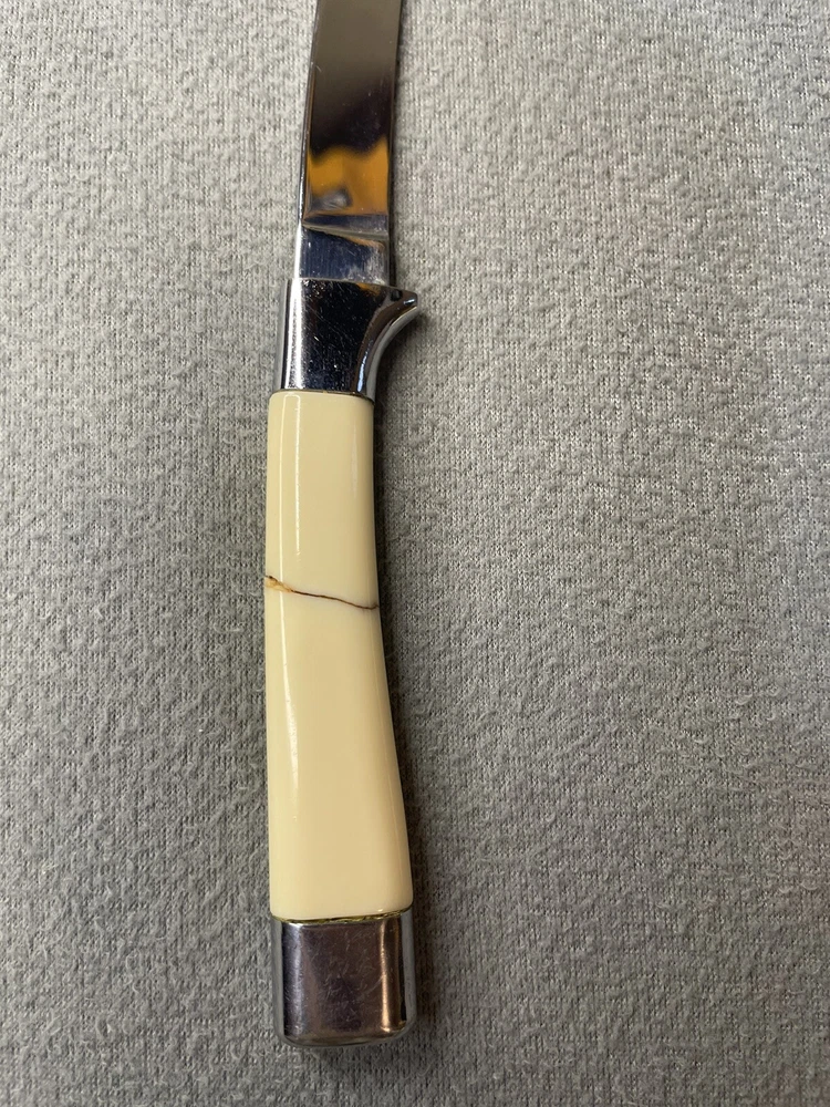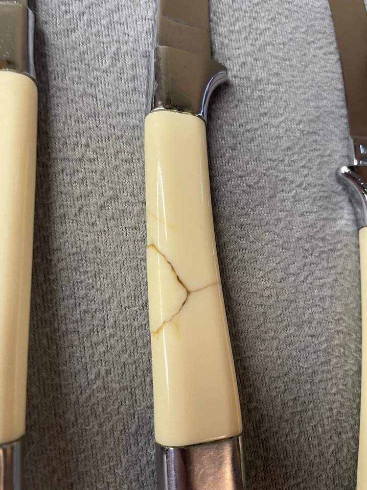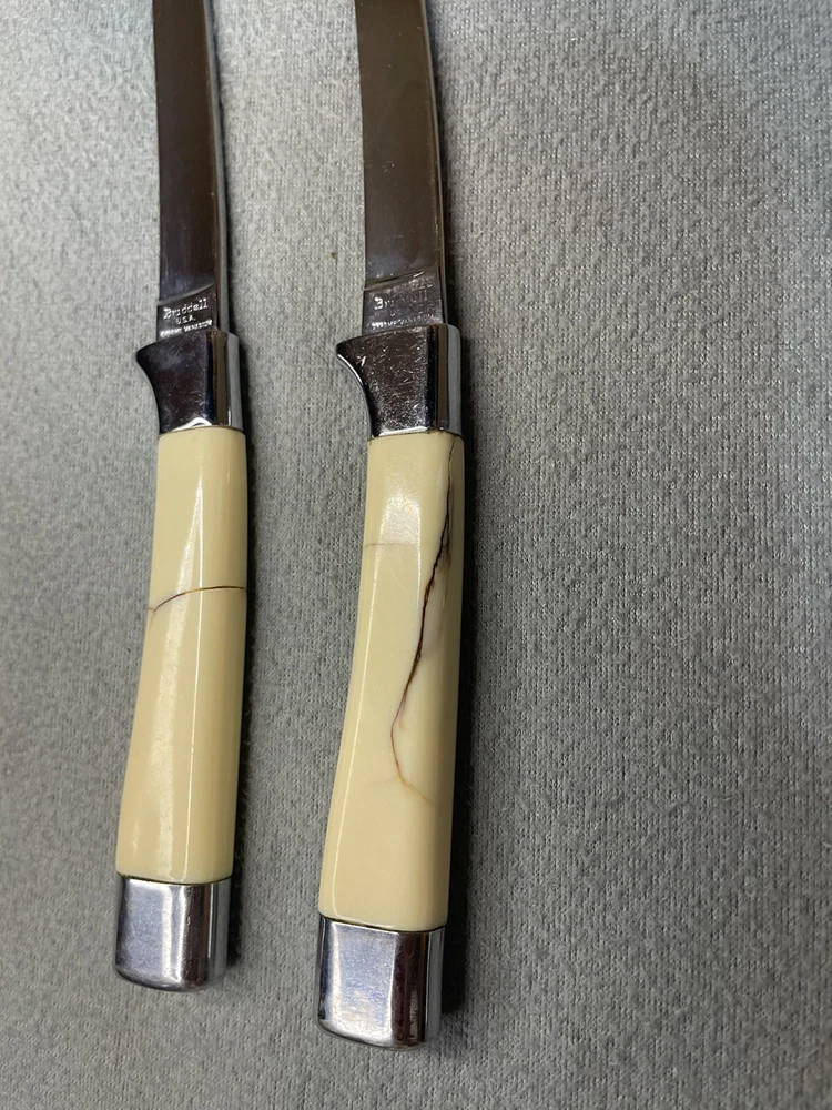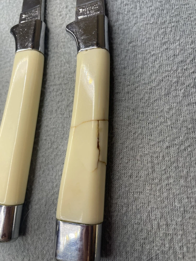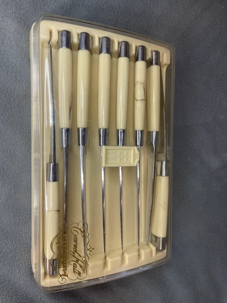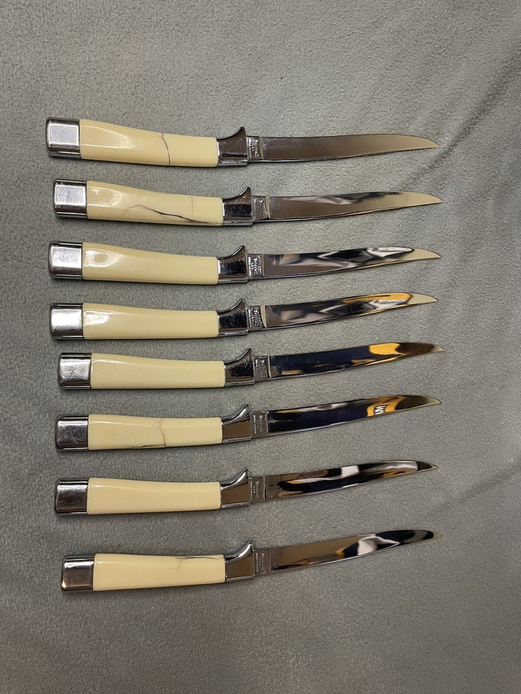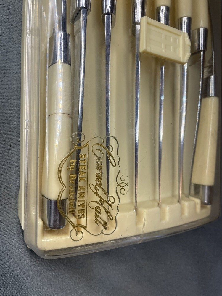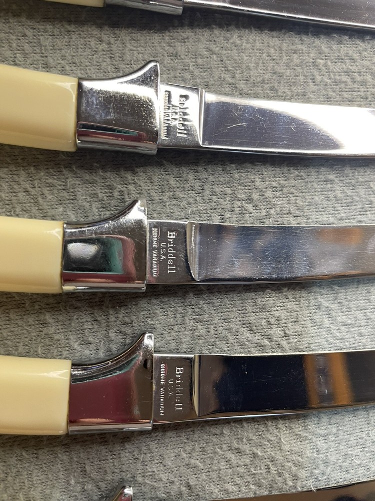 Elevate your dining experience with the vintage set of 8 Carvel Hall by Briddell steak knives. Crafted from high-quality Chrome Vanadium, these knives boast durability and rust resistance, ensuring they remain sharp and impeccable through frequent use. The sleek silver color adds a touch of sophistication to any table setting, making them a perfect complement to your existing cutlery ensemble. Each knife features a straight blade edge, designed for effortlessly slicing through meat, delivering a precision cut every time. Made in the United States, this set is a testament to classic design and craftsmanship, making it an ideal choice for those who appreciate the finer details in their kitchen arsenal. Whether for special occasions or everyday use, these steak knives are a timeless addition to your dining collection.
