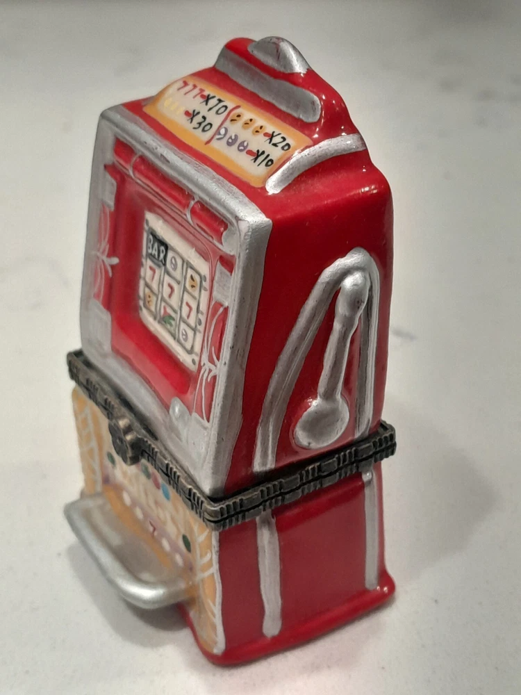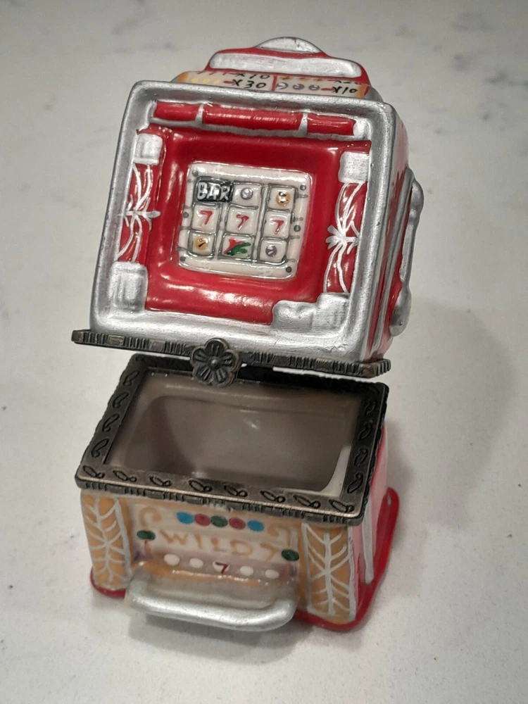 This vintage slot machine, featuring the popular Casino Wild 7 theme, is a must-have for any collector of casino memorabilia. The ceramic construction and hinged design make it a durable and convenient addition to your collection. Measuring 3.25" tall, this slot machine is perfect for display in any casino-themed room. The country/region of manufacture is unknown, adding to the intrigue and mystery of this unique item.