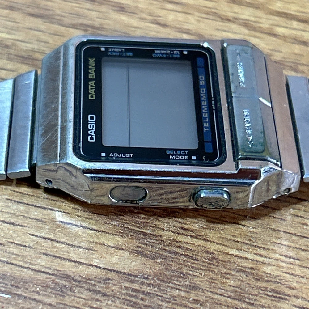 This vintage Casio DB-500 TELEMEMO 50 DATA BANK watch is a rare find for watch collectors and enthusiasts. Made in Japan, this wristwatch features a digital display, quartz movement, and a two-piece strap. The silver bezel color, Arabic numerals, and luminous dial make for a classic and sporty look. This Casio Databank model comes with a variety of features such as a date indicator, day/night indicator, world time, and a chronometer. It is also water-resistant, has a mineral crystal, and an easy-to-read large numeral display. Although it needs a battery, this limited edition watch is in great condition and is a must-have for any watch lover. need a new battery Does not include box or some other accessories ONLY comes with what's pictured. Please review pictures prior to purchase. We apprecdiate all business and would recommend sending a message if any issue or concern comes up. Thanks!”