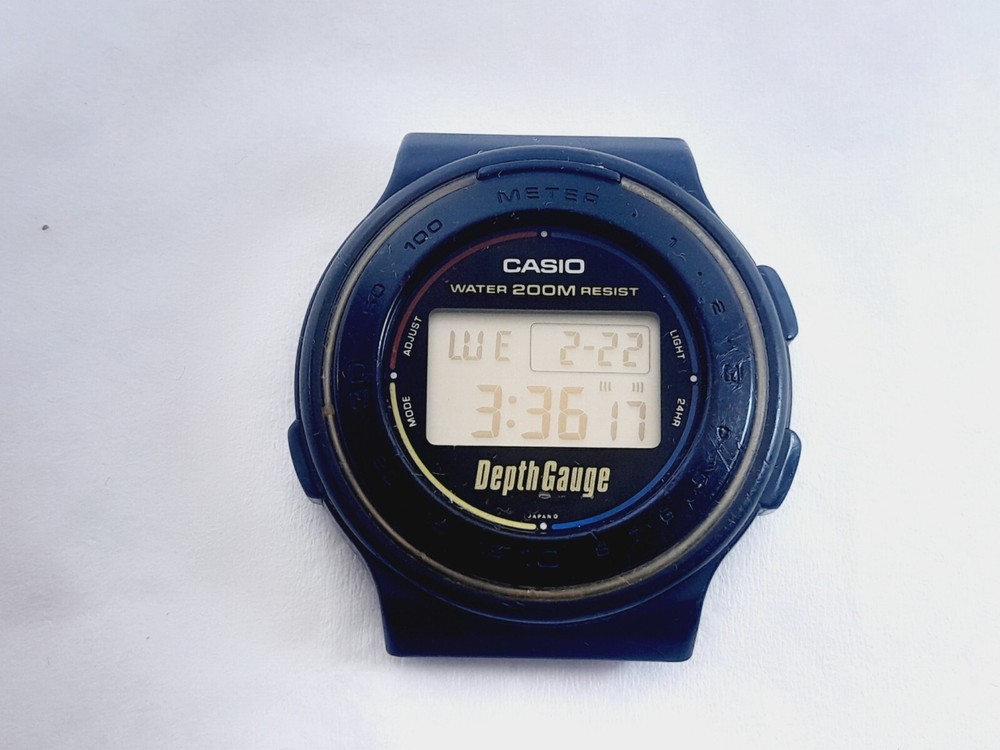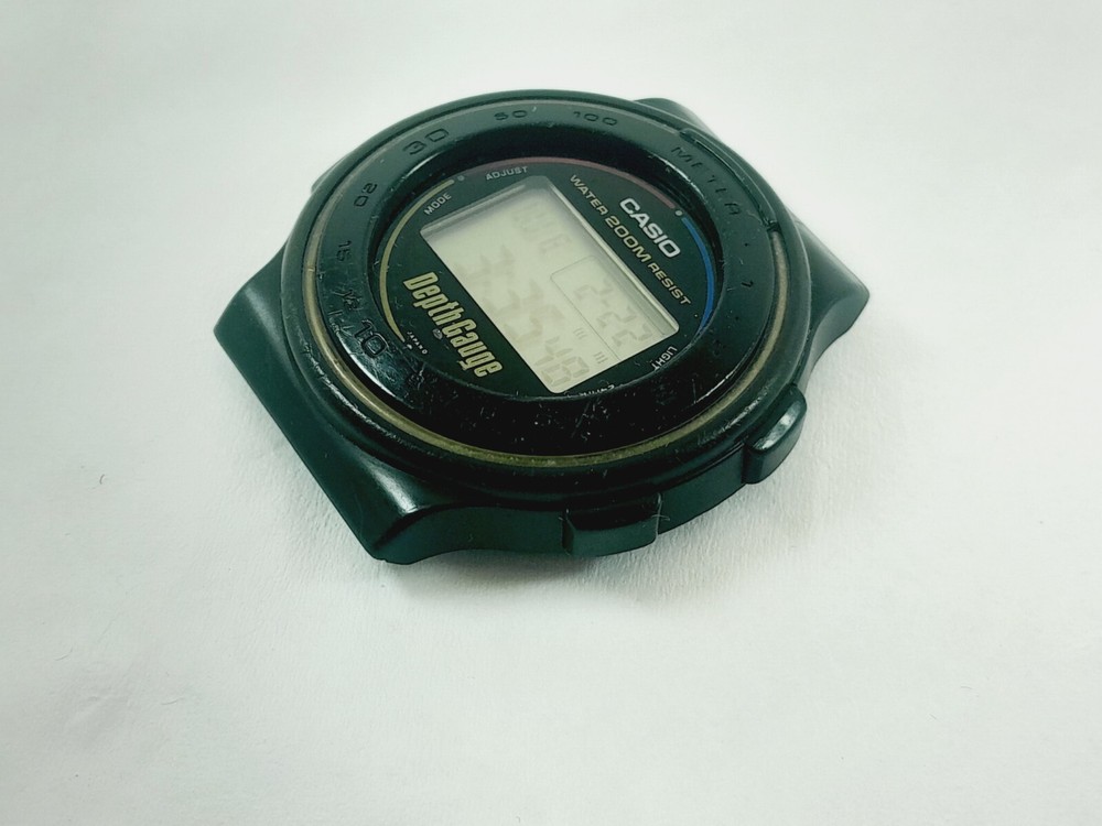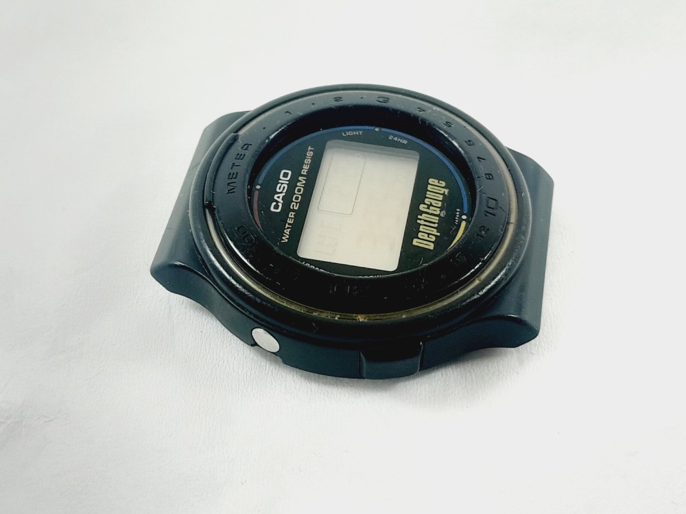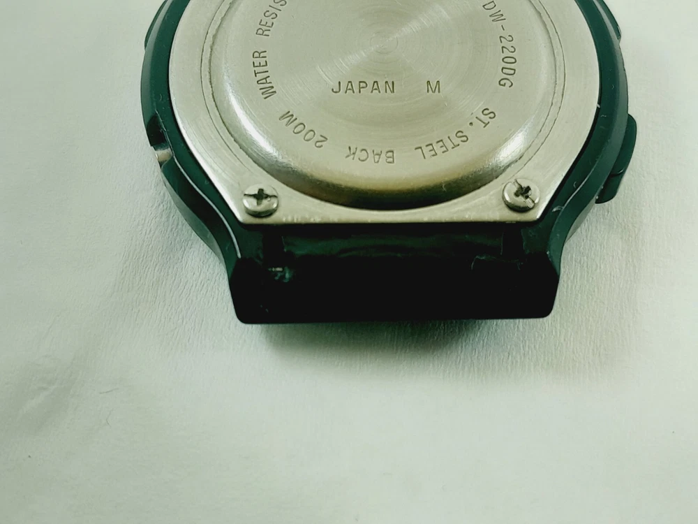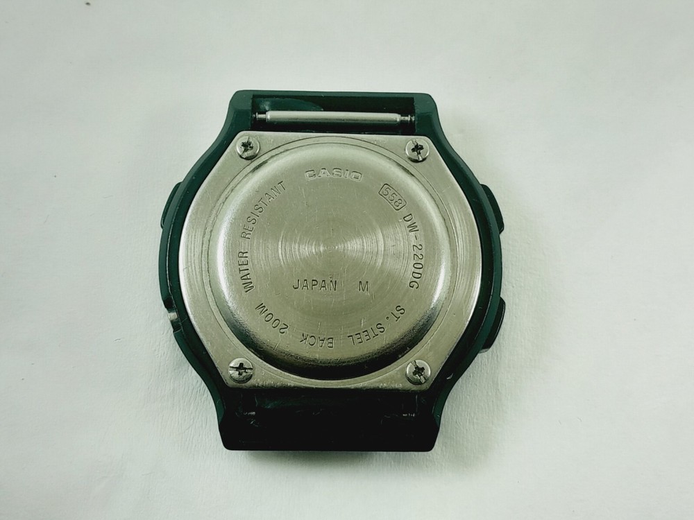 Year Manufactured: 1980-1989 Style: Diver Display: Digital Movement: Quartz Water Resistance: 200 m (20 ATM) With Original Box/Packaging: No Model: Casio Vintage Type: Wristwatch With Papers: No Features: 12-Hour Dial Band Material: NO Reference Number: DW220DG Department: Men Case Size: 41 mm Brand: Casio Country/Region of Manufacture: Japan Case Color: Black Caseback: Solid Band Color: NO Watch Shape: Round