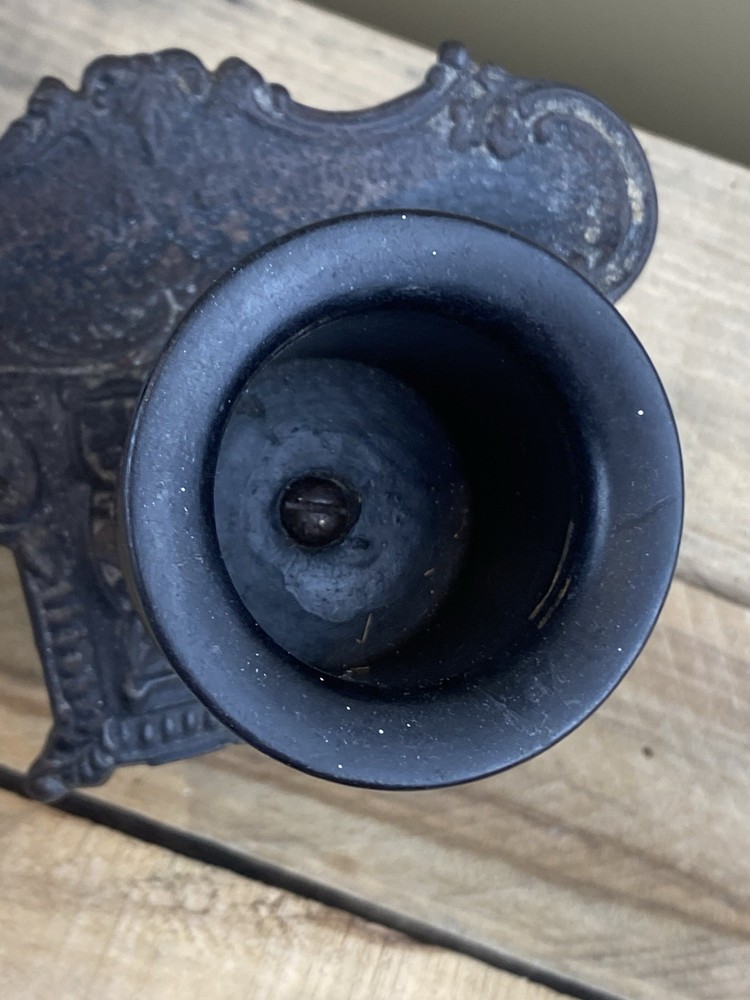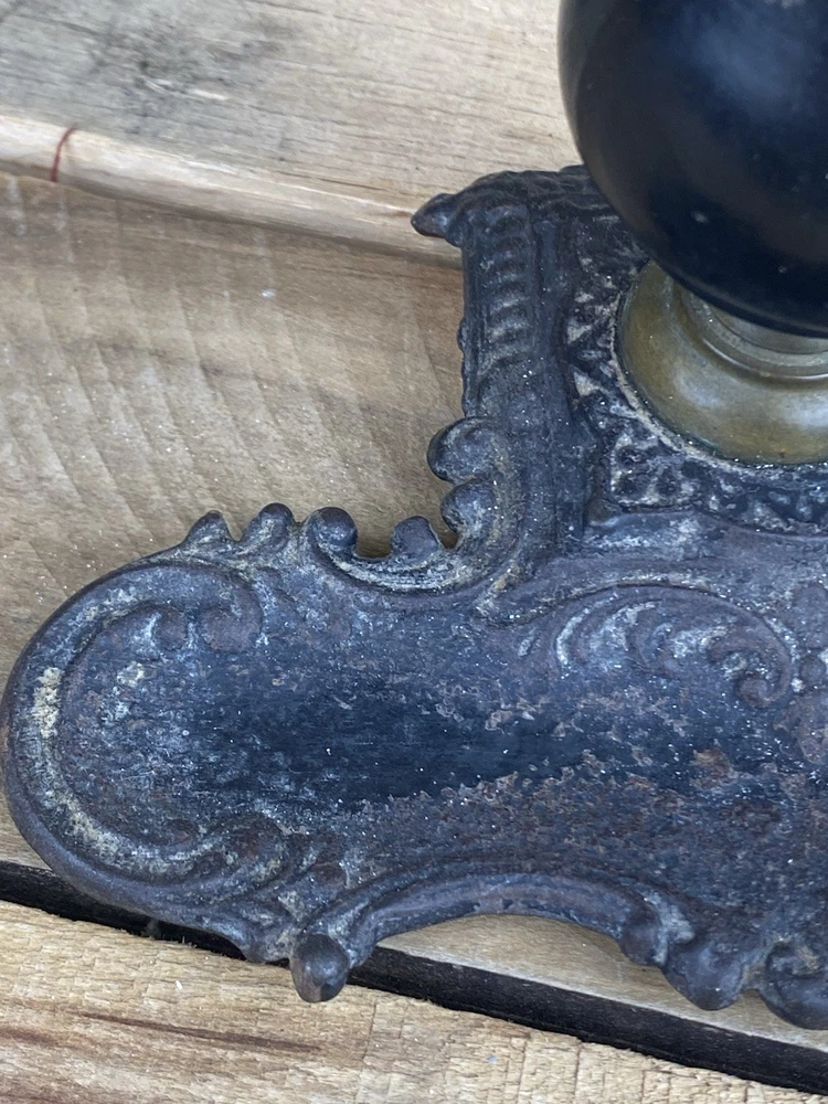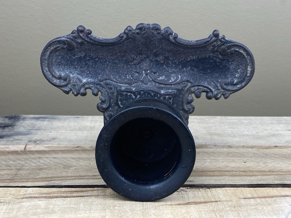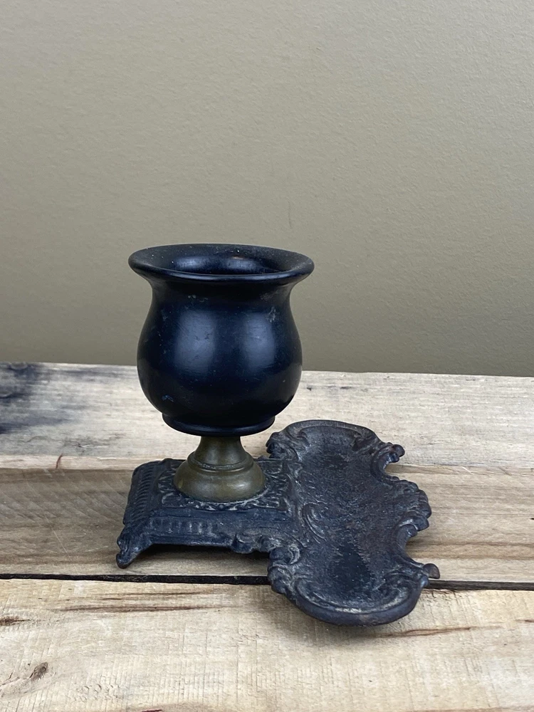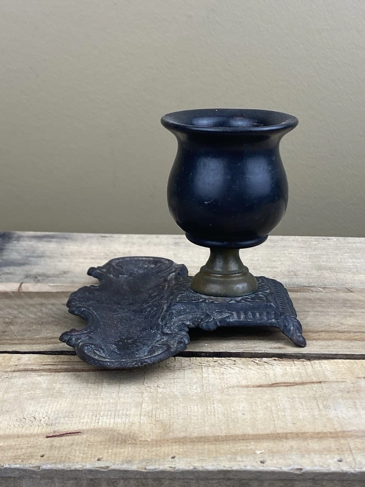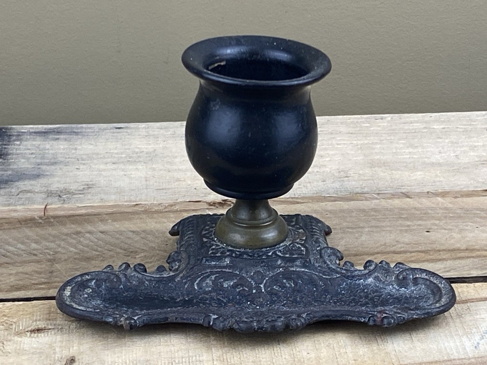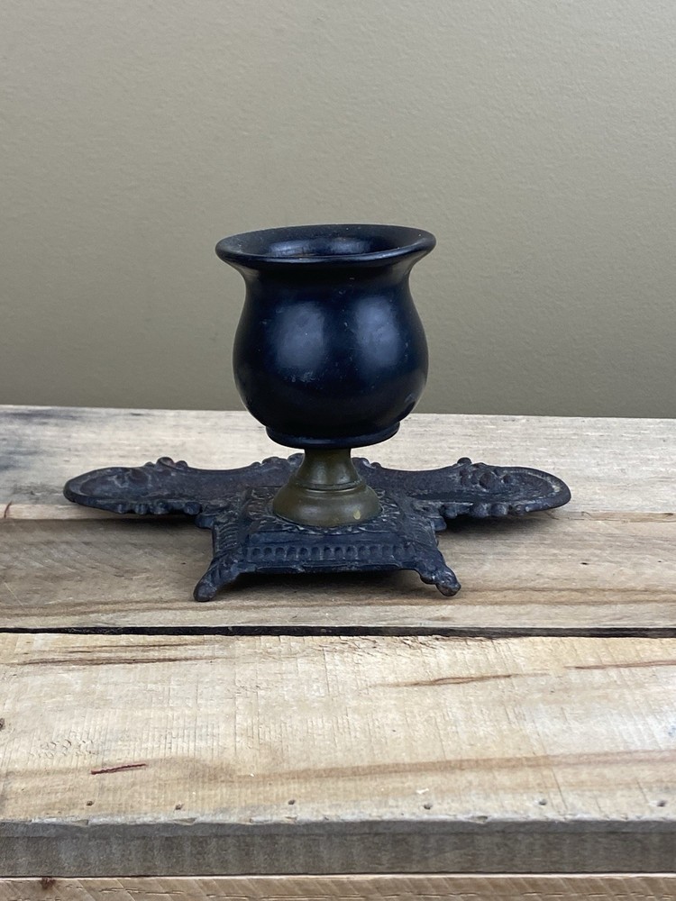 Early Cast Iron, Brass & Ebony Wood Pedestal Match Holder Tabletop. The base is 6” x 4” and it’s 3 1/2” tall.