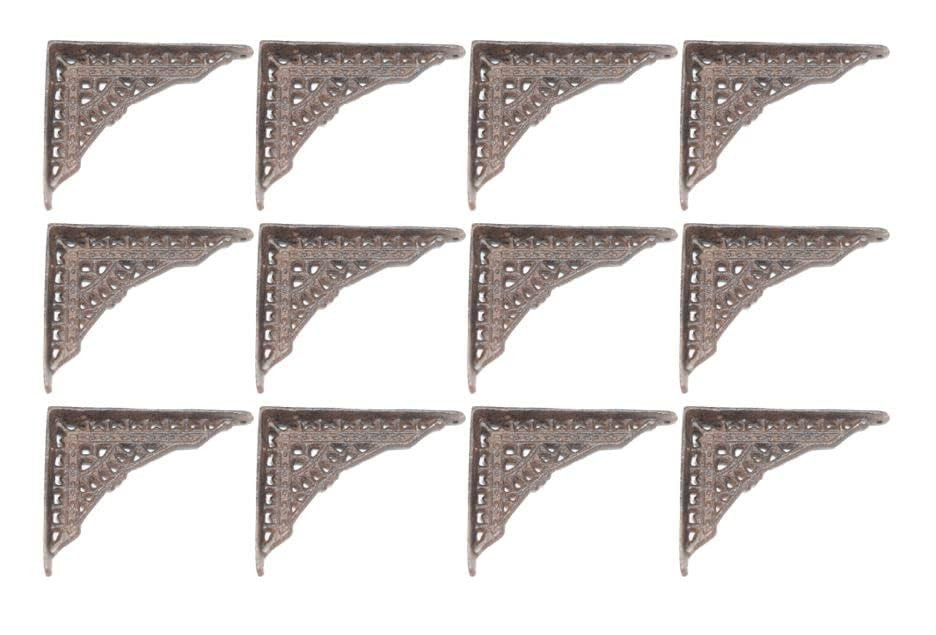 Pack of 12 solid cast iron small shelf brackets. Each bracket measure 5" X 4". Rustic brown color for a truly vintage look. Perfect for restoration, accent pieces, farmhouse decor etc.! Mounting screws are not included. Pack of 12 small rustic cast iron brackets. Made durable from solid cast iron construction. Each bracket measure 5" X 4". Great for small wall mounted shelves. The rustic cast iron color provides a fantastic accent piece for any room or restoration project. Six predrilled holes (mounting screws not included) for easy and solid mounting