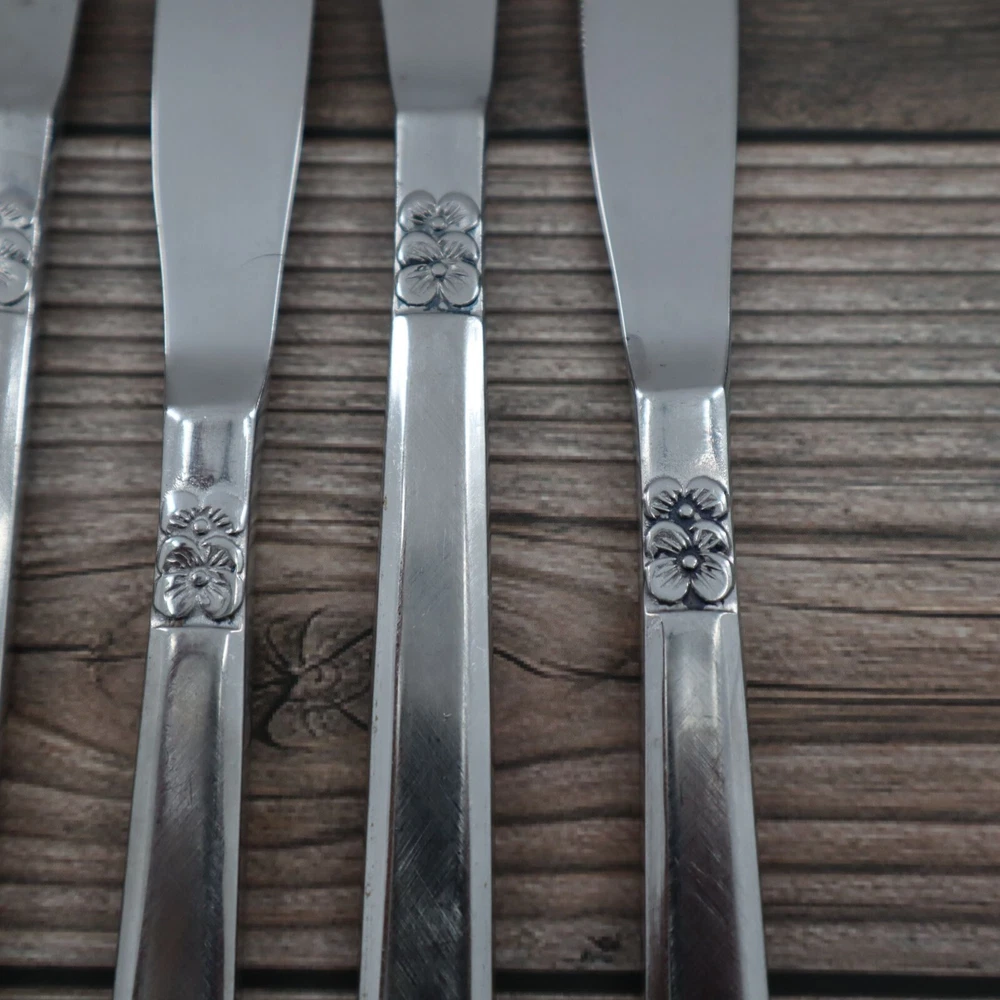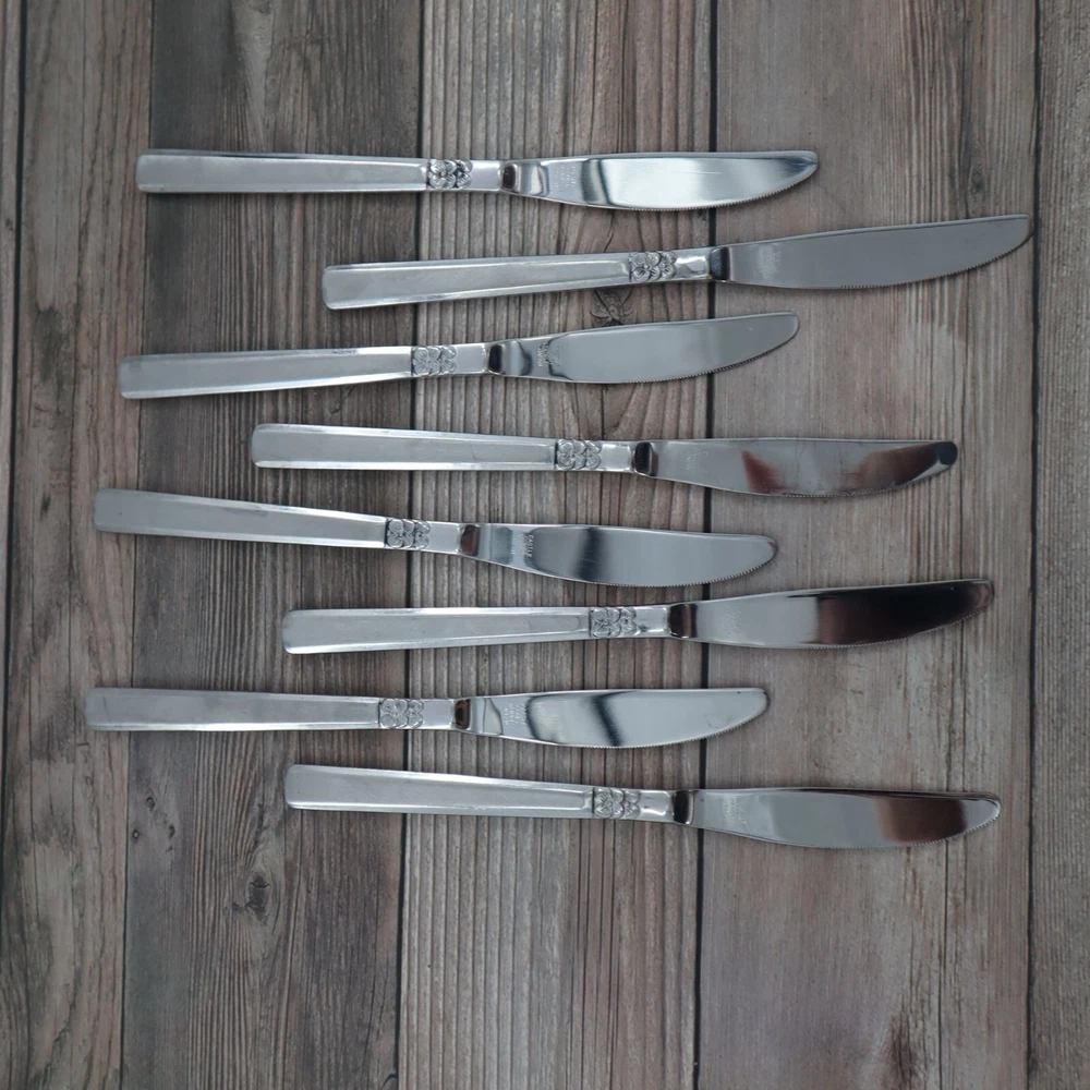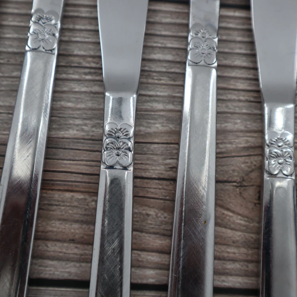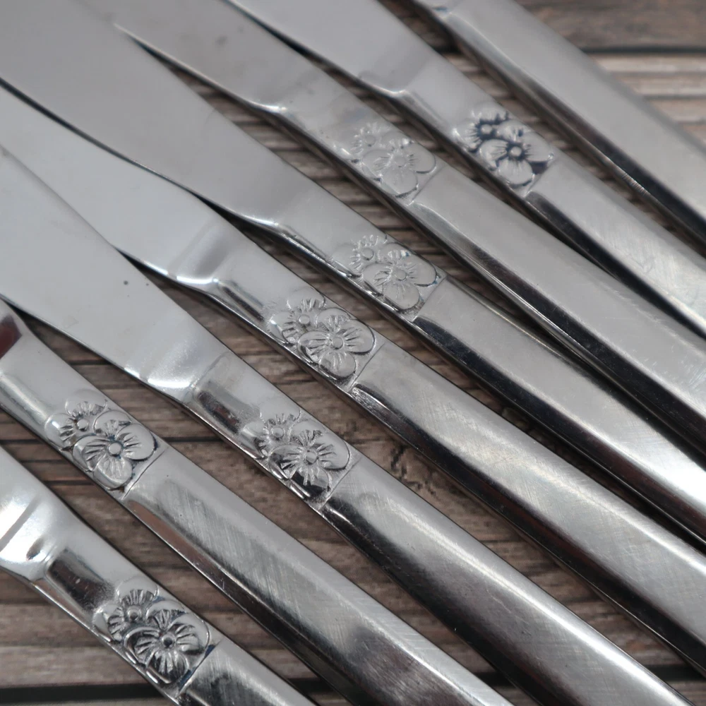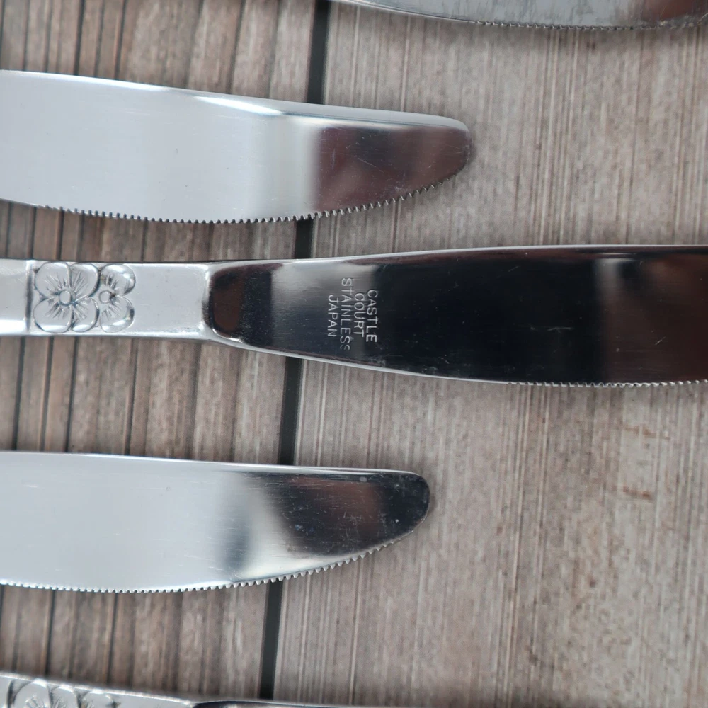 Vintage Castle Court 8 Pcs Mod Solid Stainless Steel Knife 8.5" Kitschy Cottage These knives are so sharp, they'll slice through bread like it's butter. Impress your grandma with their floral design; she'll think they're daisy-ing. • Stainless steel construction • Floral design on handle • Set of 8 • Serrated edges • Durable and long-lasting Features: • cottagecore, grannycore, retro, kitschy, vintage Size: Unisex One Size Condition: Pre-Owned Good Vintage, used condition with no major flaws.