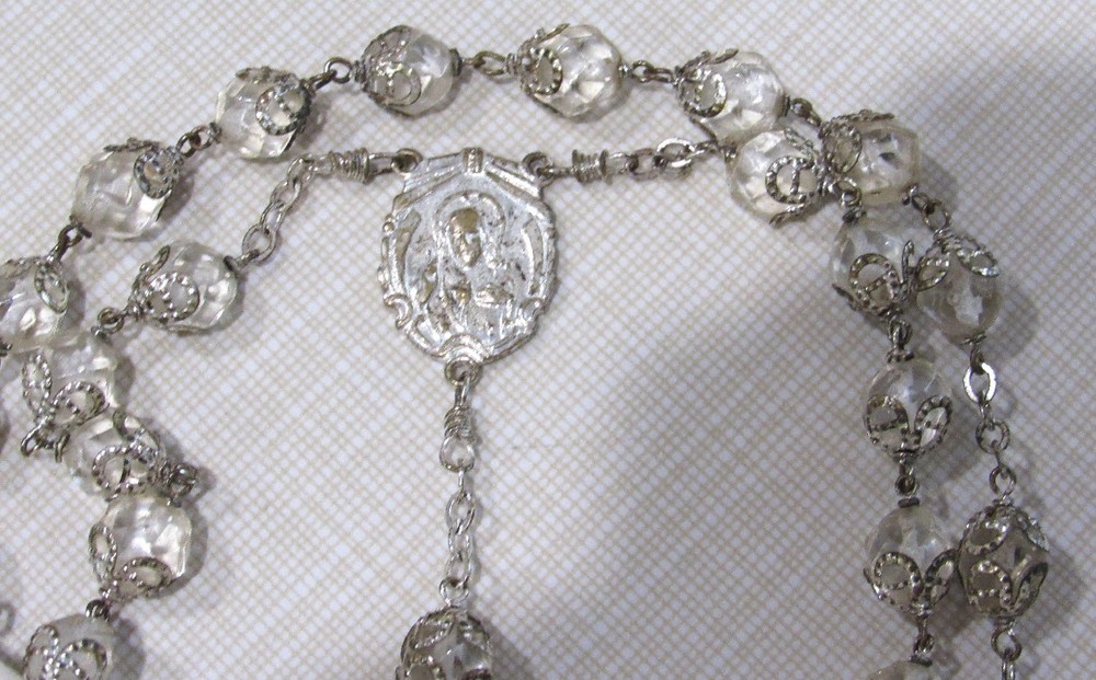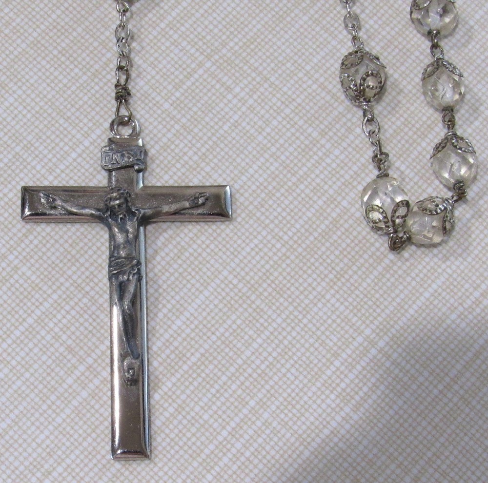 Vintage Catholic 40" Crystal Bead Silver Tone Filigree ROSARY Crucifix Necklace Vintage Catholic 40" Crystal Bead Silver Tone Filigree ROSARY Crucifix Necklace Beautiful Vintage Crystal Bead Rosary with Large Crucifix Unmarked Not Sterling - silverplate possibly Total length is 40" Crucifix measures 2-1/8" in length Comes in a small leatherette pouch PLEASE message me with any questions! Buyer pays $4.95 shipping via USPS package SAME or Next Day Shipping!!! Listing and template services provided by inkFrog