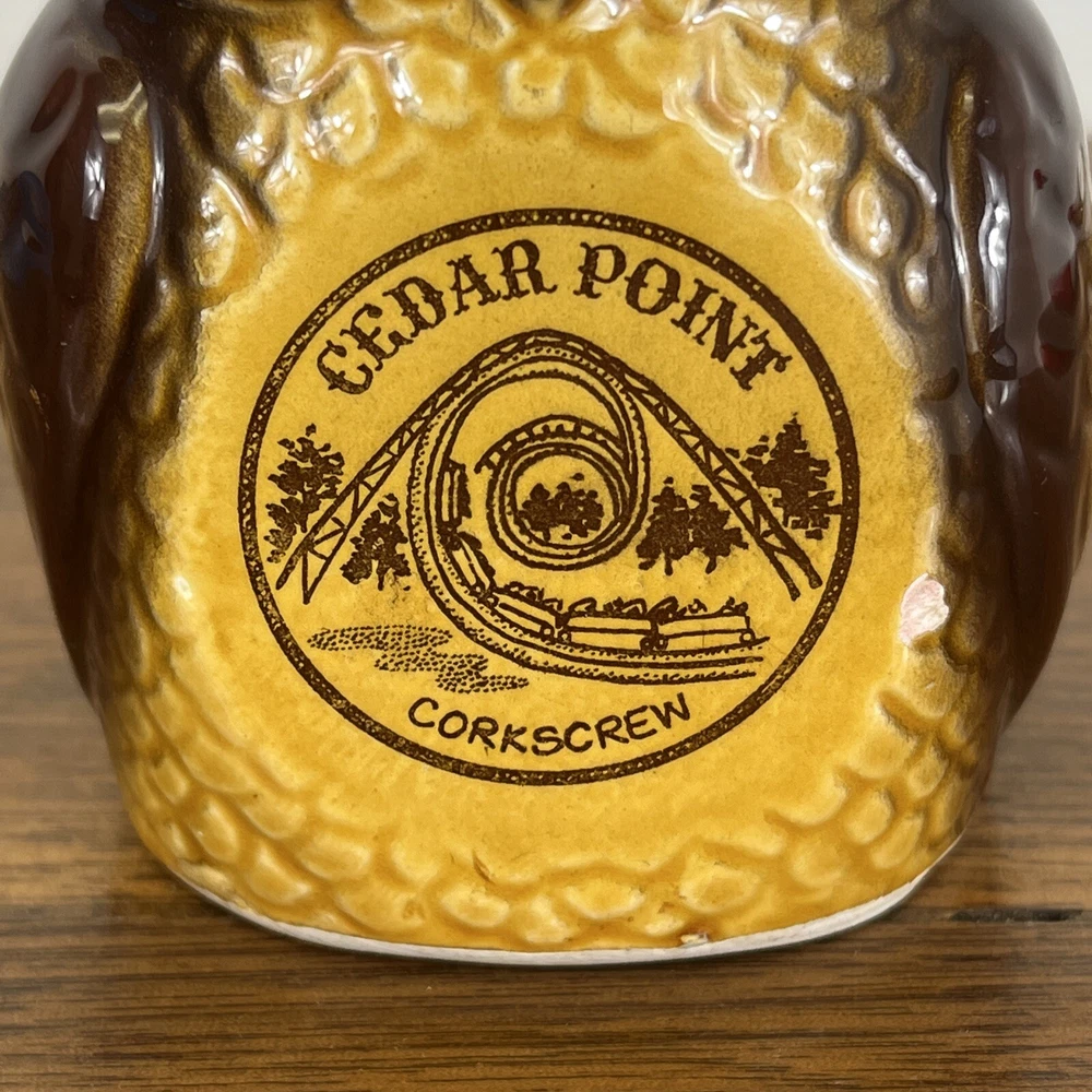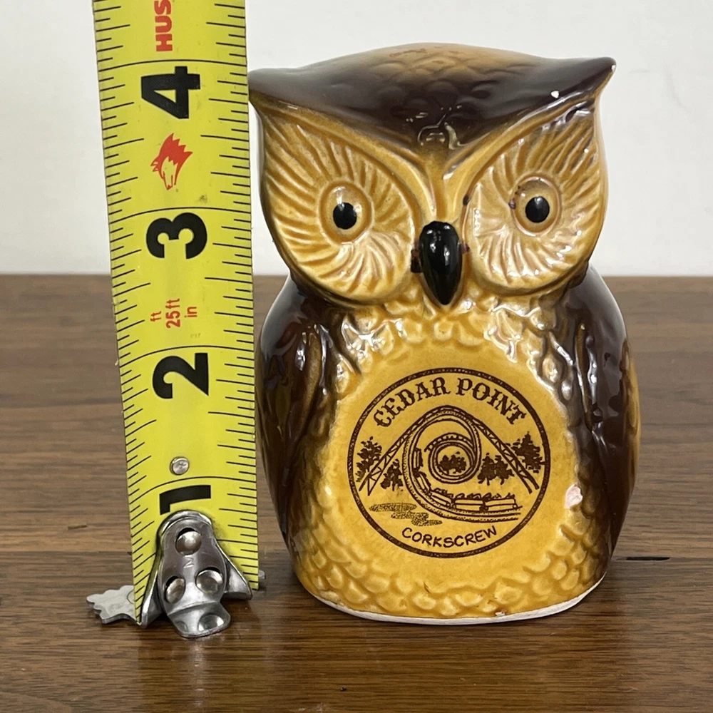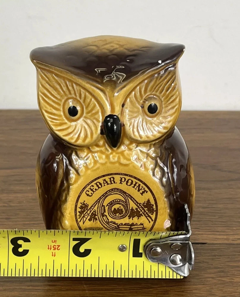Vintage Cedar Point Ceramic Owl Coin bank Japan Corkscrew Rollercoaster 4”