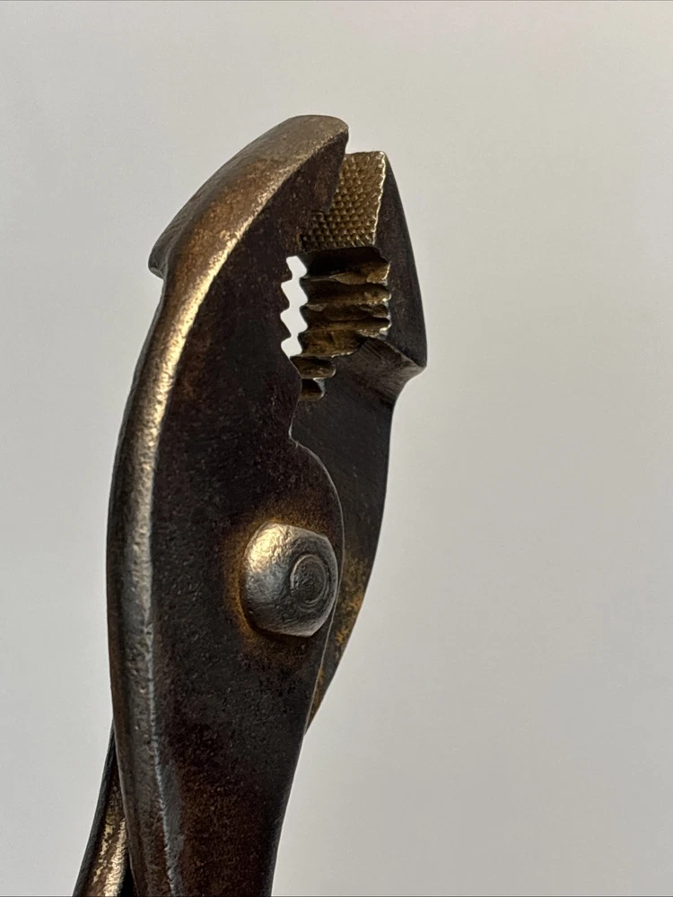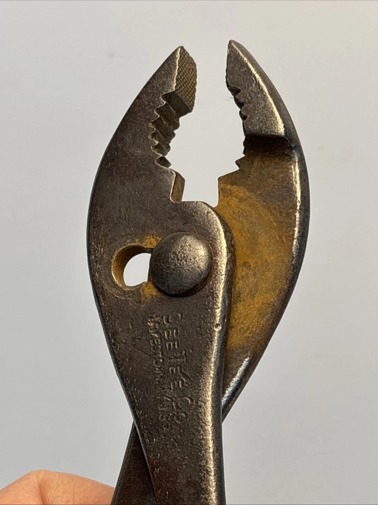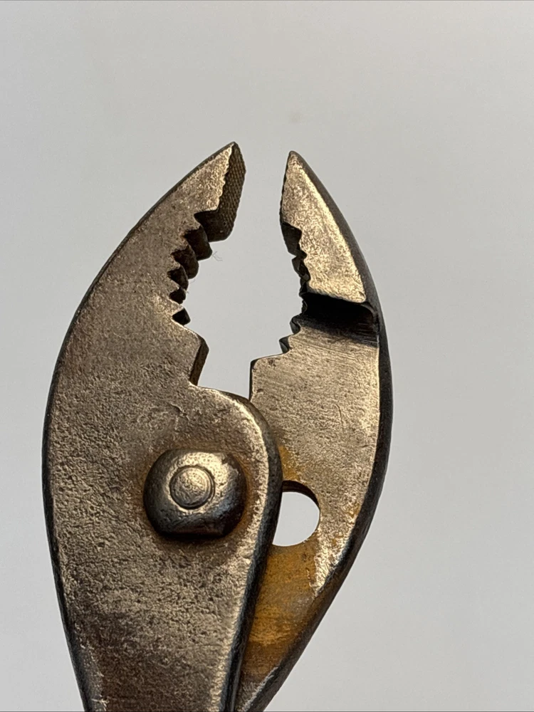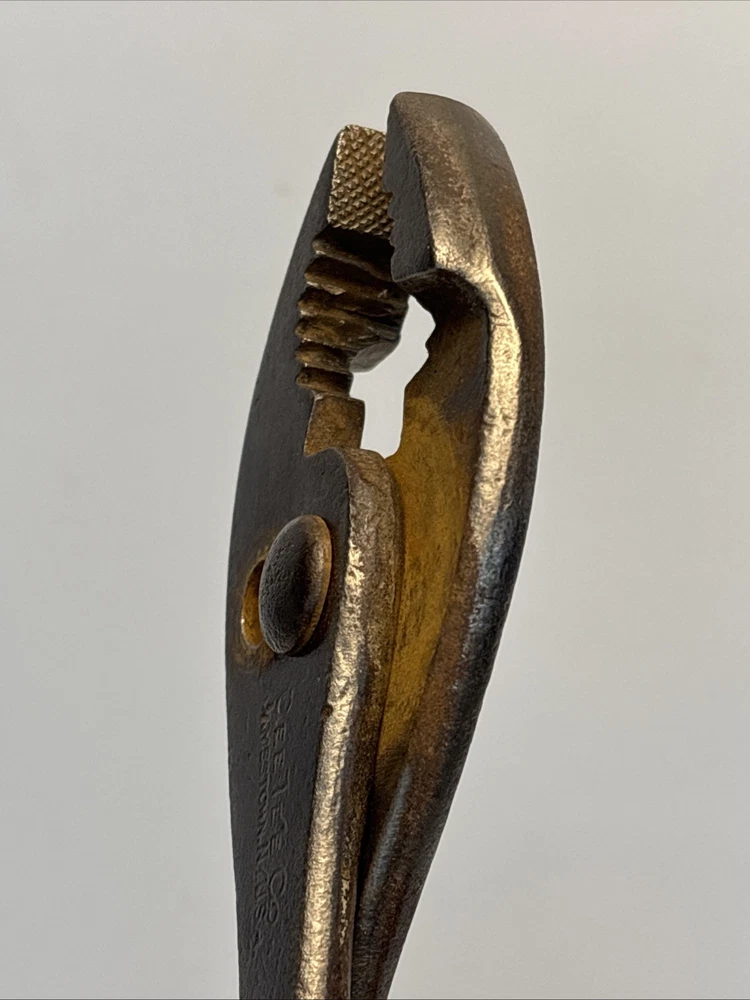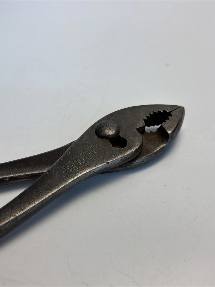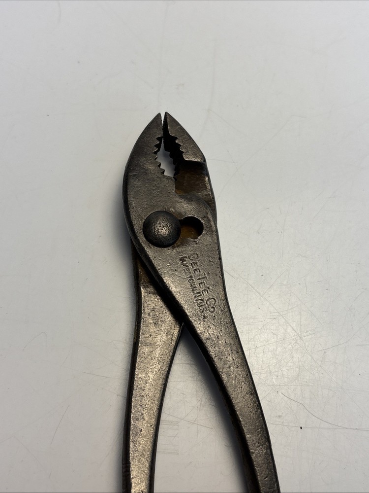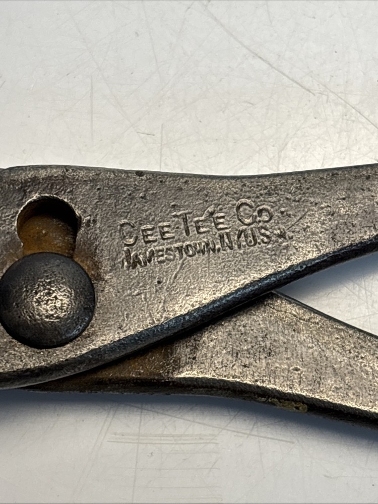 Vintage slip joint pliers marked Cee Tee Co., Jamestown NY, U.S.A. Forged steel construction with adjustable slip joint pivot and serrated jaws. Classic early American hand tool from a Jamestown, New York manufacturer known for quality forged tools. Dark aged patina from use and storage. Overall length is approximately 8 inches. Marking is clearly visible on the handle: “Cee Tee Co. Jamestown NY U.S.A.” See photos for full details of condition and markings. Condition: Used vintage condition with surface wear, oxidation, and patina consistent with age and use. Jaws and pivot operate normally.