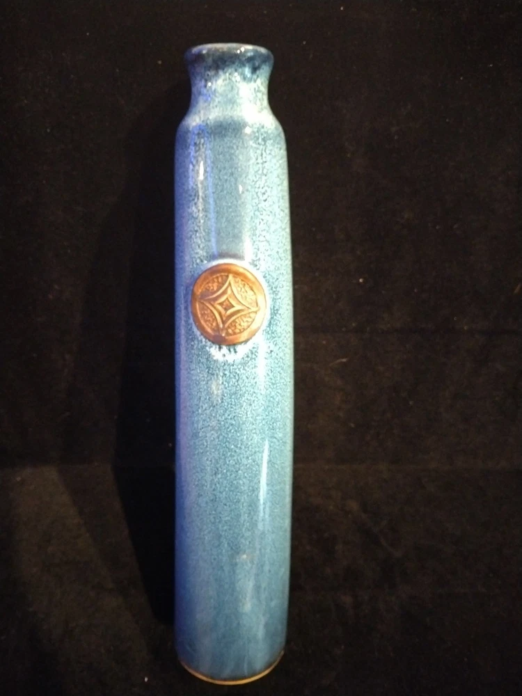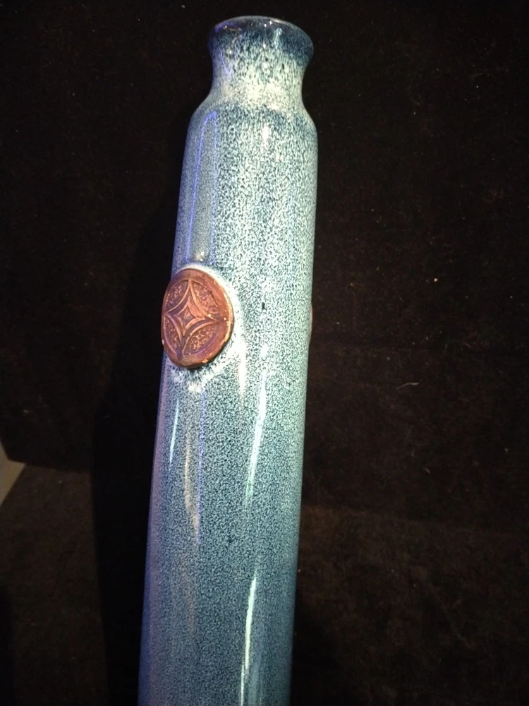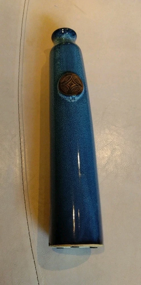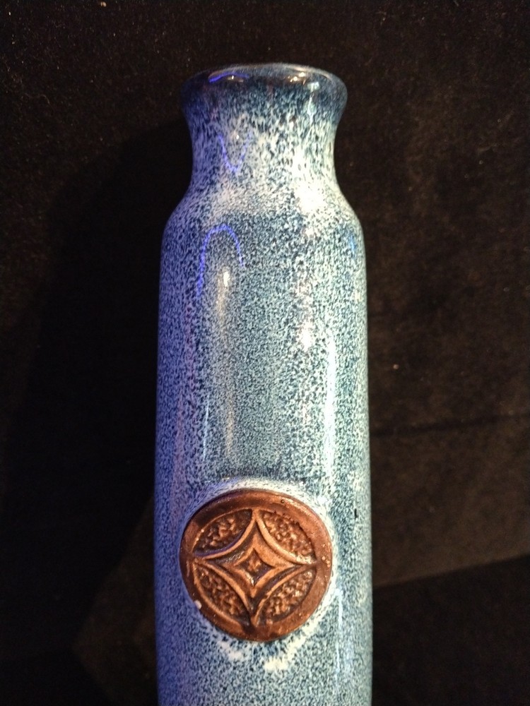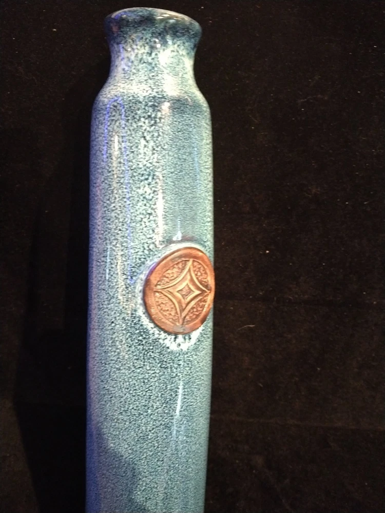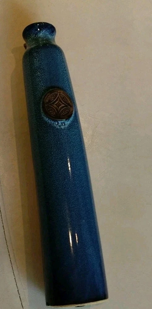 This vintage handmade ceramic vase features a beautiful glossy finish and a unique drip blue design. The vase measures 13 inches in height and 2.5 inches in width, making it a perfect addition to any room. Its arts and crafts/mission style and art pottery production style make it a unique and original piece. The vase is made of clay and is an ideal example of 1990s art pottery. Its Celtic emblem design adds to its beauty and charm. The vase is in excellent condition and is a great collector's item. Please see photos for exact condition. All offers considered.