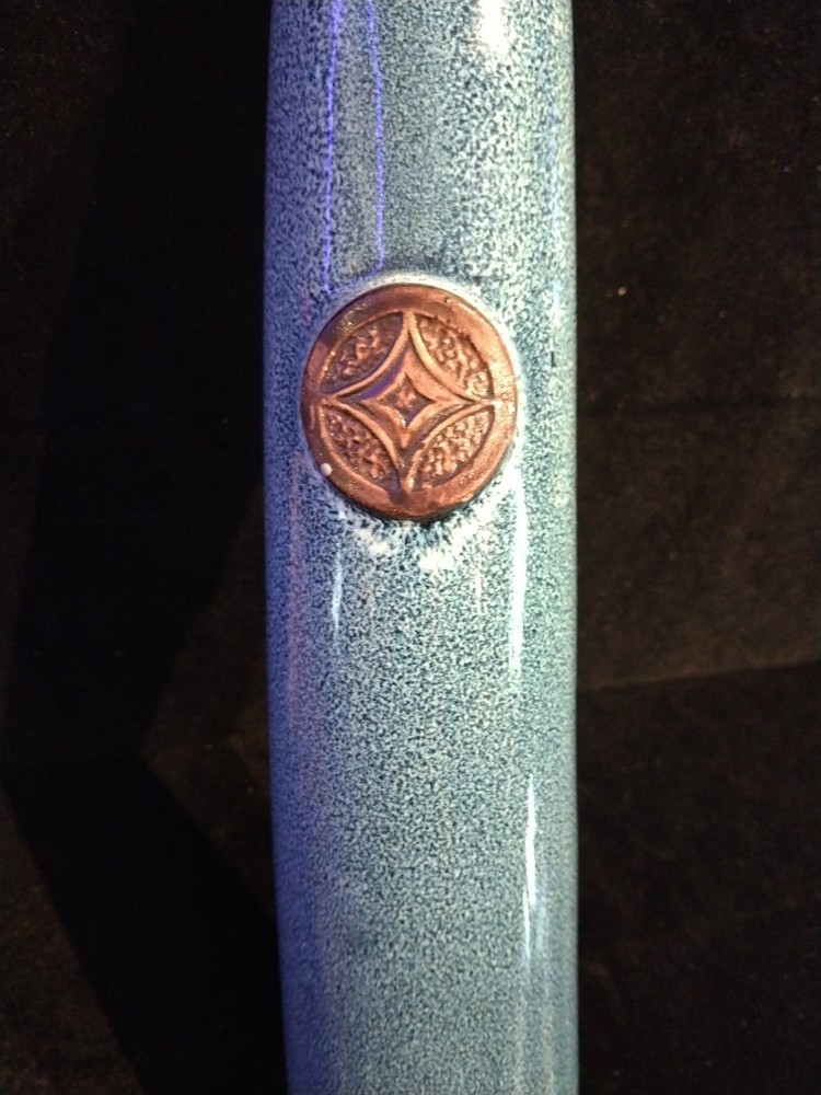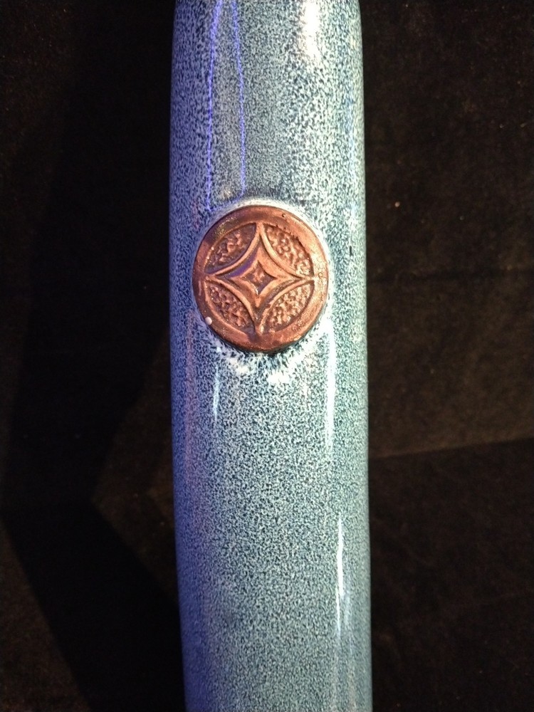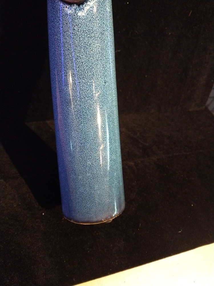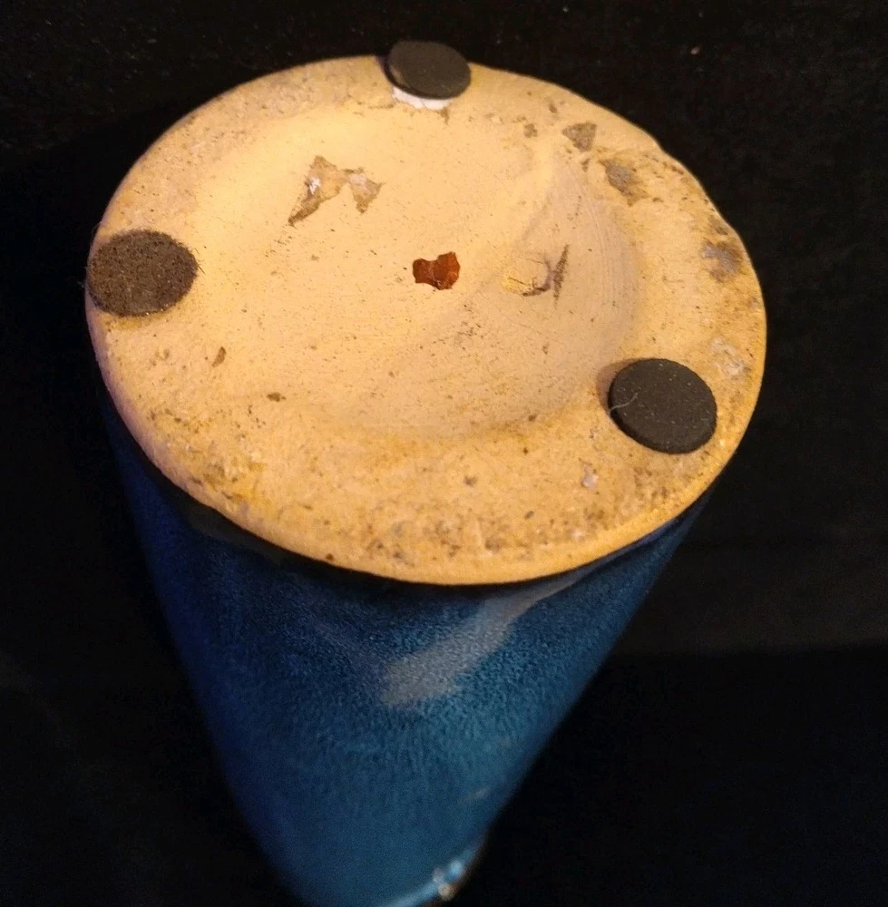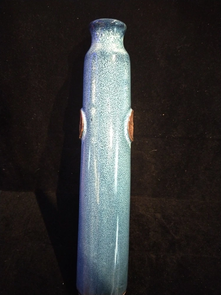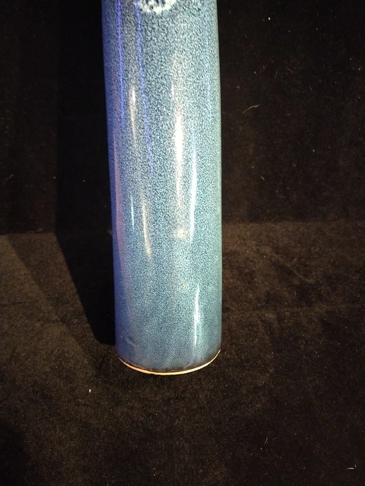 This vintage handmade ceramic vase features a beautiful glossy finish and a unique drip blue design. The vase measures 13 inches in height and 2.5 inches in width, making it a perfect addition to any room. Its arts and crafts/mission style and art pottery production style make it a unique and original piece. The vase is made of clay and is an ideal example of 1990s art pottery. Its Celtic emblem design adds to its beauty and charm. The vase is in excellent condition and is a great collector's item. Please see photos for exact condition. All offers considered.