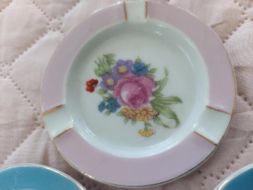 Vintage Ceramic Floral Painted & Transfer Ware Ash Trays Japan Lot 3 Shabby. These are lovely porcelain/ceramic shabby cottage ash trays that you can use for many other things; tea bag rest, spoon rest, small Hors d'oeuvres plate, trinket dish Marked Japan and painted in either blue or pink, then gorgeous transferware floral bouquets in the center, glazed Just over 3.5 inches each There are no chips or cracks. However, it is vintage, and at least a portion was handmade, so they are not perfection as a modern manufactured item would be. Happy to combine shipping. Thanks so much, and happy treasure hunting!