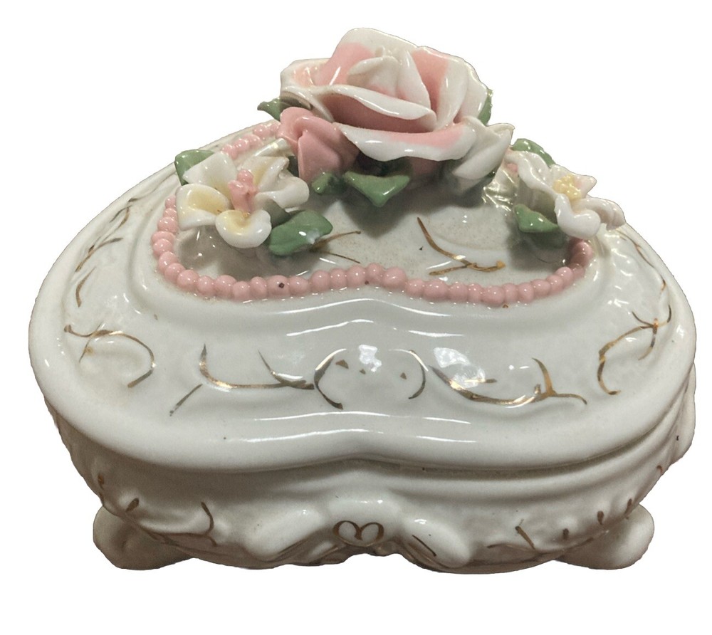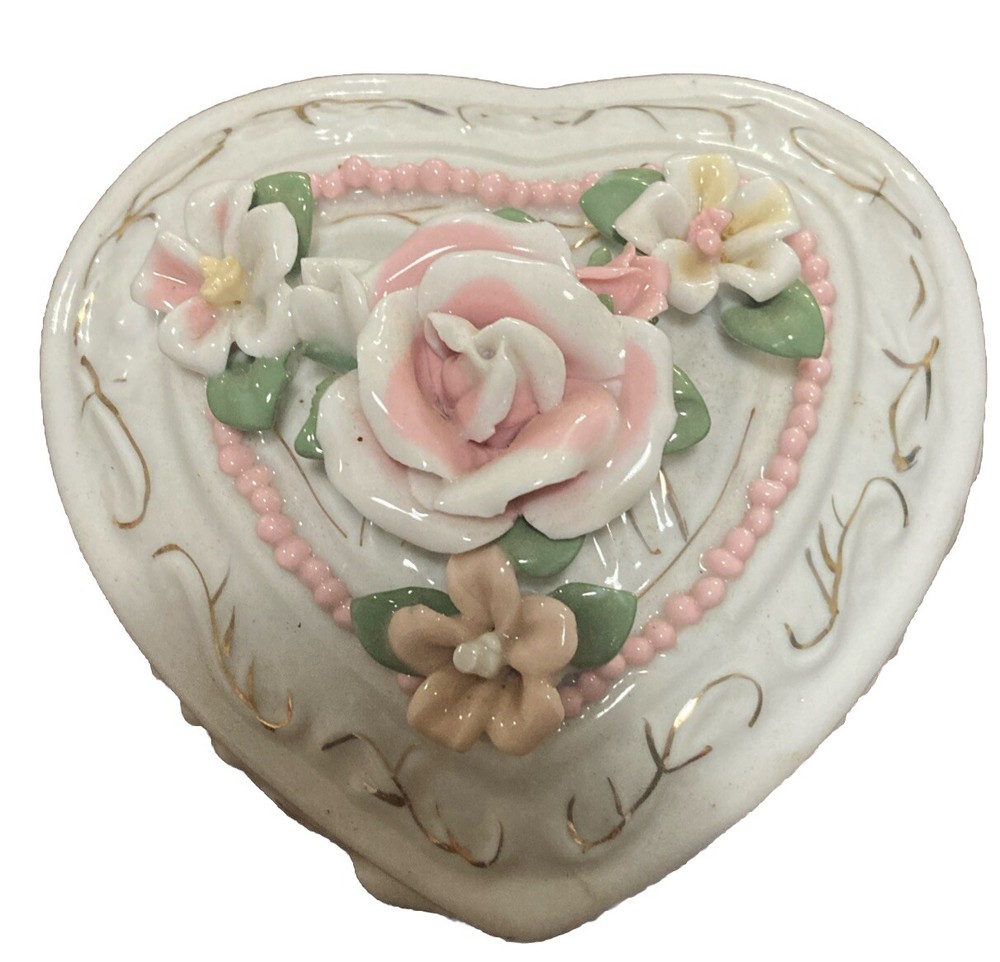 This vintage ceramic oval trinket box is a beautiful addition to any collection. The delicate roses pattern and heart shape make it a perfect gift for any occasion. The box comes with a lid and is perfect for storing small items such as jewelry or keepsakes. Measures 6” wide, 5” long, and 4.5” tall. The material of the box is high-quality ceramic, which adds to its durability and aesthetic appeal. The box is also boxed for safekeeping. The trinket box is a great collectible item, perfect for those who love boxing or decorative collectibles.