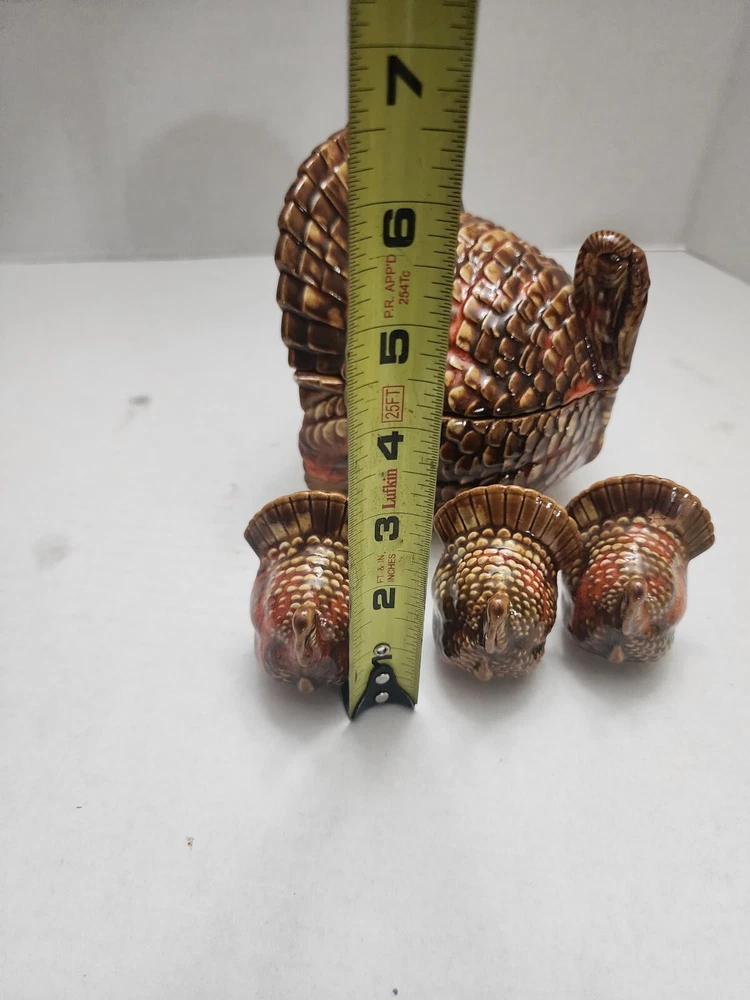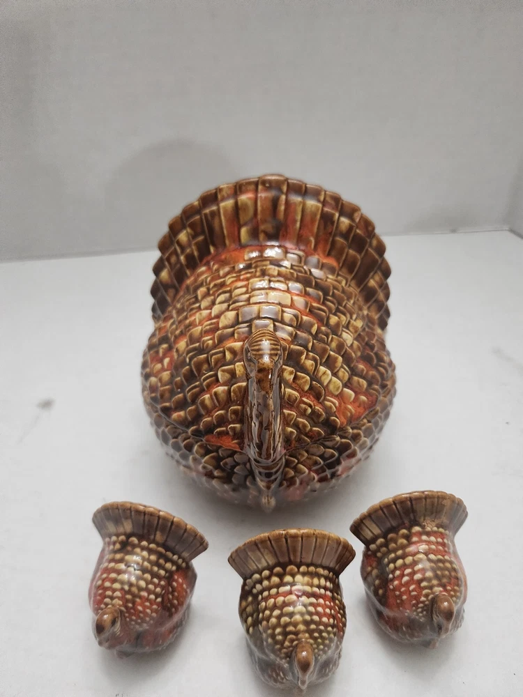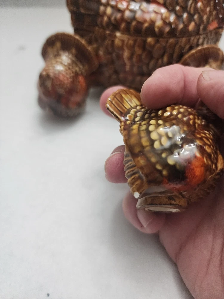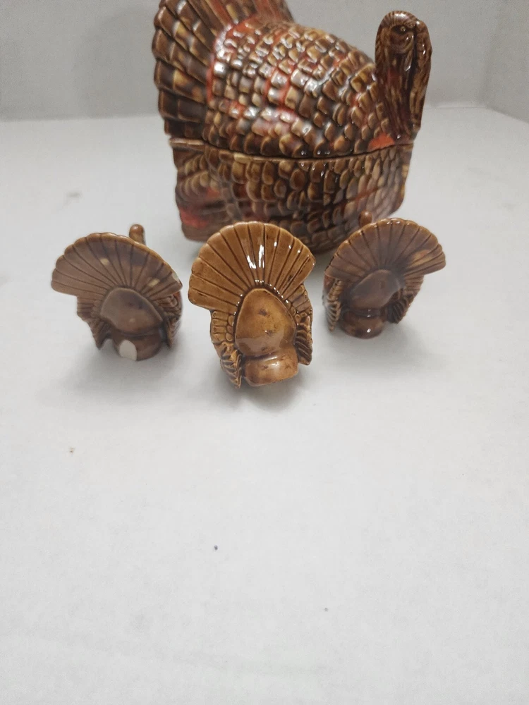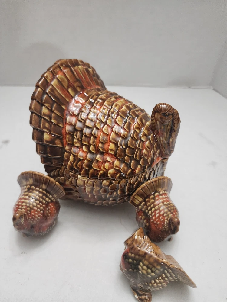 This vintage ceramic turkey lidded dish is the perfect centerpiece container for your Thanksgiving dinner. With its colorful design and handmade construction, it's sure to add a touch of nostalgia to your holiday décor. Made in the 1970s, this dish is a rare find for collectors of holiday memorabilia. Whether you're using it to serve your favorite dishes or displaying it as a decorative piece, this ceramic turkey dish is a must-have for any Thanksgiving enthusiast. Comes with 3 small turkey, 2 have small chips see photo