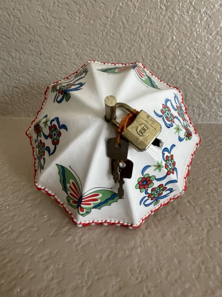 Discover a charming addition to your collection with this Vintage Ceramic Umbrella Shaped Coin Bank. Its unique design, reminiscent of Japanese culture, makes it an intriguing piece for enthusiasts and collectors alike. Crafted to resemble an umbrella, this bank serves as a functional art piece and a conversation starter. Ideal for those who appreciate the blend of functionality and aesthetics, this coin bank is a testament to the detailed craftsmanship of its era. Whether displayed on a shelf or used as a decorative element in a themed room, it is sure to be a distinctive and delightful acquisition.