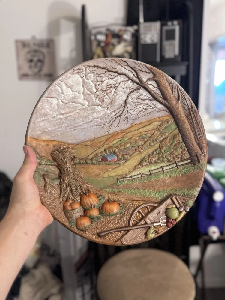 Room: Any Room Color: Multicolor Theme: Art, Pumpkin Farm Shape: Circle Style: Decorative Type: Plaque Features: Hand Painted Mounting: Hanging Vintage: Yes Subject: barn Size: Large MPN: DOESN'T APPLY Finish: Painted Material: Ceramic Brand: Decor