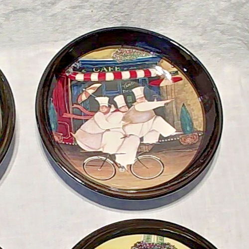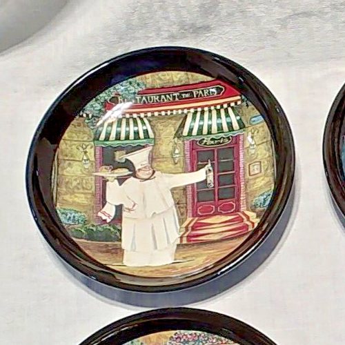 The Vintage Certified International Bistro Chef Pasta Plate set includes four 9-inch round pasta bowls made of bone china. The design features a vibrant multicolor pattern with an Italian theme, embodying a traditional style. Manufactured in 1998 by Certified International, these shiny-finished bowls are ideal for serving pasta dishes and adding a touch of charm to your dining table.