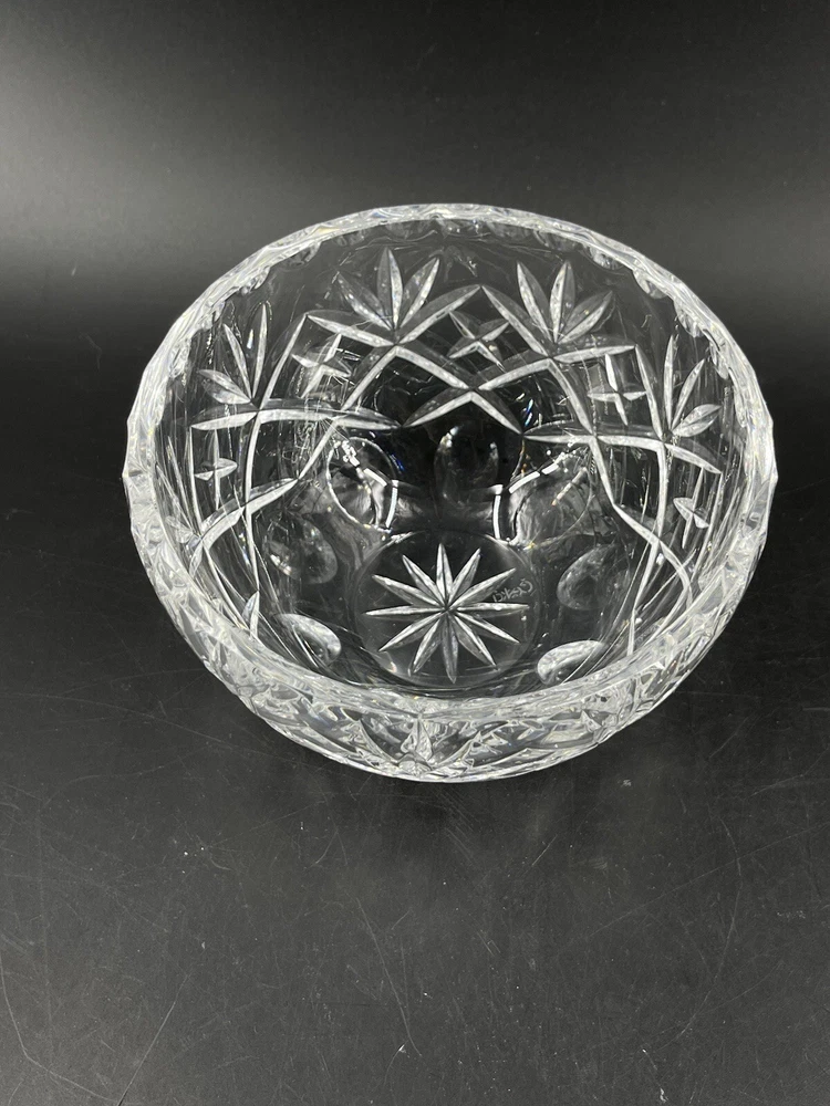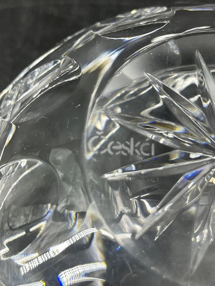 Vintage Cexkci Ceska Czech Hand Cut Crystal Bowl Diamond Stars Fans Pattern 5.75 5 3/4" diameter and 3 1/2" deep. Acid etched signed on bottom.