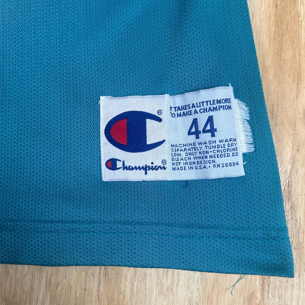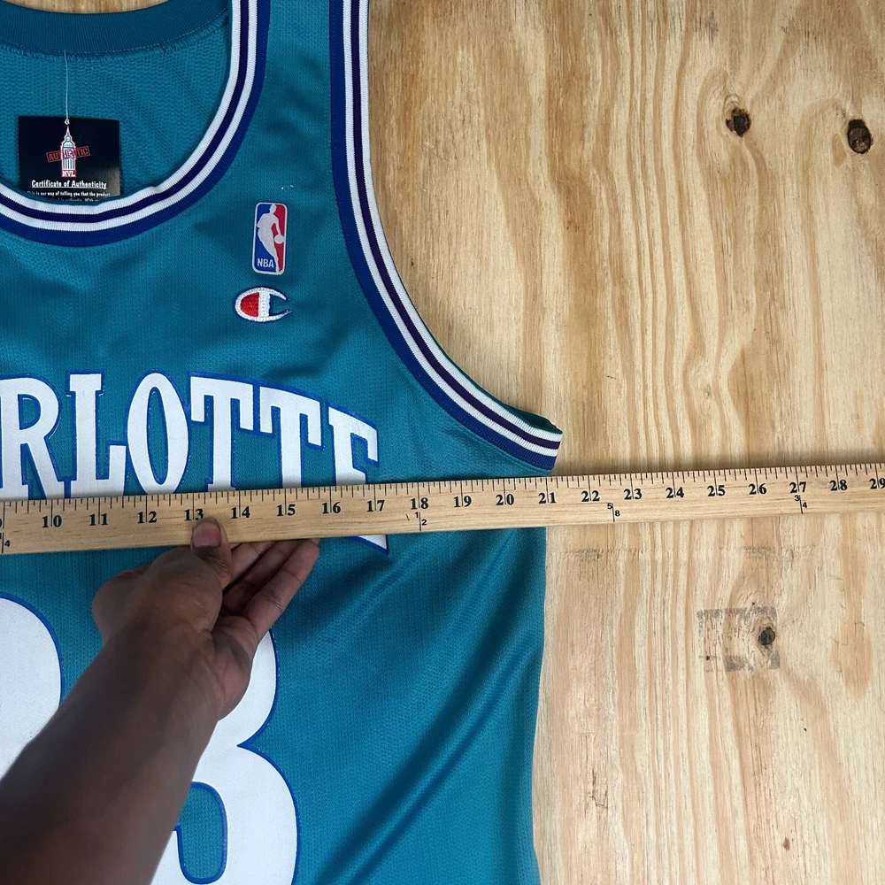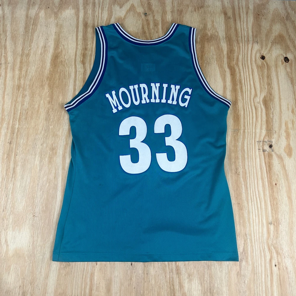 Own a piece of basketball history with this vintage Champion Charlotte Hornets Alonzo Mourning #33 jersey. This blue jersey is a size 44 and features Mourning's name and number, making it a great addition to any fan's collection. The jersey is from the 90's and is in great condition, perfect for wearing to games or displaying in a fan cave. This jersey is an official piece of NBA memorabilia and is a must-have for any basketball fan.