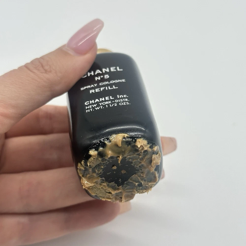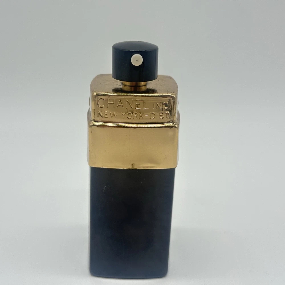 Vintage CHANEL No. 5 Spray Refillable Perfume Case Bottle – 1.5 oz Black Spray Cologne Bottle Inside Up for sale is a vintage CHANEL No. 5 refillable spray perfume case , featuring a sleek black design and a 1.5 oz cologne spray bottle inside. The inner spray bottle is affixed to the case with a tan adhesive that resembles peanut butter. The bottle is not translucent , so it's difficult to determine exactly how much perfume remains, but it does sound like there's some liquid inside when shaken. Condition: Pre-owned vintage item Adhesive visible where the bottle is attached inside the case Some perfume appears to remain, but amount is unknown Outer case and sprayer show signs of age and storage Please review all photos carefully for details and condition. Important Shipping Note: Due to the perfume content, this item must be shipped via ground transportation only , in accordance with regulations for shipping hazardous materials. Delivery may take longer than the estimated time shown by eBay.