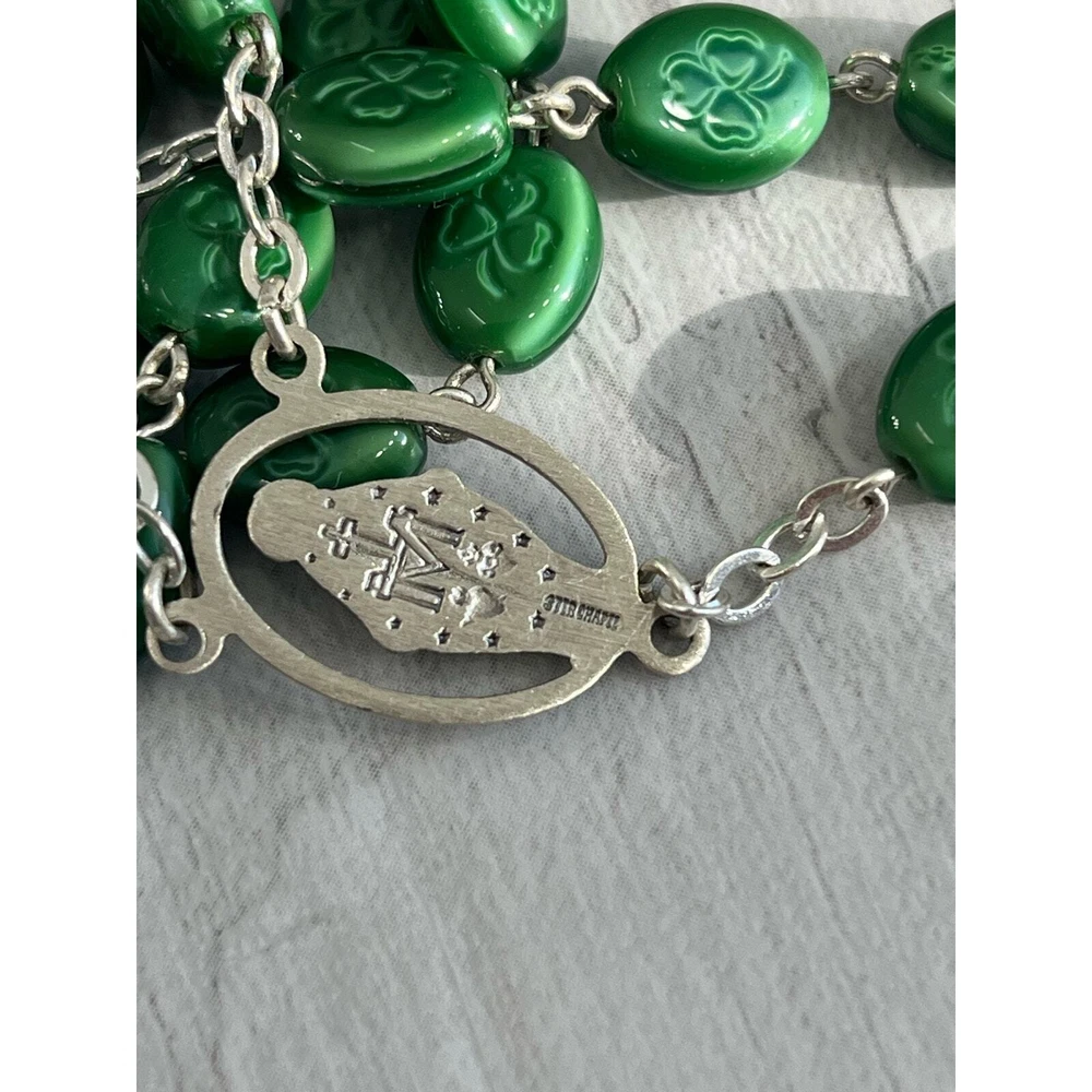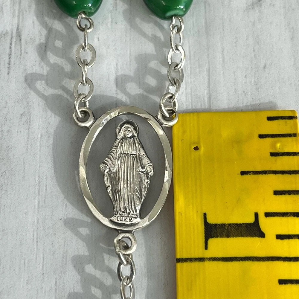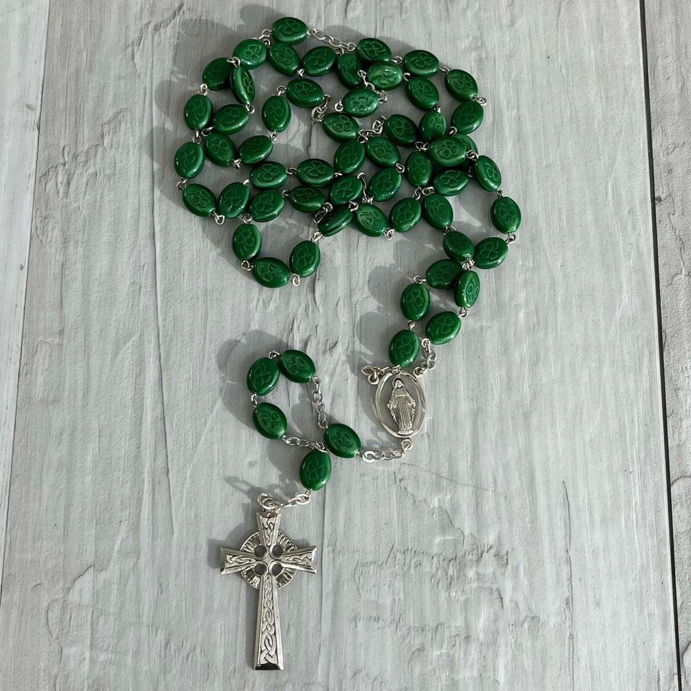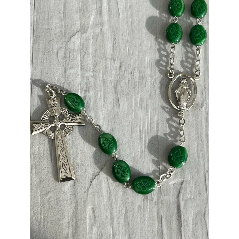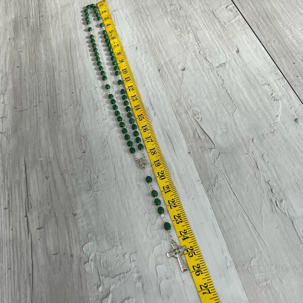 Vintage Chapel Sterling Green Shamrock Glass Bead Celtic Cross Mary Rosary Beads Length- 26" Cross length- 1.75" Additional measurements available upon request All measurements are approximate All measurements are taken with item laying flat Double bust, waist, & hip for measurement all the way around Colors may differ based on others computer/phone/etc settings All pre owned items have been washed and steamed All pre owned items have been looked over for flaws and will be noted in listing