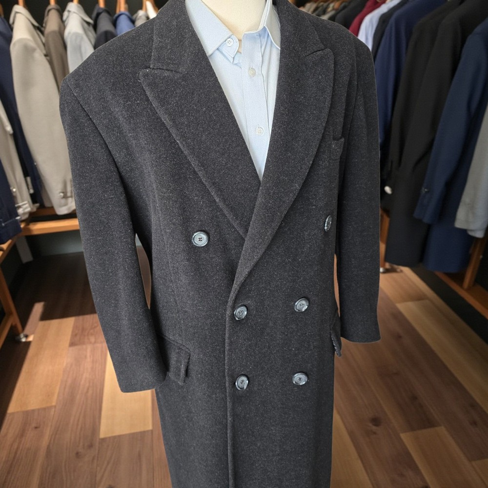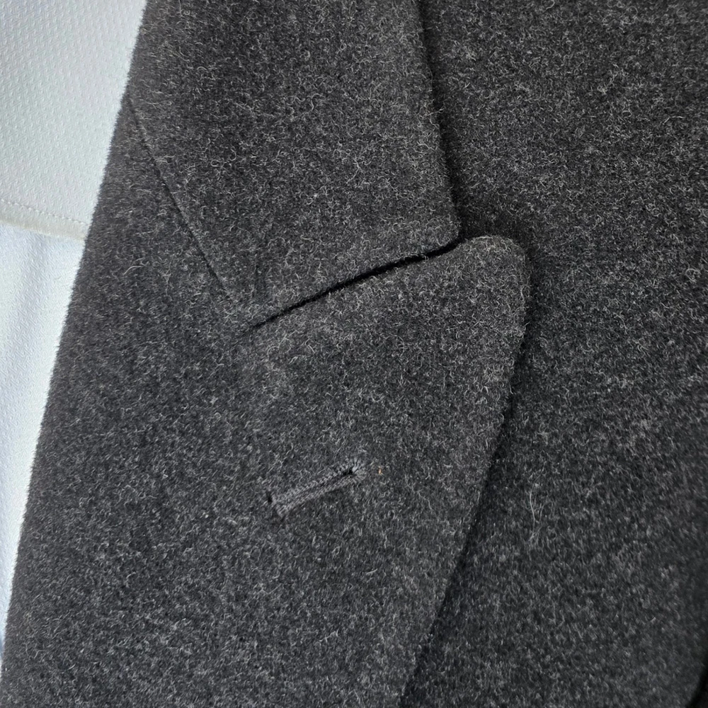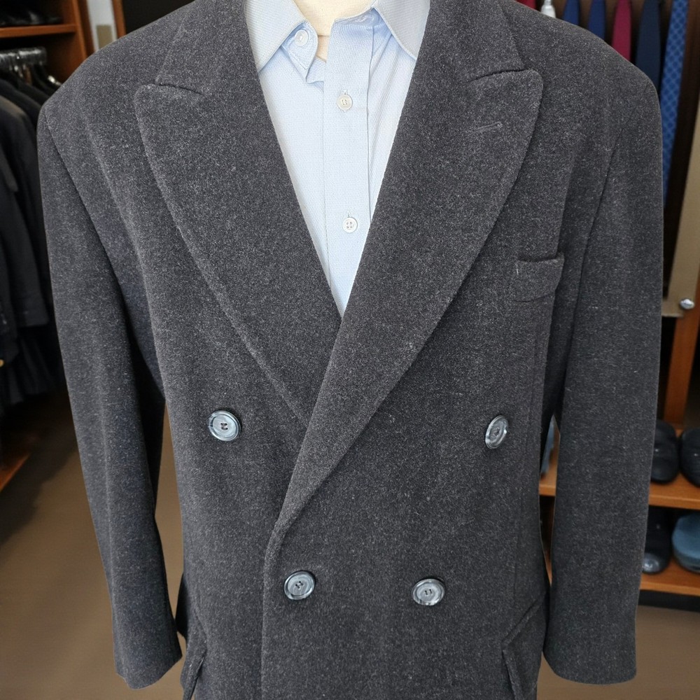 Size: 44S USA with ***24-inch arm length*** and a jacket length of 45 inches. For complete measurements, see photo #2 To see exactly how we measured, see the last series of photos. Condition: excellent vintage condition. No holes , no snags, no smells, no stains Woven in Italy, lambswool flannel, light shoulder pads, medium weight Return policy: We offer free shipping and no returns. We can not afford to offer both in the highest return category on eBay. It becomes very expensive to mail out items for free for people to try on if they are not confident in checking the measurements in picture #2. If you prefer to have the ability to return the item and pay $17.95 shipping, please send us a message, and we can change the listing format to offer returns. The $17.95 shipping cost would break us out even in the case you needed to return the item. You must contact us upfront to make sure the owner of this consigned item is OK with an option to return. We ship the next business day after the payment is made.