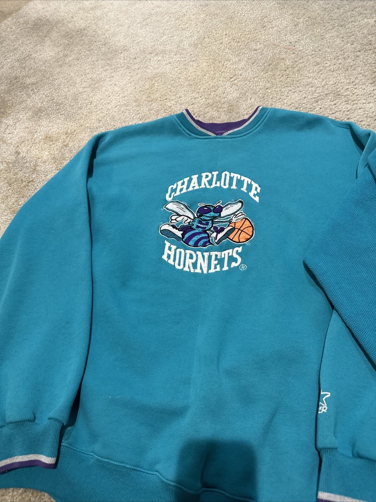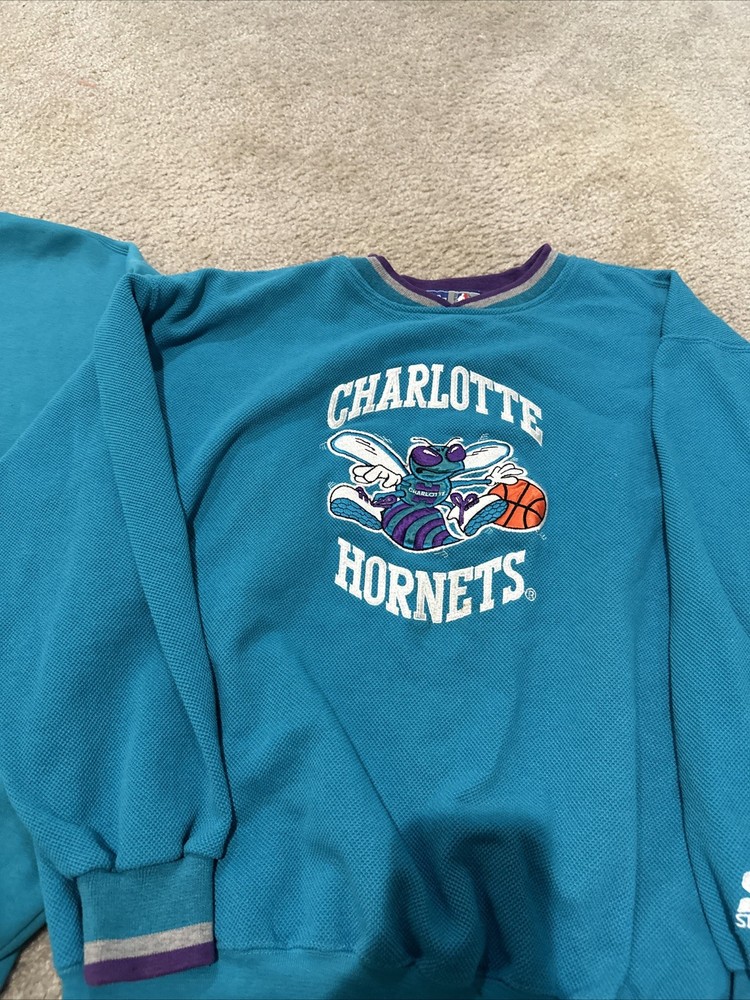 This Vintage Charlotte Hornets Starter Crewneck Sweatshirt in size XL and M is a classic piece perfect for any basketball fan. Made in the 90s, this pullover sweatshirt features the iconic Charlotte logo, representing the beloved basketball team. The blue color and long sleeves make it a stylish and comfortable addition to any man's wardrobe, suitable for both casual wear and showing support for the Charlotte Hornets at basketball games.