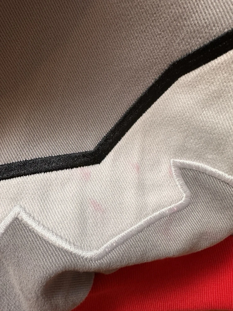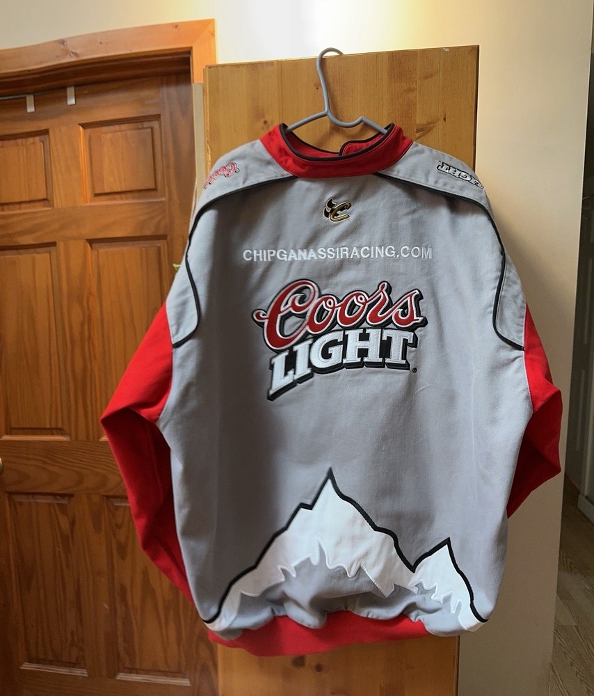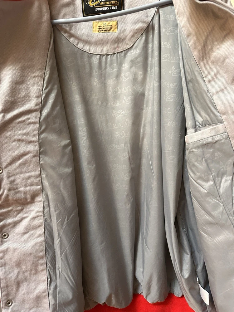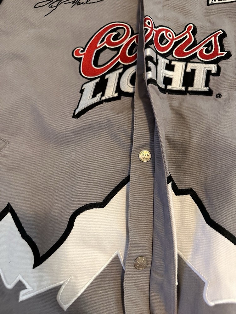 The Vintage Chase Authentic Sterling Marlin Jacket is a officially licensed NASCAR jacket featuring the driver Sterling Marlin. This 2XL men's jacket is from the brand Chase and was made in Hong Kong. It is perfect for fans of auto racing and will show your support for Sterling Marlin as a legendary driver in the sport. Made with high-quality materials, this jacket is a must-have for any NASCAR enthusiast looking to add a piece of memorabilia to their collection. Small amount of red color transfer under size label inside jacket and on mountain on back lower left of jacket.